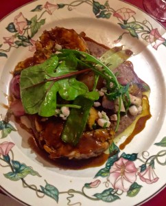 Lapin fermier d'Amélie farci au riz de camargue bio, safran bio de Venanson et calamars de la pêche niçoise, radis et pois gourmands de Danièle