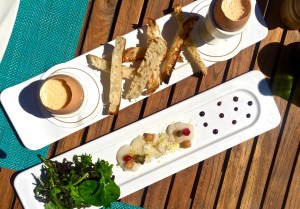 Tapas de Carpaccio de Saint-Jacques marinée aux agrumes et Oeuf de ferme mi-cuit, crème légère aux oursins et ses mouillettes
