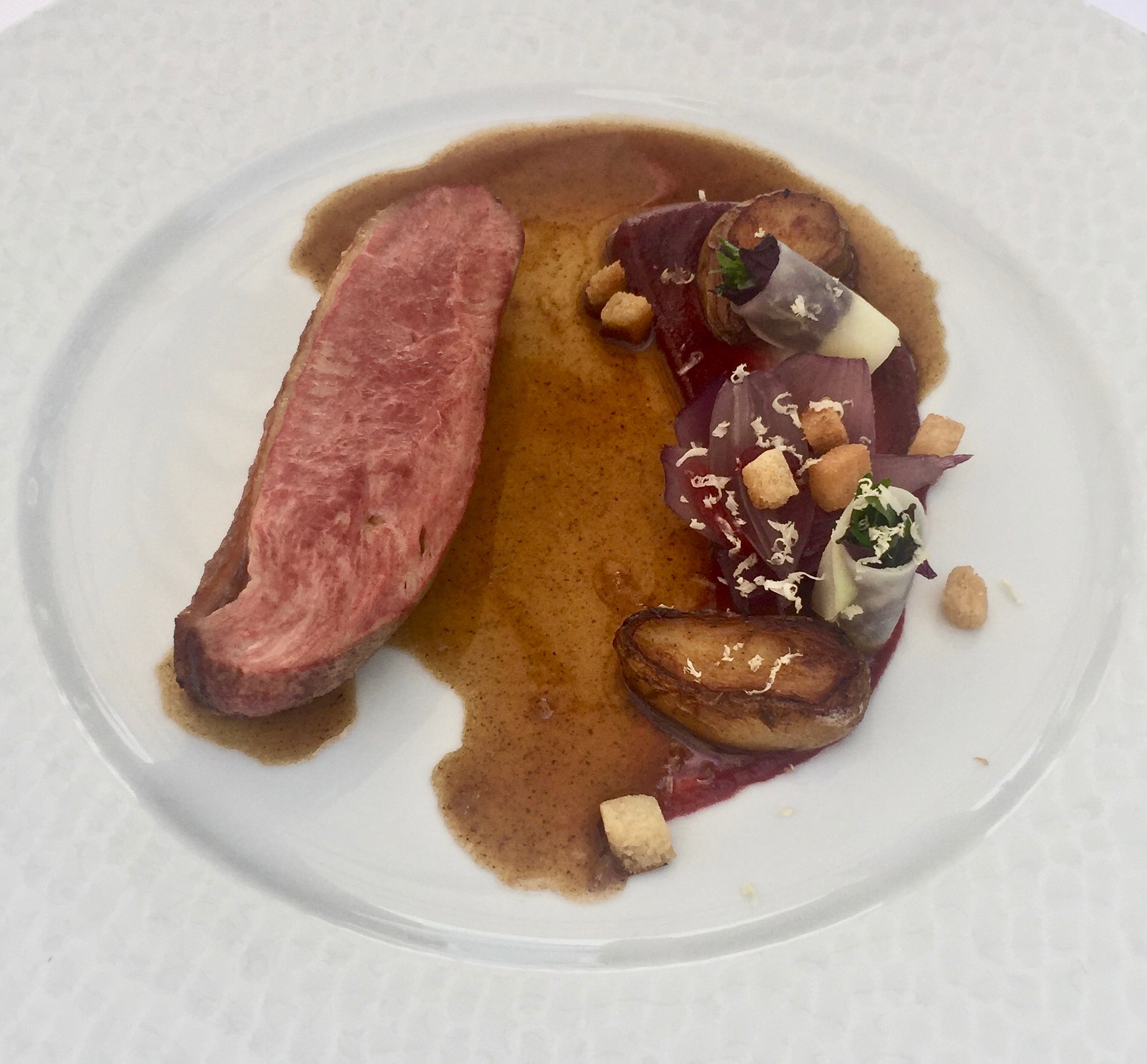 La canette rôtie, fraîcheur de shiso, crème de betterave et poire au balsamique en millefeuille d'oignons rouges ©lepetitlugourmand