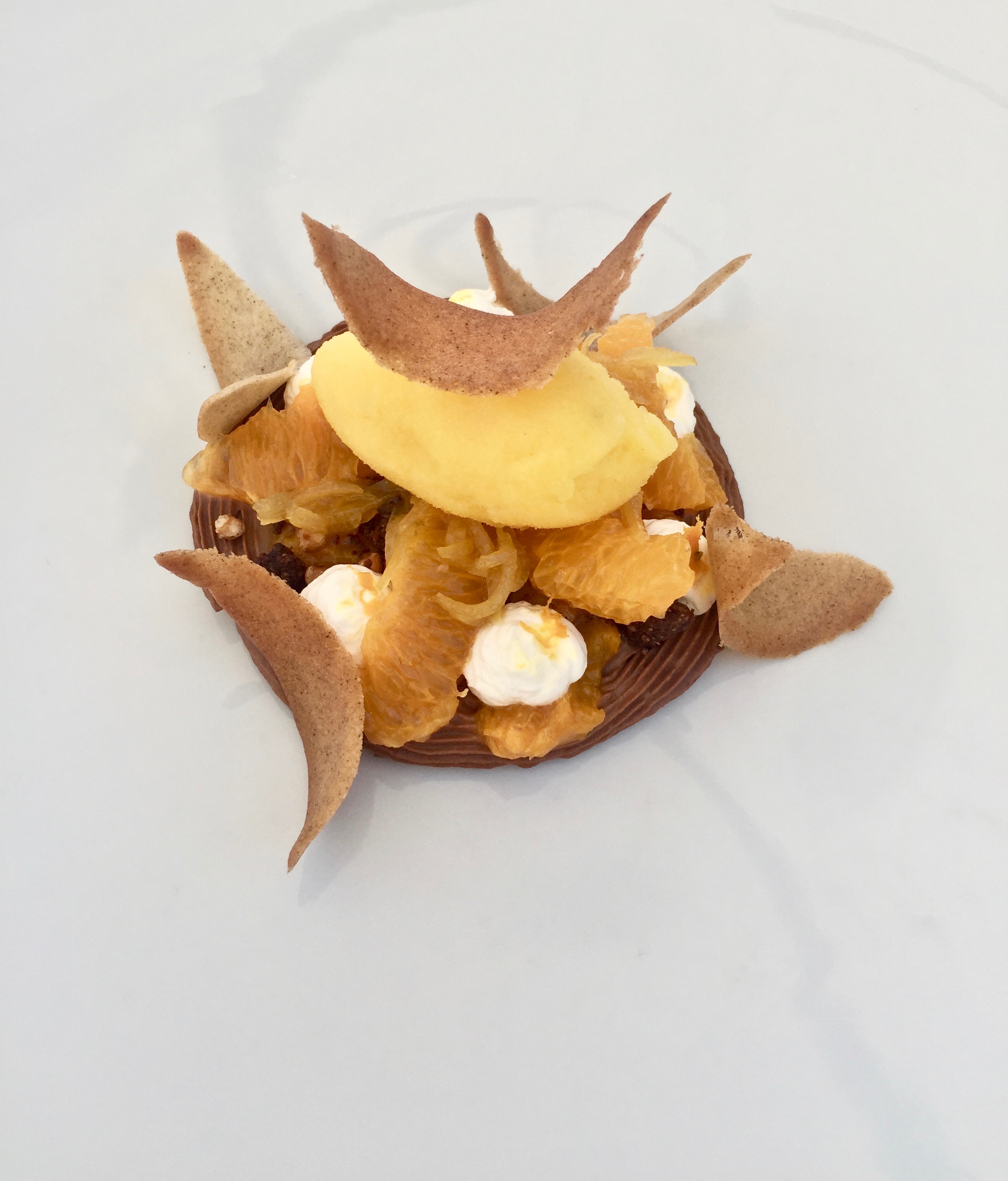 La mandarine en plusieurs états sur son crémeux de chocolat, croustillant de sarrasin et crème au whisky ©lepetitlugourmand
