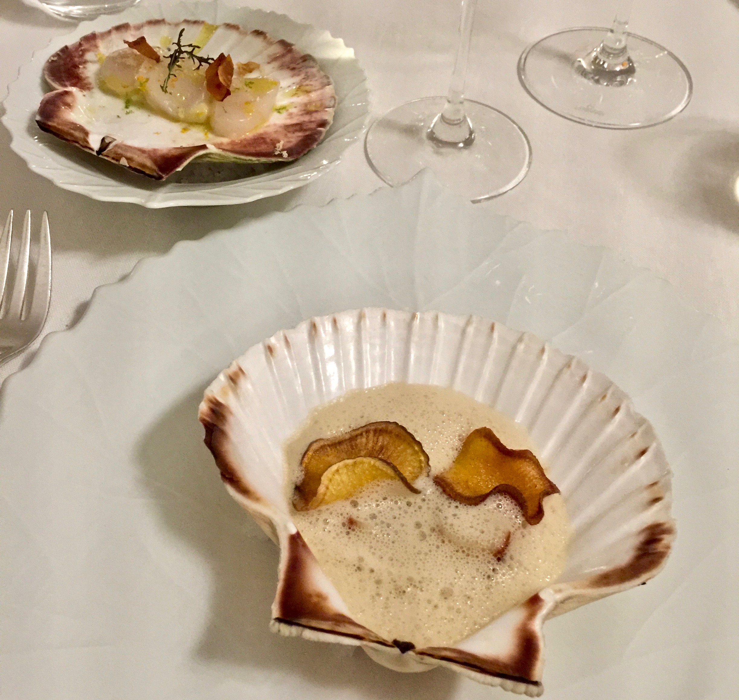 Les Saint-Jacques en duo dans leur coquille, condiment de céleri et raifort, crème de topinambours au mousseux de beurre noisette ©lepetitlugourmand
