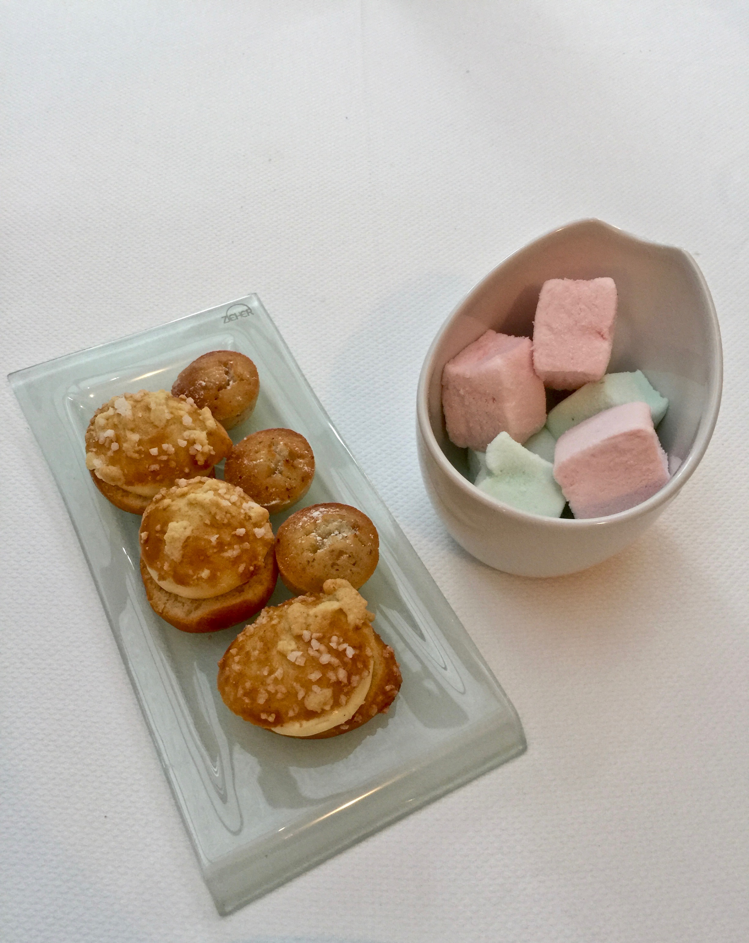 mignardises : une bouchée de Tropézienne au délicat parfum d'orange, des petits financiers et des guimauves framboise menthe ©lepetitlugourmand