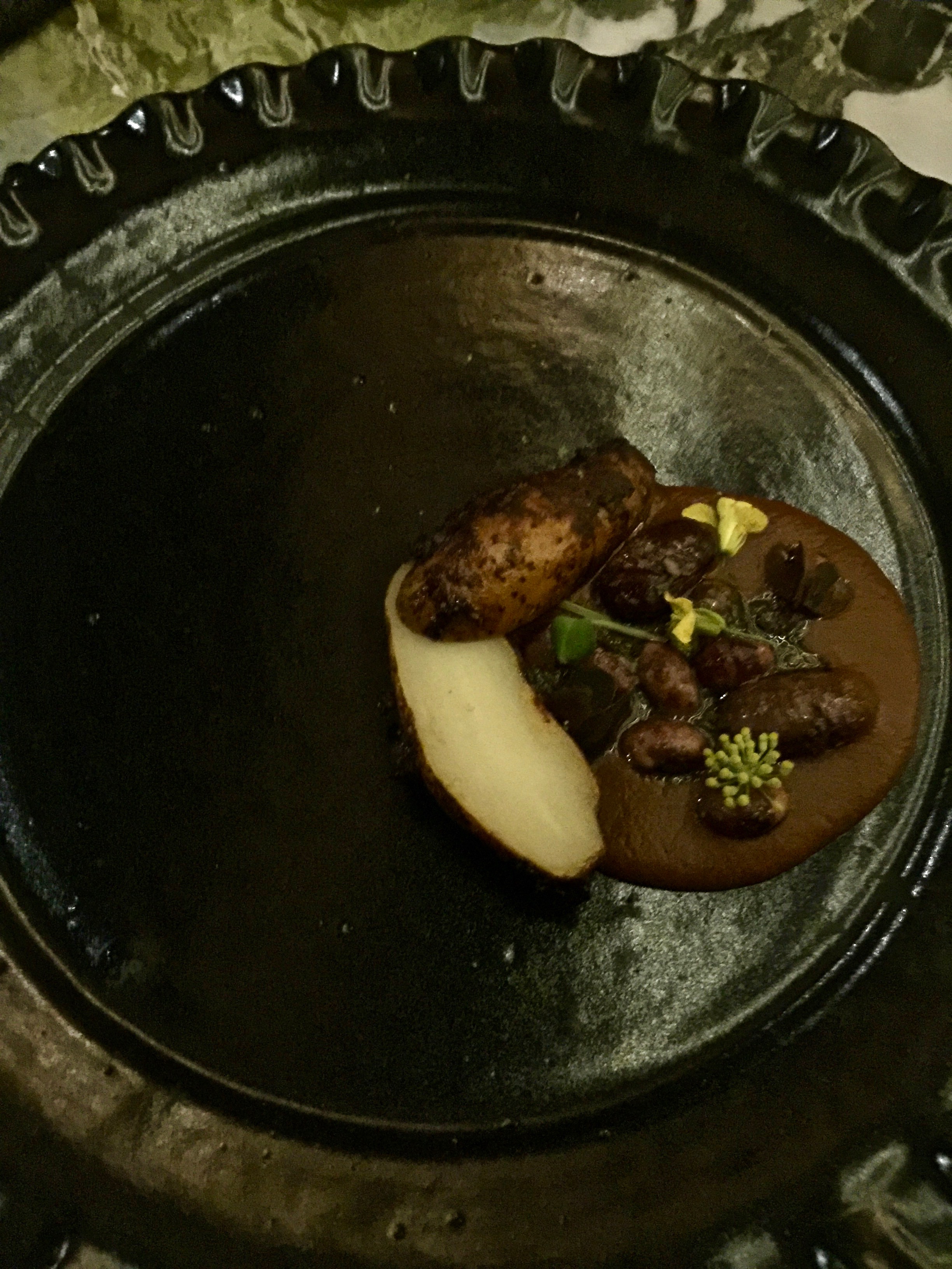 ©lepetitlugourmand Pomme de terre en cuisson " barbacoa" ( cuisson à l'étouffée de feuilles de maguey - agave ) marinée au bouillon de sauterelles avec réduction de haricots noir Ayocote et haricots Vaquita