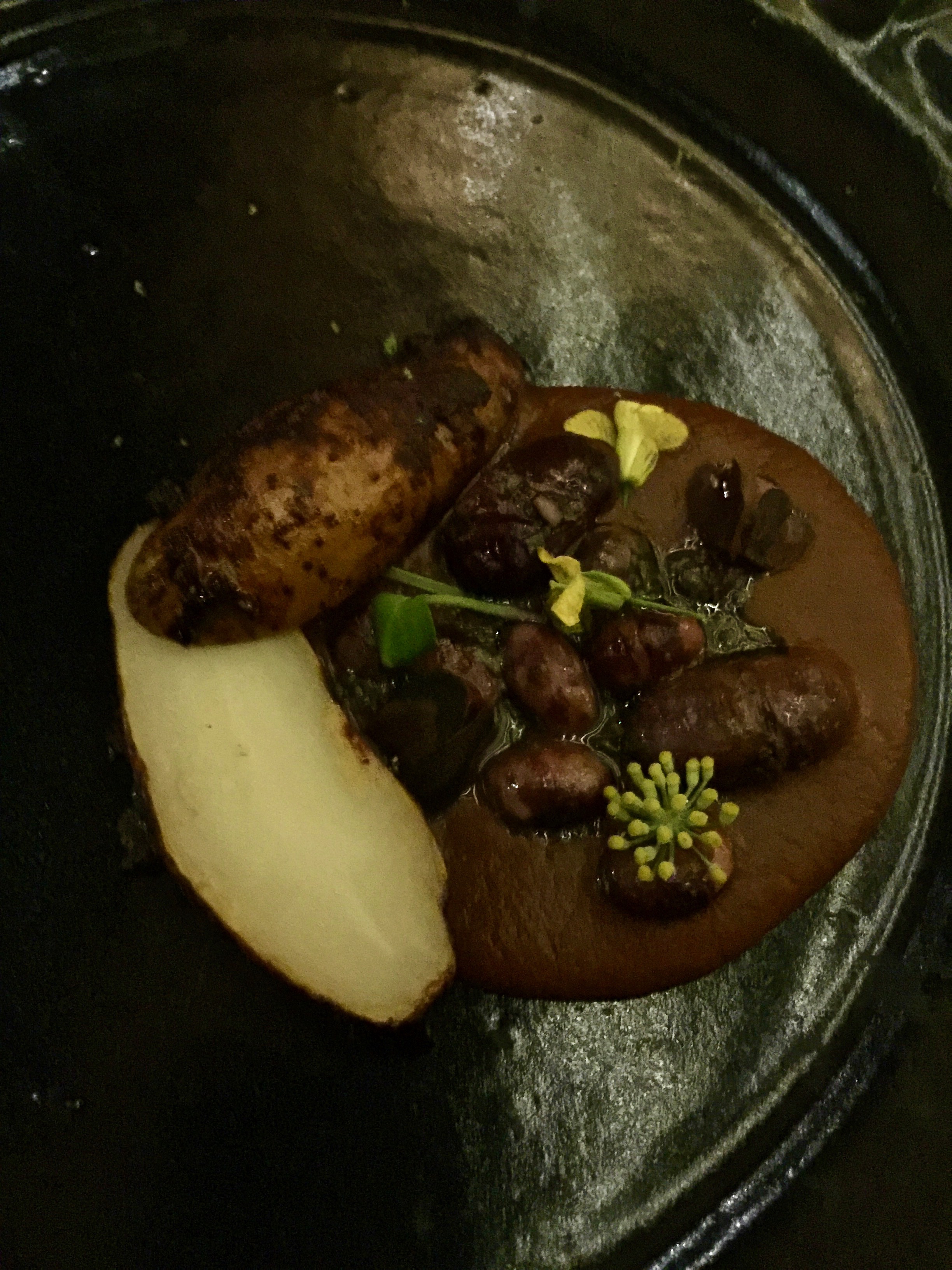 Pomme de terre en cuisson " barbacoa" ( cuisson à l'étouffée de feuilles de maguey - agave ) marinée au bouillon de sauterelles avec réduction de haricots noir Ayocote et haricots Vaquita ©lepetitlugourmand
