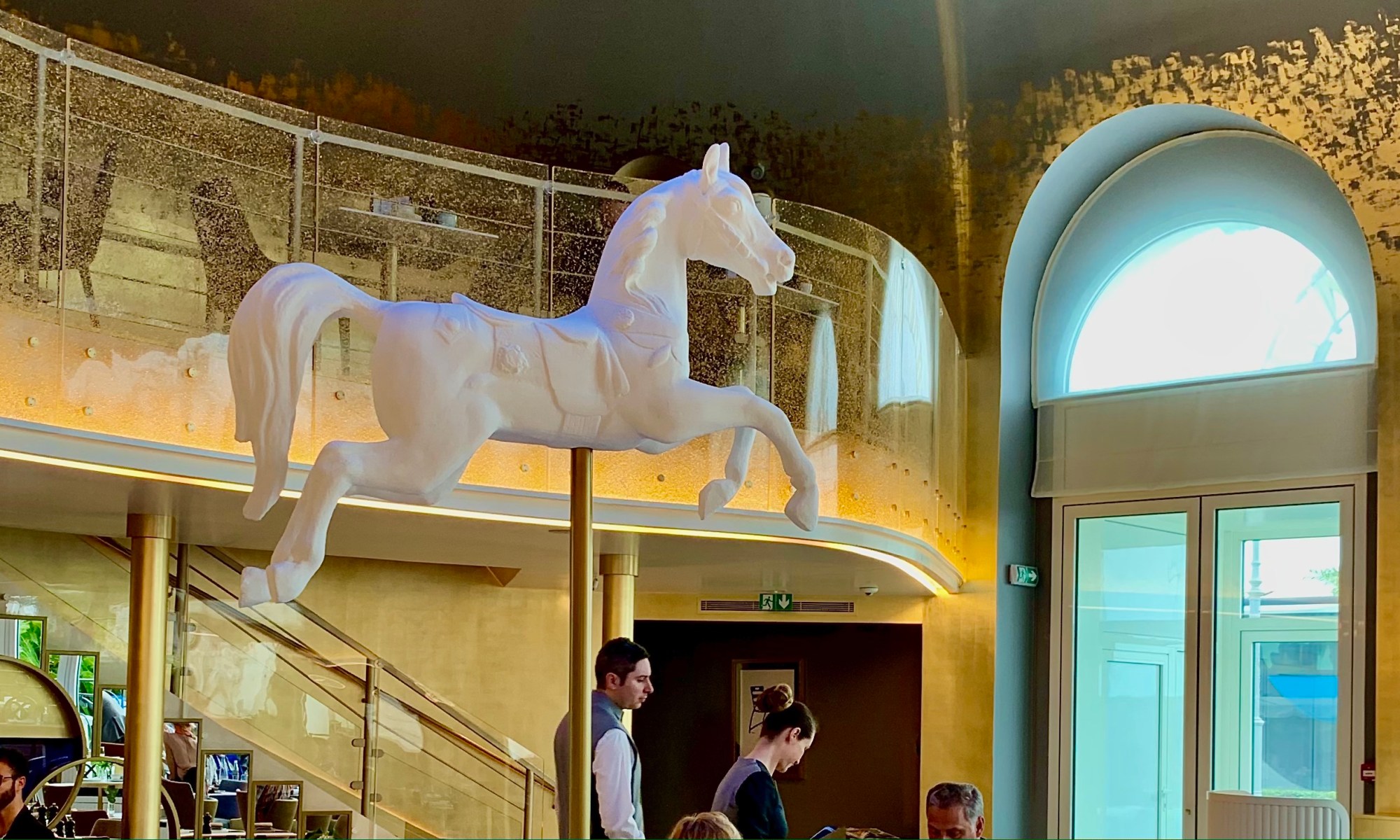 Une impression d’espace et de clarté s’offre à vous à la découverte de cette nouvelle brasserie. Une décoration sobre chic, entre l’or, le blanc et l’azur, on pourrait fantasmer et voir arriver « Peau d’Ane » en robe couleur de soleil sans étonnement. Des tables centrales et presque en mouvement du manège, sous la bienveillance d’un cheval de bois, se déploient en fonction des besoins ( pour le buffet du petit-déjeuner ou en tables individuelles et banquettes communes ).