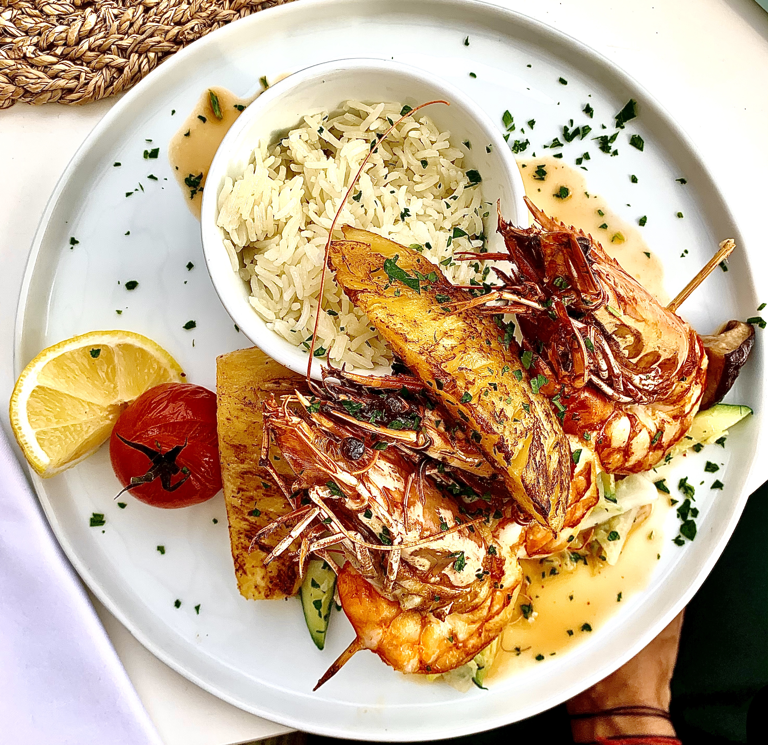 Gambas en brochette, Ananas rôti au poivre Timut, vinaigrette miel -piment d'Espelette ©lepetitlugourmand