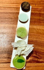 Mignardises : Basilic / Sauge- fleur de lait / Mélisse / Dés de chèvre, crème de capucine et Chocolat romarin ©lepetitlugourmand