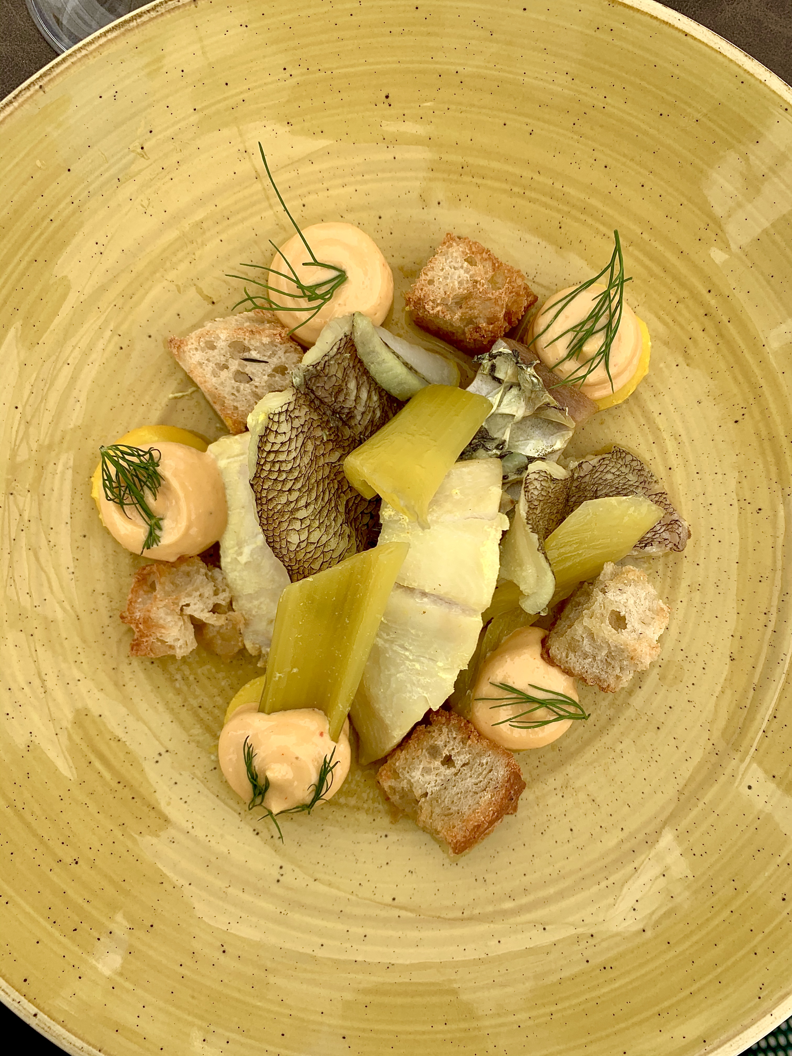 Poisson du jour de Steeve préparé comme une bourride : toute la Provence d’une soupe onctueuse au fumet de poisson épaissie d’une brunoise de légumes à l’aïoli. La Méditerranée enchantée d’une assiette iodée à la pointe anisée de fenouils braisés, le condiment rouille posé sur son galet de pomme de terre ravive le tout dans une douceur pimentée.