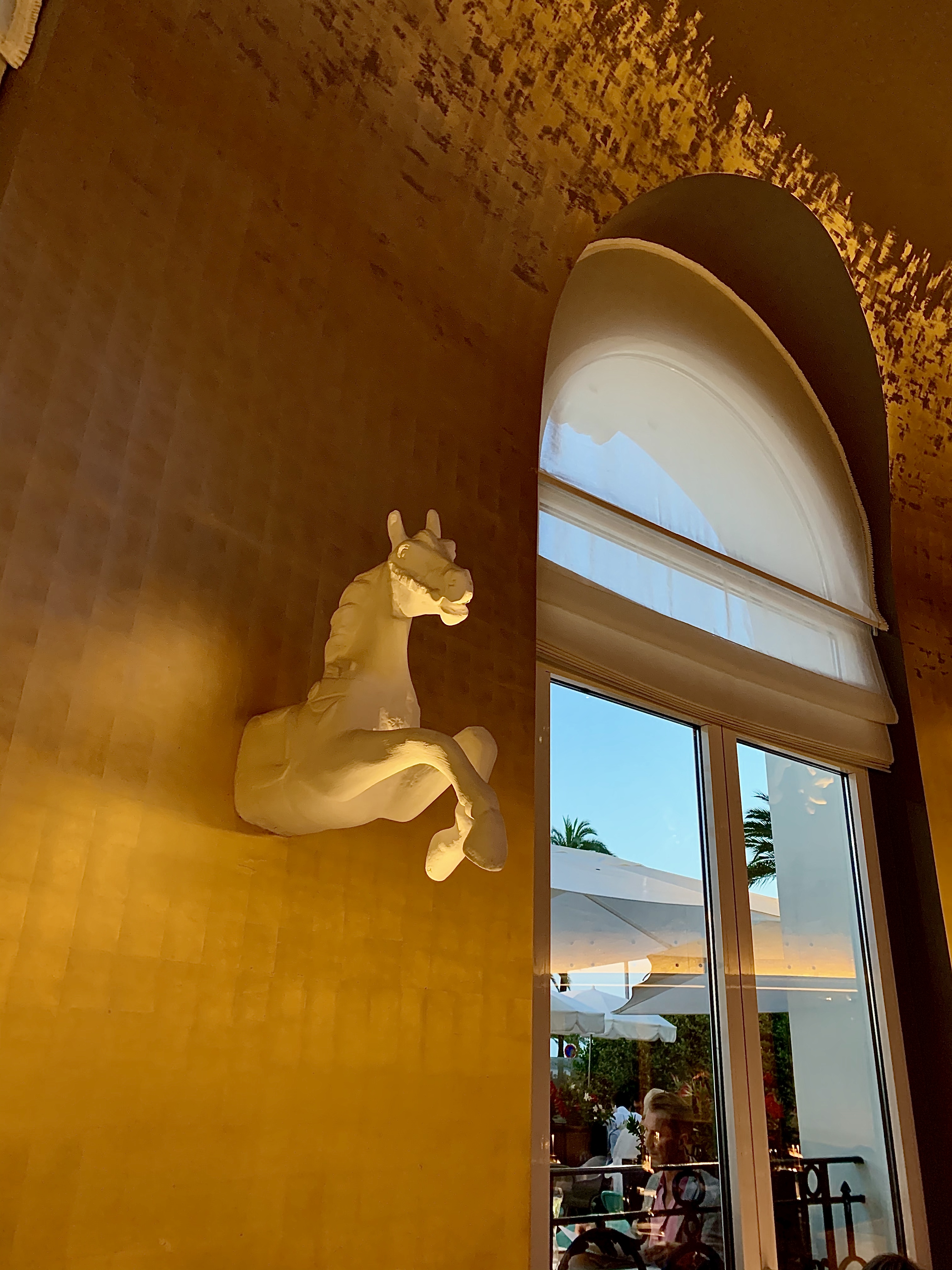 Le soir venu, la lumière tamisée et maîtrisée est celle des adresses chic et contemporaines qui promettent un dîner romantique et gastronomique. C’est une autre et belle atmosphère, quasi onirique, qui s’offre à vous : sous le ciel étoilé à la fraîcheur scintillante de la terrasse ou dans la salle inspirée d’un carrousel aux lignes pures, sortant tout droit d’un conte de fée où les chevaux figés dans la cloison, tels des candélabres, cadencent de leurs ombres les murs sertis de feuilles d’or. Le plafond virtuel changeant aux couleurs du temps renforce cette impression d’enchantement… Un délicat « Bienvenue à La Rotonde » vous rappelle en douceur que vous êtes bien au Negresco et que commence alors votre découverte du nouveau menu dégustation : « l’Envol des Sens ».