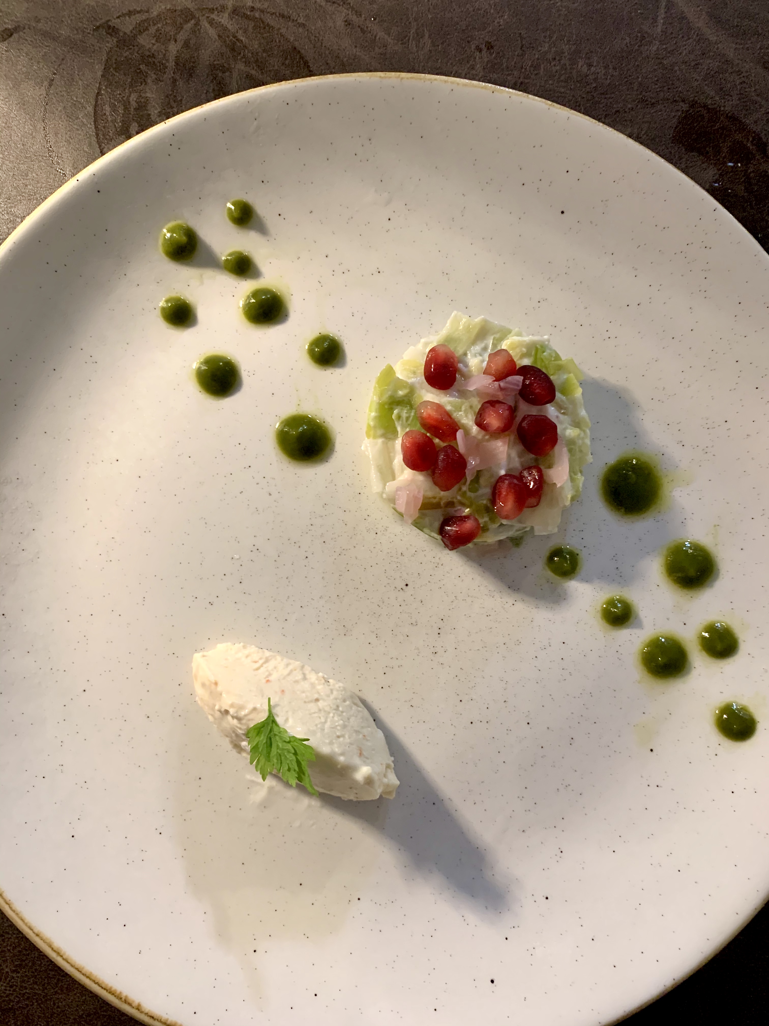 Les Jeunes poireaux d’Agnès, fromage frais et grenade : les poireaux sont fondants et enrobés en rondeur d’un fromage de chèvre frais, les pickles et la grenade apportent une acidité bienveillante. Une fois la vinaigrette versée, l’assiette se transforme en une véritable palette de couleurs vivantes appétantes et intenses en bouche.