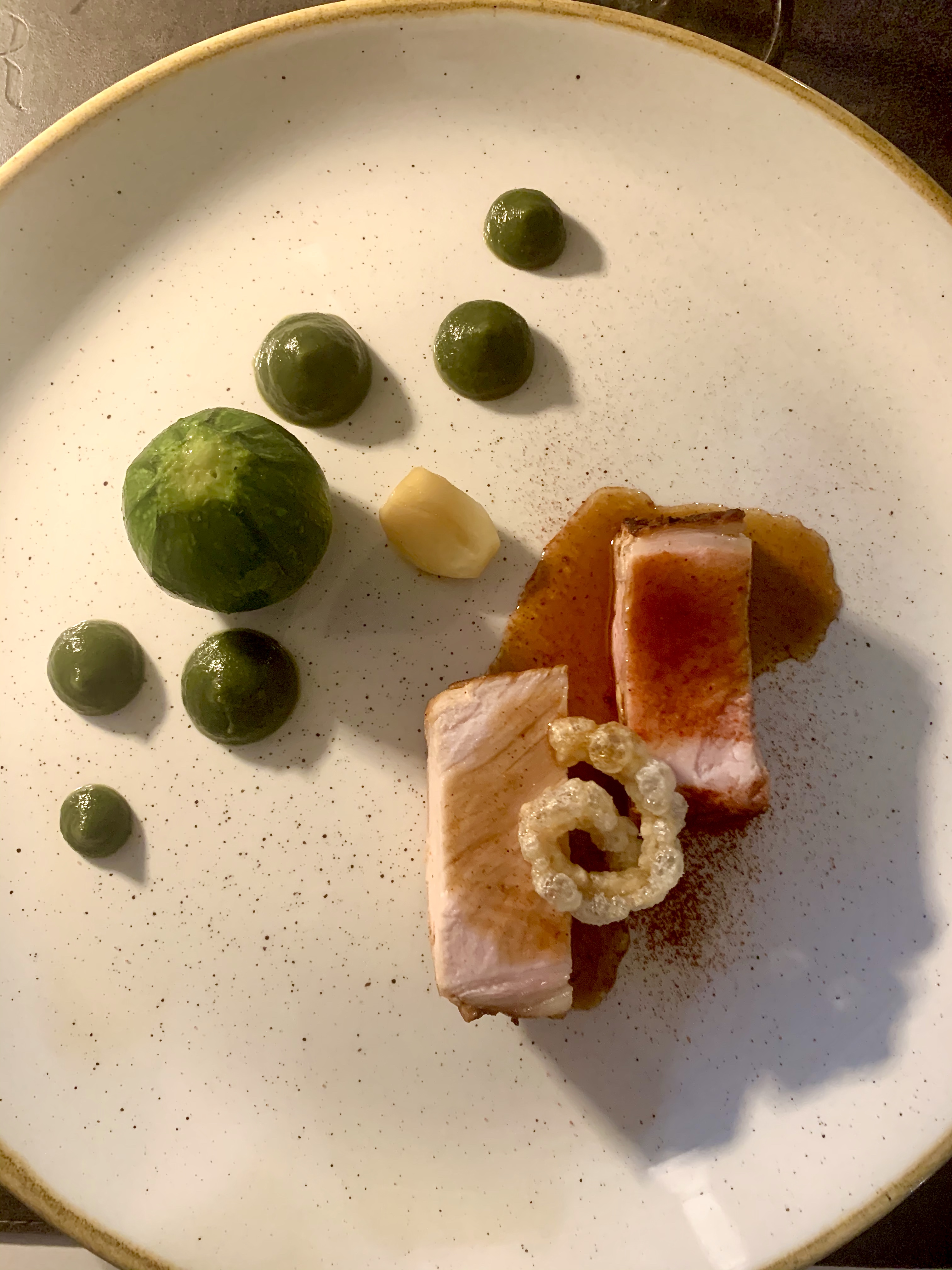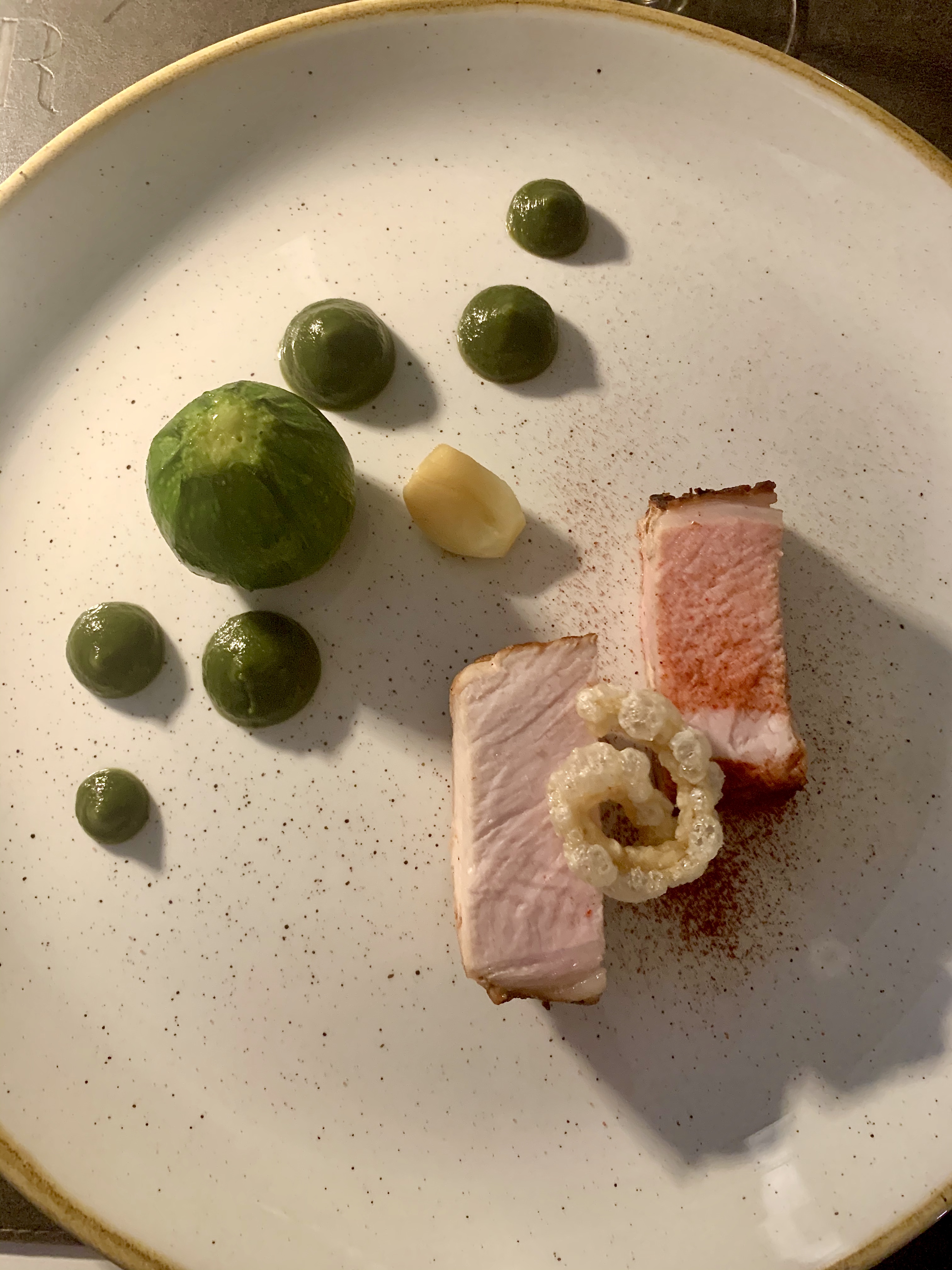 Le Cochon fermier de race ancienne « Prince des Papilles » au Tandoori, courgette farcie au boulgour et basilic est une assiette qui vous emporte dans différentes contrées du monde. Le cochon est fondant et moelleux ravivé de son jus, la peau frite et croustillante rappelle le Chicharrón mexicain qui vient donner une texture stimulante. La courgette farcie au boulgour et aux herbes et les épices Tandoori sont l’exotisme oriental. Le condiment basilic rassemble le tout vers la terre.