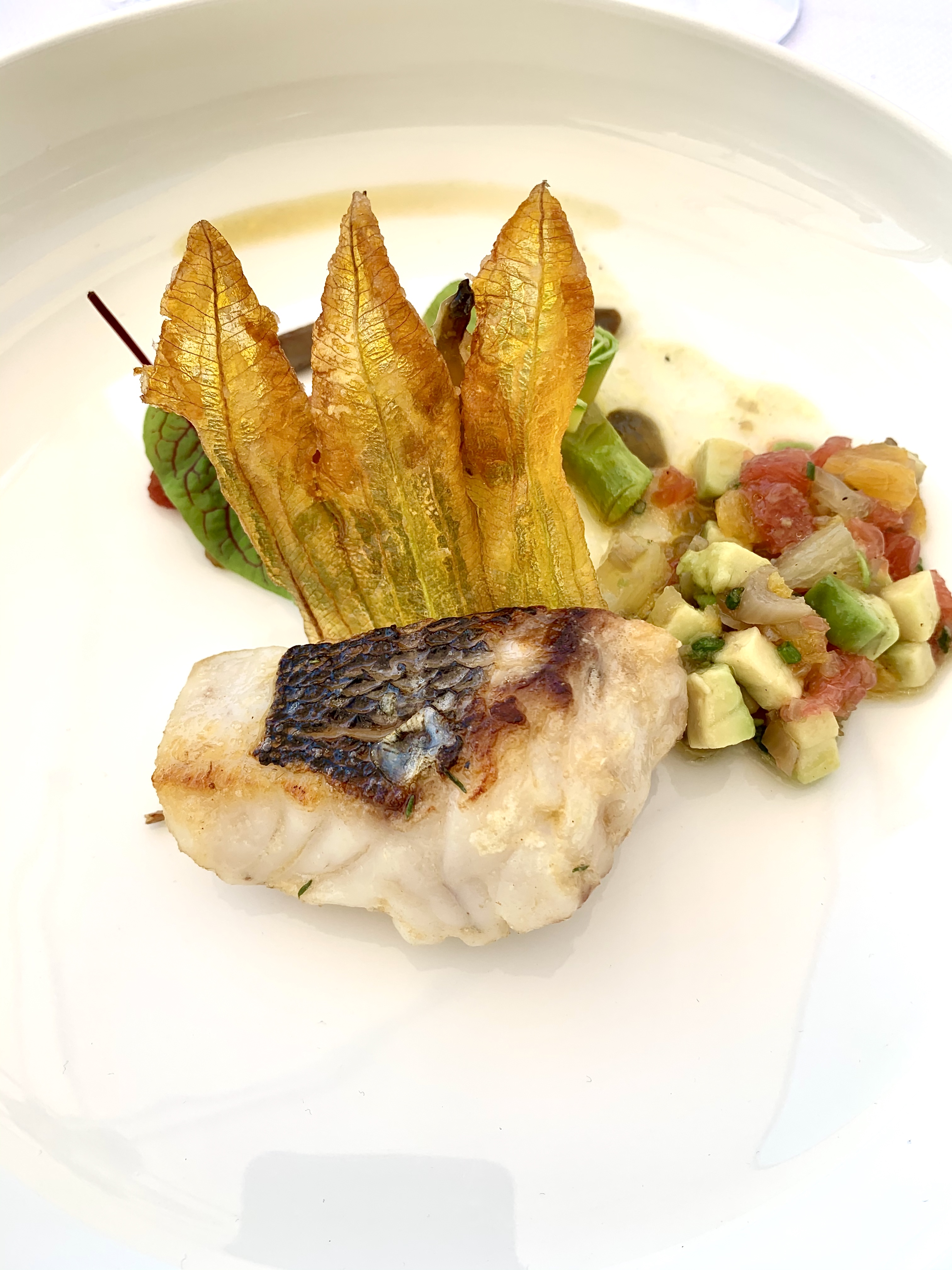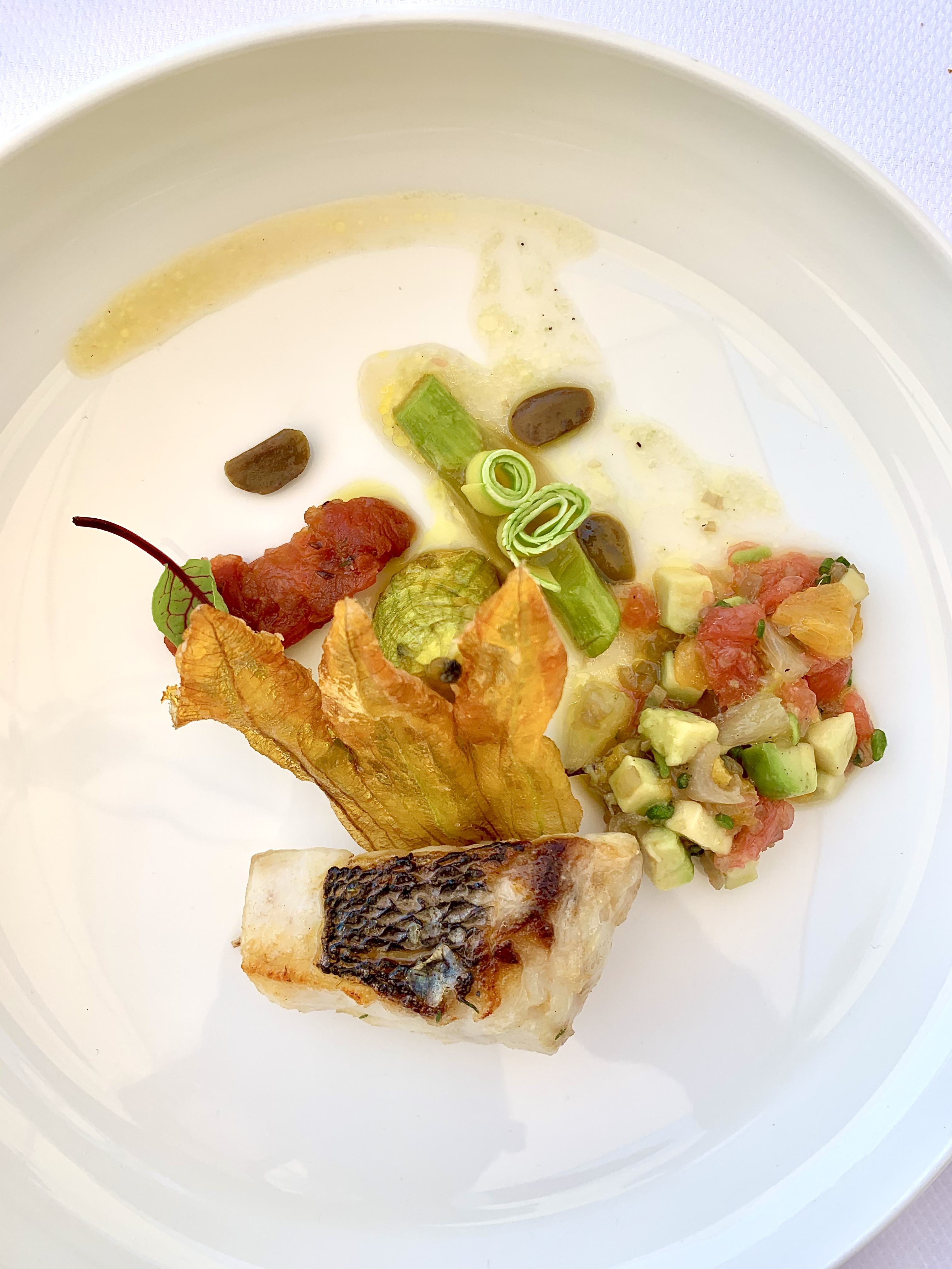 Denti sauce Vierge aux agrumes et Courgette fleur : le denti, poisson à la chaire ferme, est vibrant d’une saveur intense de sa cuisson parfaite, la fleur de courgette pétrifiée de beauté en transparence donne de son craquant et la sauce vierge agrumes (orange, pamplemousse et citron) percute avec justesse et persévérance de sa fraîcheur pour une belle longueur en bouche. La courgette citronnée à cru au gel de citron fait vibrer les sens. Une assiette ludique et dynamique où il est bon de partager ses découvertes et émotions suivant les combinaisons de goûts.