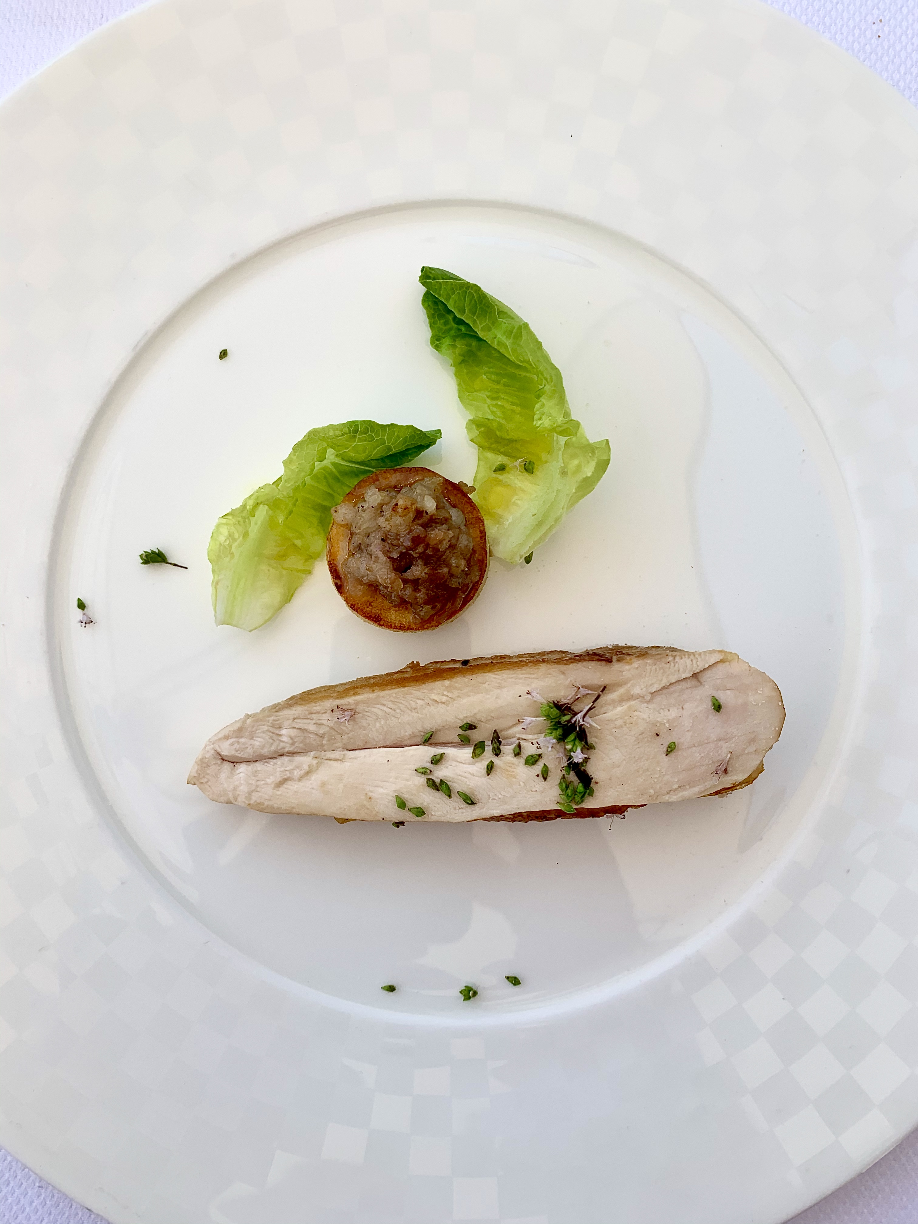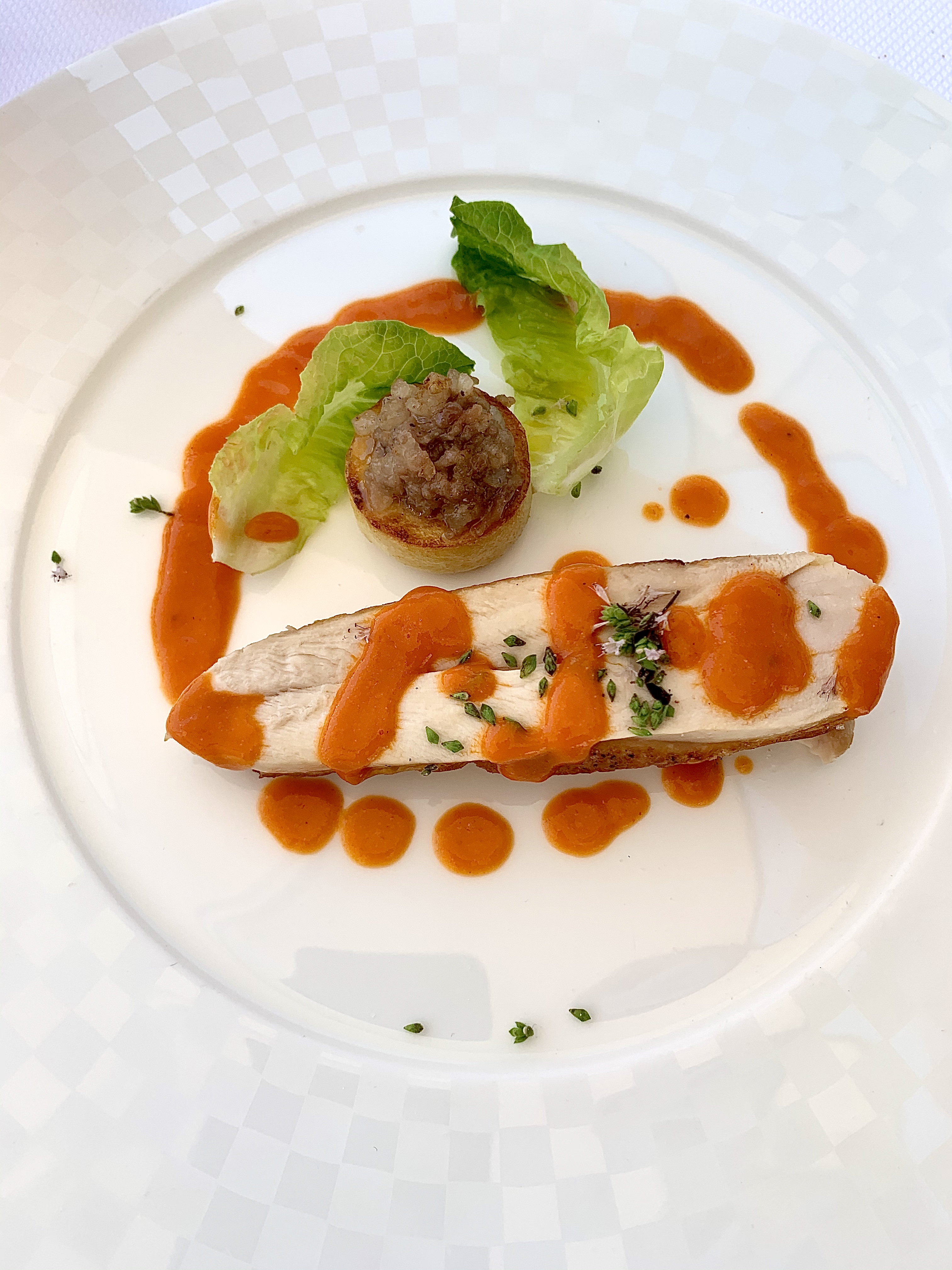Volaille sauce Diable, pomme de terre farcie aux foies de volailles : la volaille cuite en basse température, gourmande de sa peau croustillante, est euphorisée par la sauce Diable d’un discret piment au poivron centrifugé suave et pimpant. La pomme de terre à la farce prometteuse de saveurs automnales se révèle en légèreté estivale d’agrumes saisissant de fraîcheur.