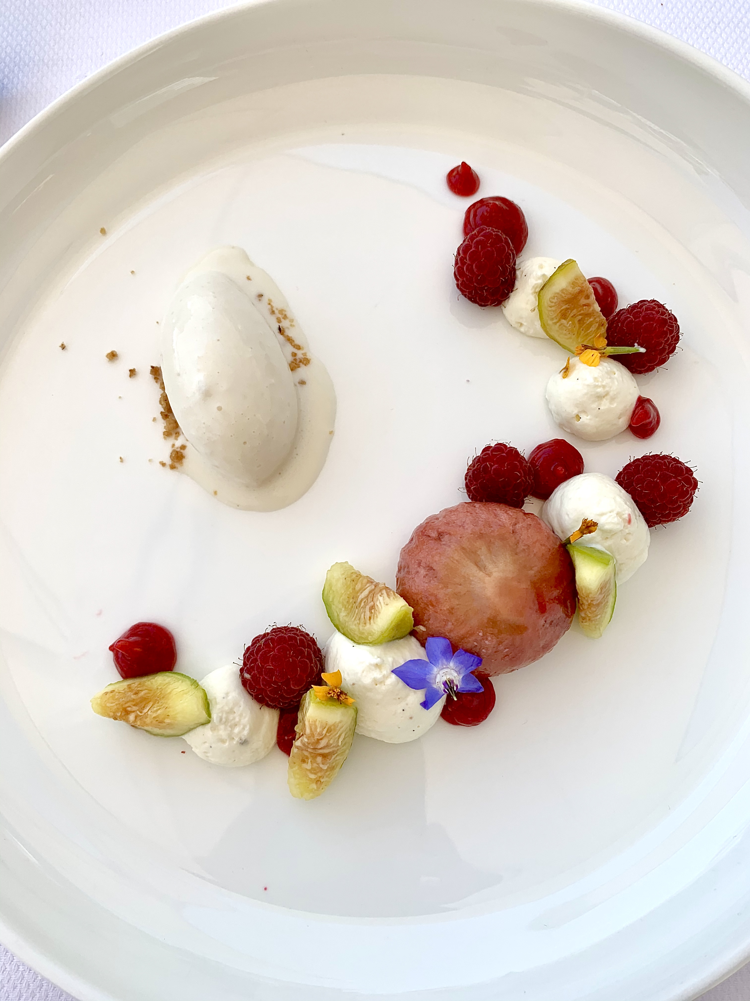 Figues rôties et crues, glace amandes fraîches : un dessert d’une douceur d’un soir d’été où les figues sont langoureusement accompagnées d’une crème glacée au lait d’amandes fraîchement sorties de leurs coques velours. La figue rôtie entière au miel maison (produit au pied du massif du Mercantour pour les établissements SBM) nous raconte toute sa gourmandise ensoleillée, la mousse mascarpone, dense et aérienne à la fois, subjugue les figues vertes et crues, pendant que la gelée de framboises fraîches nous transporte au firmament des douceurs parfaitement ajustées de sucrosité naturelle.