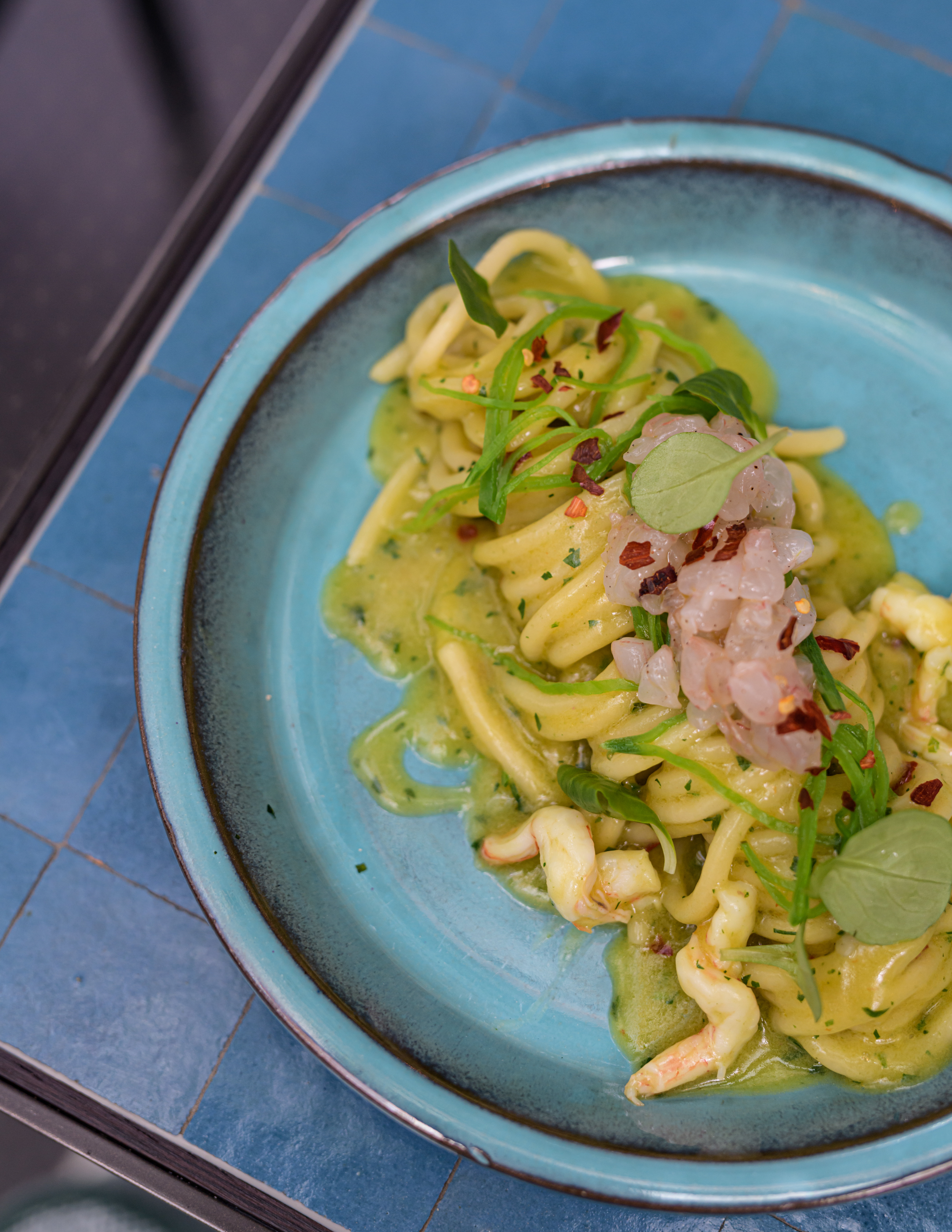 Les Pâtes aux fruits de mer ou les Mafalde ail, piment et tartare de crevettes mi-cuite sont addictives de plaisirs.