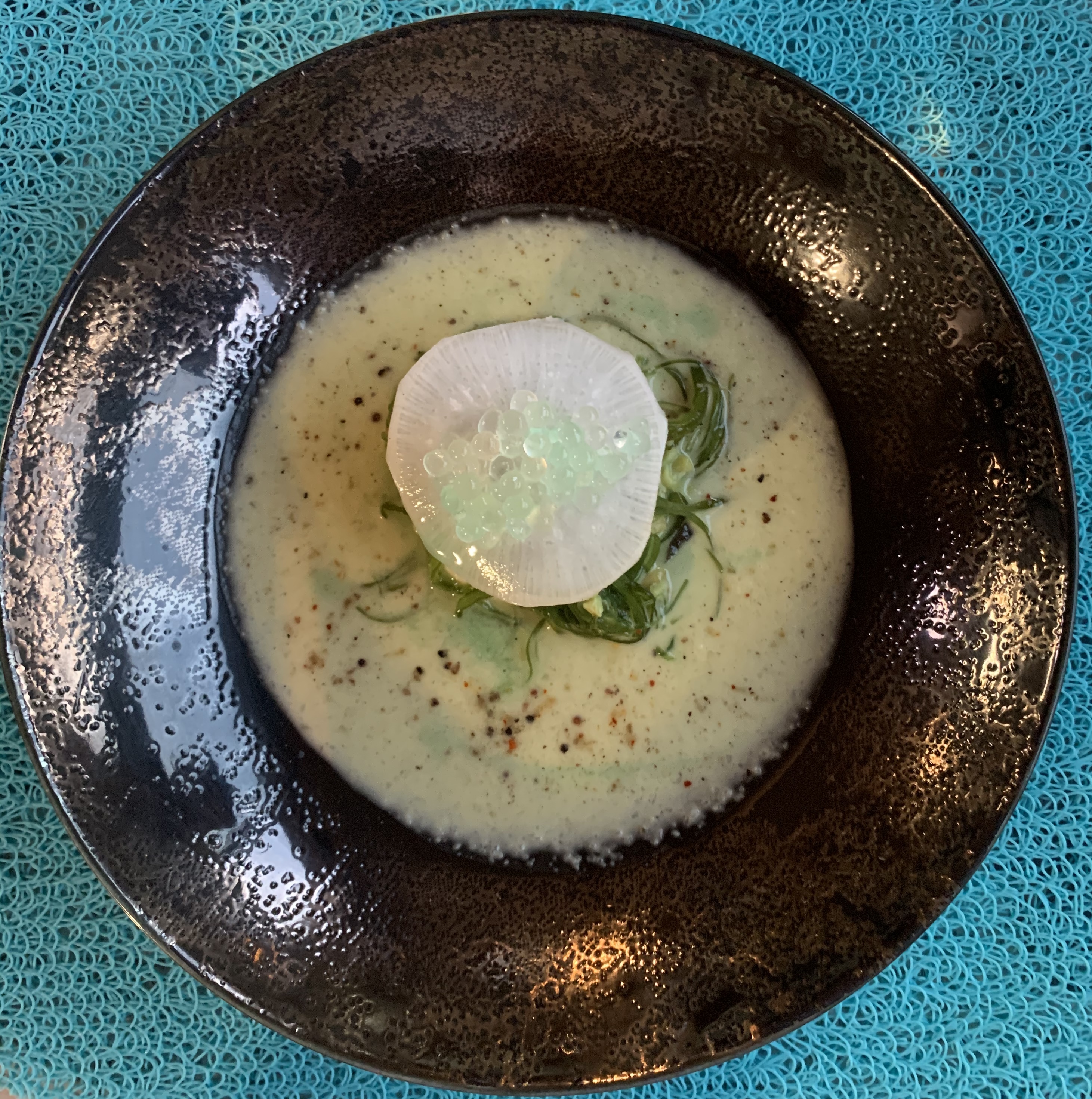 La Soupe de concombre mentholée, burratina crémeuse, algues wakamé Thaï et radis noir : toute la fraîcheur de la soupe de concombre arrive en bouche en progression, mise en exergue par le déroutant et parfaitement maîtrisé trait de vinaigrette mentholée au Get 27. Le crémeux de la burratina est exalté de la texture du radis noir à cru. Les algues wakamé à l’identité Thaï et à l’iode raffinée sont épaulées des perles yuzu qui dynamisent le tout pour un équilibre stupéfiant.