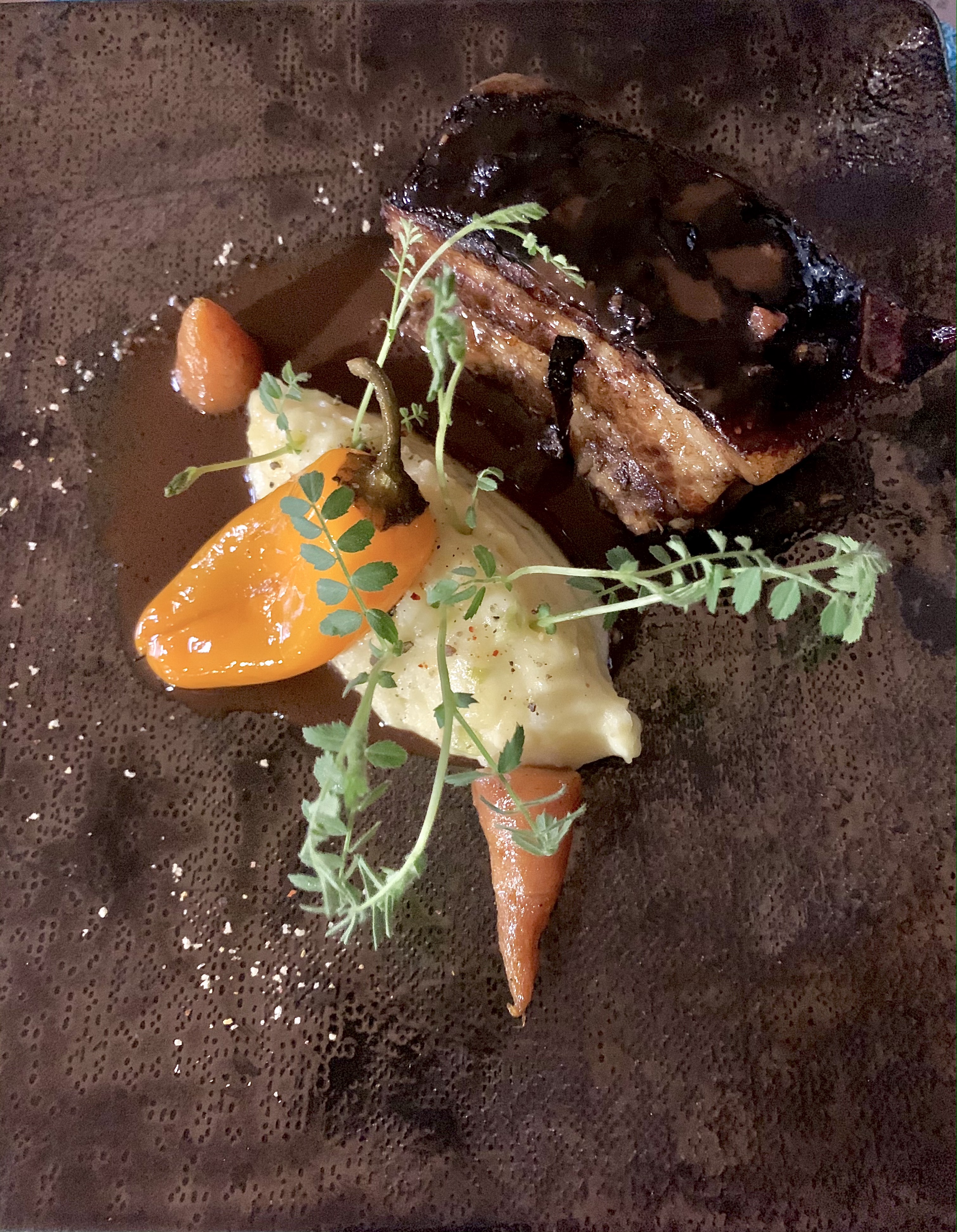 Poitrine de cochon fermier en cuisson lente, écrasé de pommes de terre, légumes du marché, jus corsé au chocolat : le cochon est cuit avec douceur, amour et générosité, nourri et laqué durant 15 heures en basse température, ce qui lui donne un fondant incroyable qui est texturé à la fois. Le goût est soutenu par le jus corsé au chocolat et donne un bel équilibre. Le piquillos et la carotte confite s’égalent de plaisirs entre le léger piquant et la sucrosité dans votre assiette, la pomme de terre les rappelle à l’ordre dans une bienveillante douceur. Les pousses de pois chiches finissent en signature de verdure.