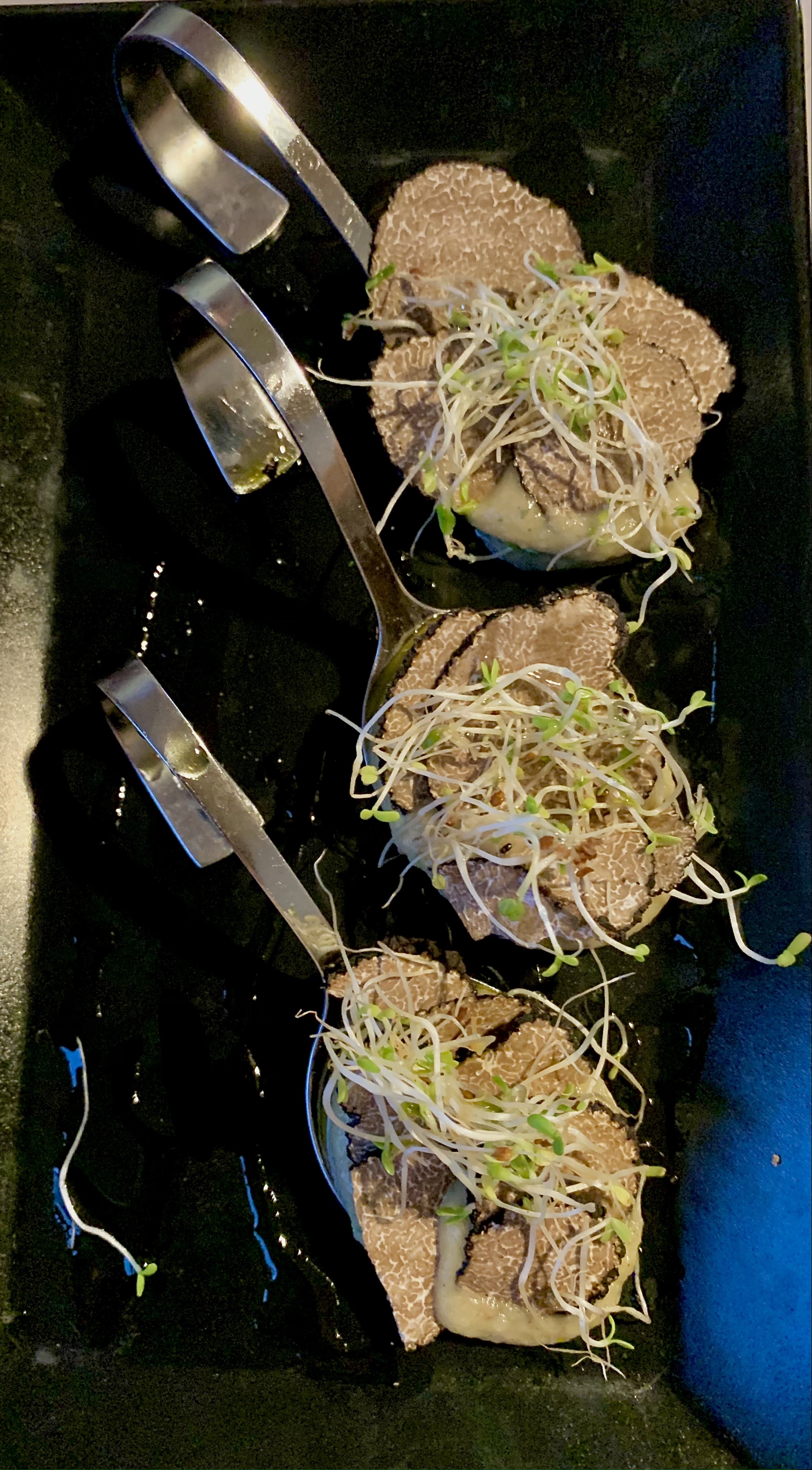 Tout commence par une mise en bouche d’une Focaccia, huile de truffe, caviar d’aubergine et truffes fraiches, le tout est légèrement relevé d’un petit piment en subtilité, suivant la saison, vous dégusterez une appétante bouchée d’Houmous à la truffe et à la figue de Saint-Jeannet d’une exquise délicatesse.