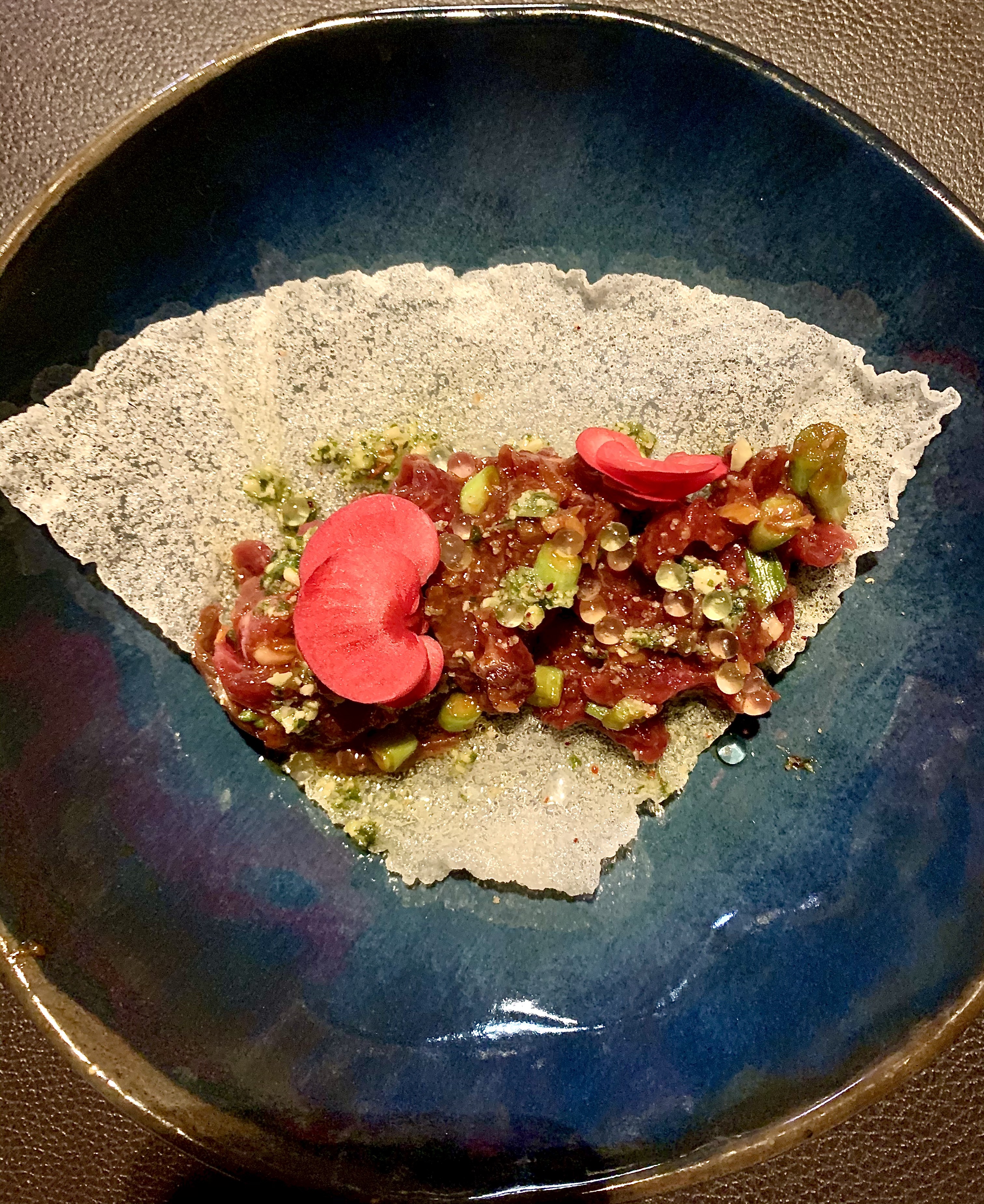 Le Carpaccio de Boeuf façon Thaï aux herbes aromatiques et épices pilées et non mixées explosent en finesse de saveurs et se définissent en bouche les unes après les autres pour une palette aromatique réussie. La viande limousine au goût et à la texture parfaite (la viande est tapée pour une tendreté infinie tout en gardant sa texture et sa fibre) est vivifiée de perles de yuzu et de fleurs de bégonia. La craquante chips de maïs ou de riz (suivant le jour) est ludique et donne cette folle envie de déguster avec les doigts, tels sur les marchés d’Asie ou du Mexique.