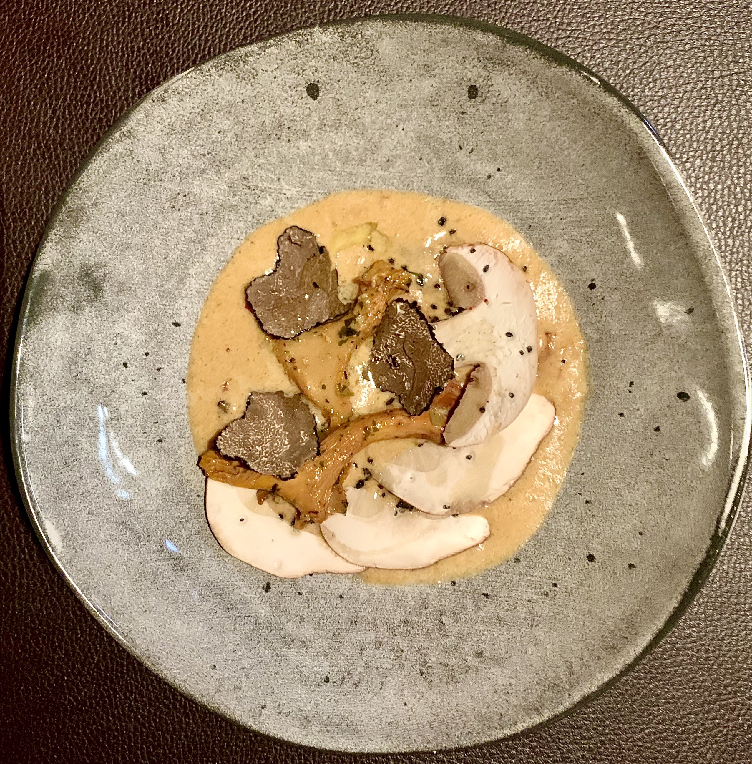 Carpaccio de cèpes frais, onctueux de champignons et girolles rôties : c’est l’assiette qui va sûrement vous réconcilier avec les frimas de l’automne, deux mots arrivent dès la première bouchée : gourmandise absolue! Tout est là et bien là, l’onctueuse crème de champignons shitaké est juste parfaite, elle est titillée des différents poivres en relief, le cèpe cru, les girolles poêlées nourries au beurre et les truffes vous projettent dans un univers gastronomique maitrisé de sous-bois. Une très belle assiette!