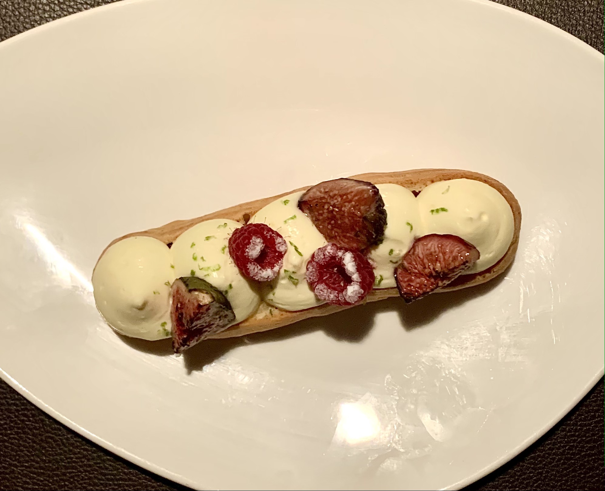 Tout comme l’Eclair crémeux citron vert, gelée de fruits rouges et figues fraîches qui est une touche de douceur en accord.