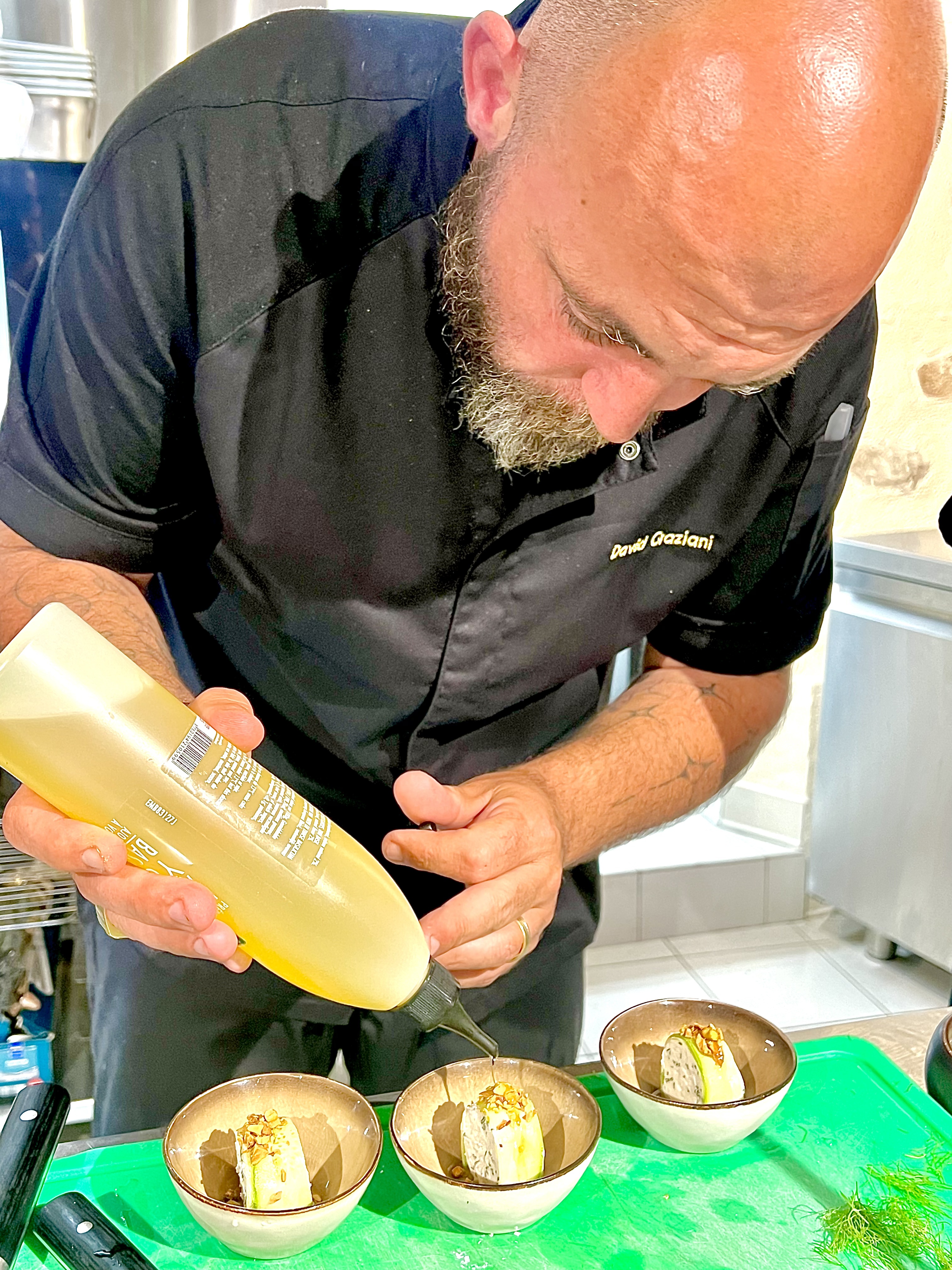 Ancien designer paysagiste, il a tout arrêté il y a 5 ans, pour vivre de sa passion et de l’amour de la cuisine, qu’il a apprise auprès de sa grand-mère italienne. Il débute un temps avec un food-truck de casse-croute niçois (dit Merenda en niçois) : Pan Bagnat et autres spécialités. Il fait très vite écho dans les environs où tout le monde se presse pour goûter et découvrir ce camion de la convivialité et de la gourmandise. De ce succès, et suite aux nombreuses demandes, il met en place un service traiteur, qui lui confirme son envie et son rêve d’avoir son propre établissement. C’est dans son village natale de Gattières, où les Graziani sont installés depuis plus de 7 générations, qu’il reprend un ancien bar tabac situé sur une ravissante et typique place avec sa fontaine digne d’un décor des films de Pagnol. Dans un premier temps, il y propose une généreuse cuisine bistrot (magret de canard, pommes de terre sautées, camembert rôti et pâtes au parmesan dans la meule), mais très vite la routine d’une carte établie sans surprise le déconcerte et l’ennuie. La rencontre avec deux chefs emblématiques de la région, Christian Pumail et David Faure, va lui donner des ailes et une merveilleuse légitimité d’assumer son désir de créer et de s’exprimer pleinement au travers d’une cuisine qui lui ressemble : identitaire, d’instinct et de partage, à la bouillonnante inventivité. Ainsi, la Merenda de la Place devient une véritable destination gastronomique où le Chef, bien loin des standards, est libre des contraintes académiques et des codes classiques imposés dans les écoles de cuisine. Il signe des assiettes emplies d’audace, parfois de folie, mais toujours d’une justesse rare dans les associations et les saveurs qui sont en parfait équilibre.