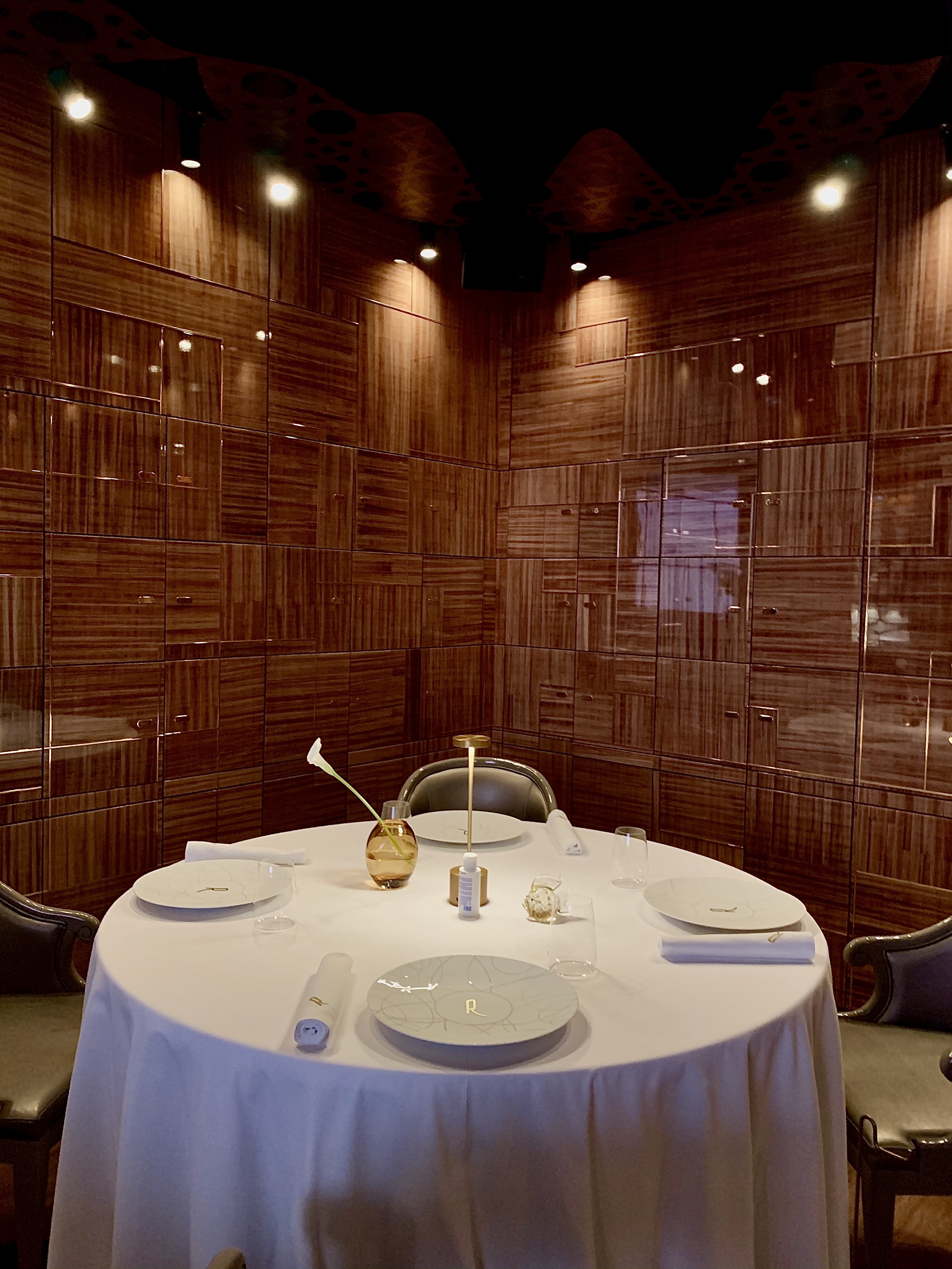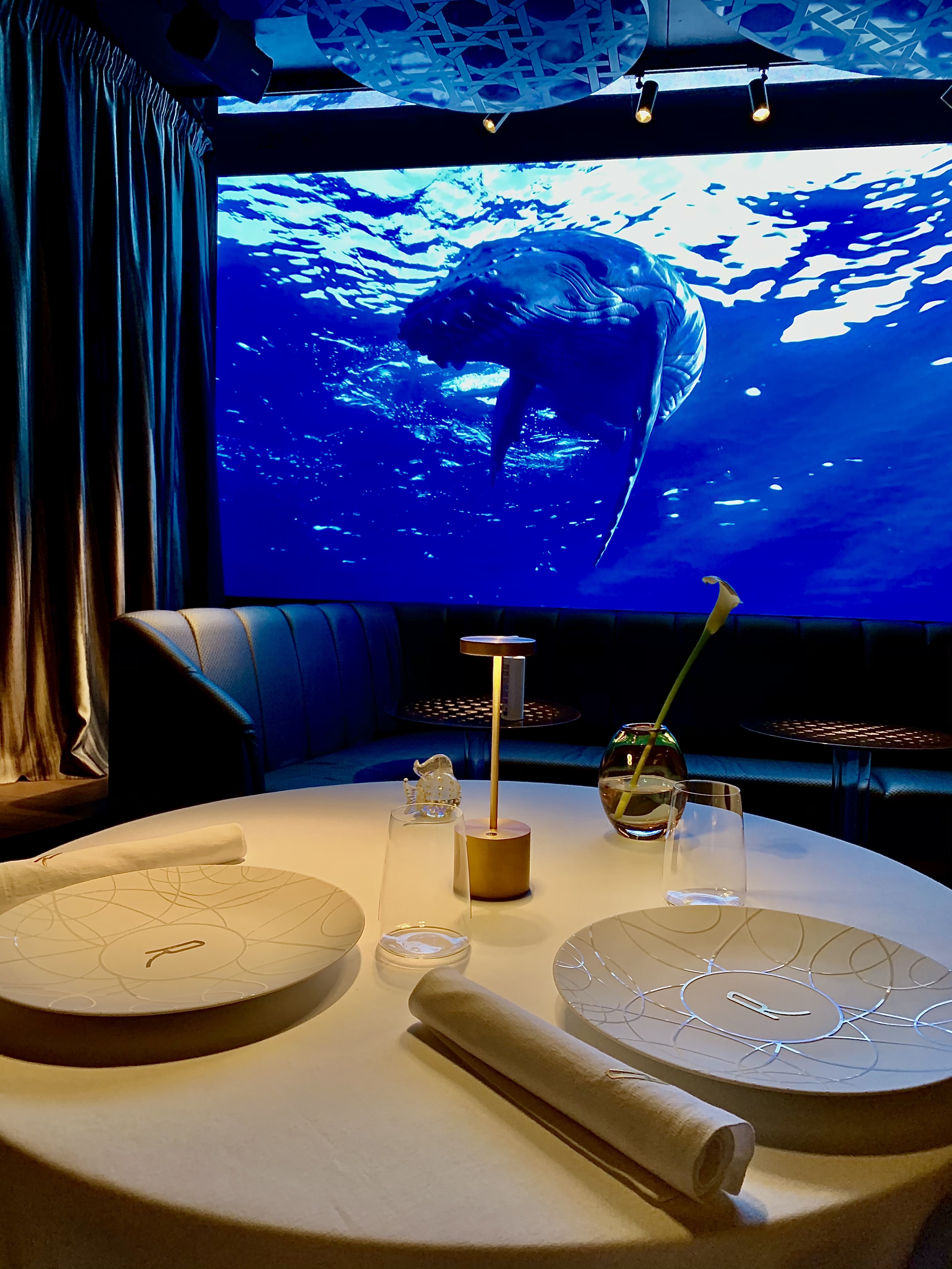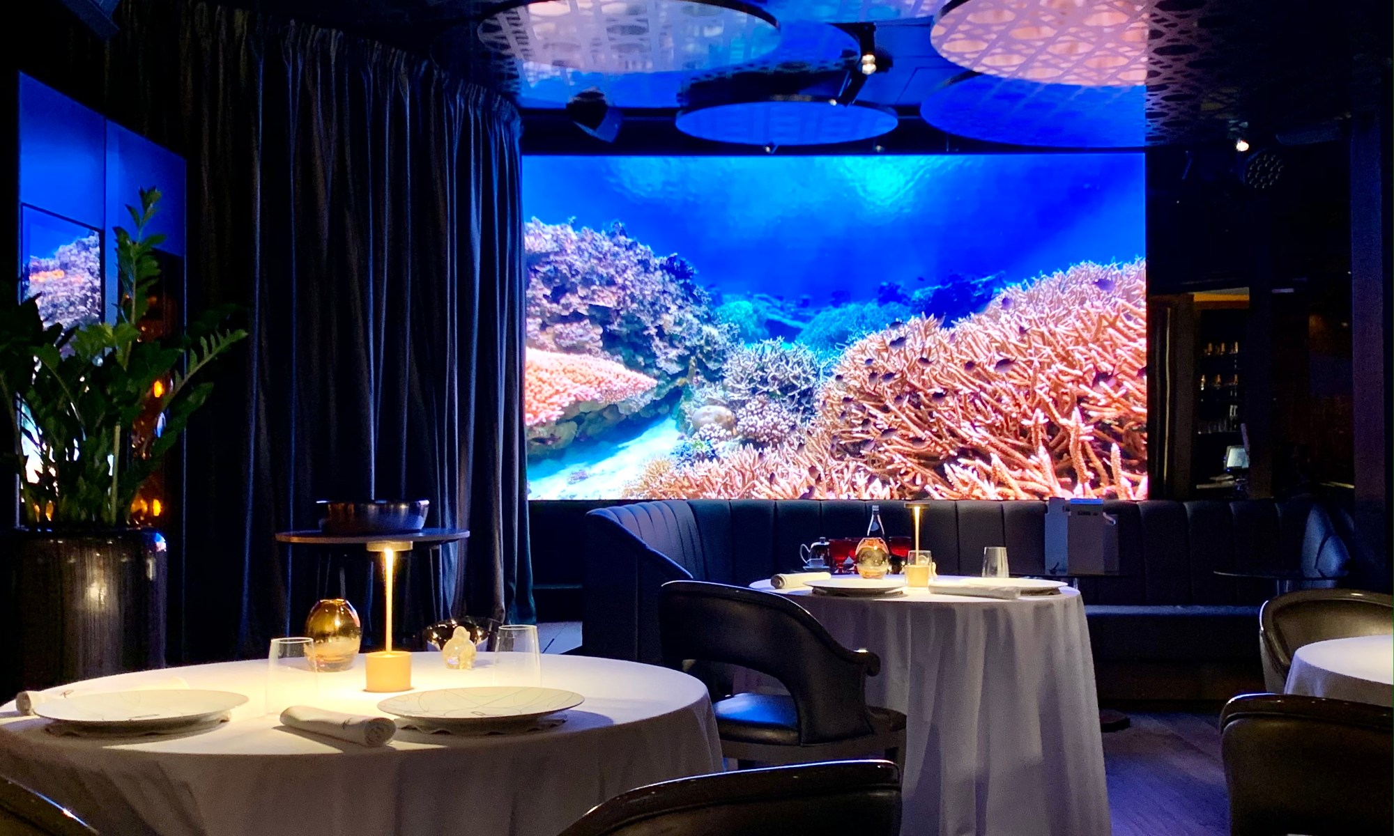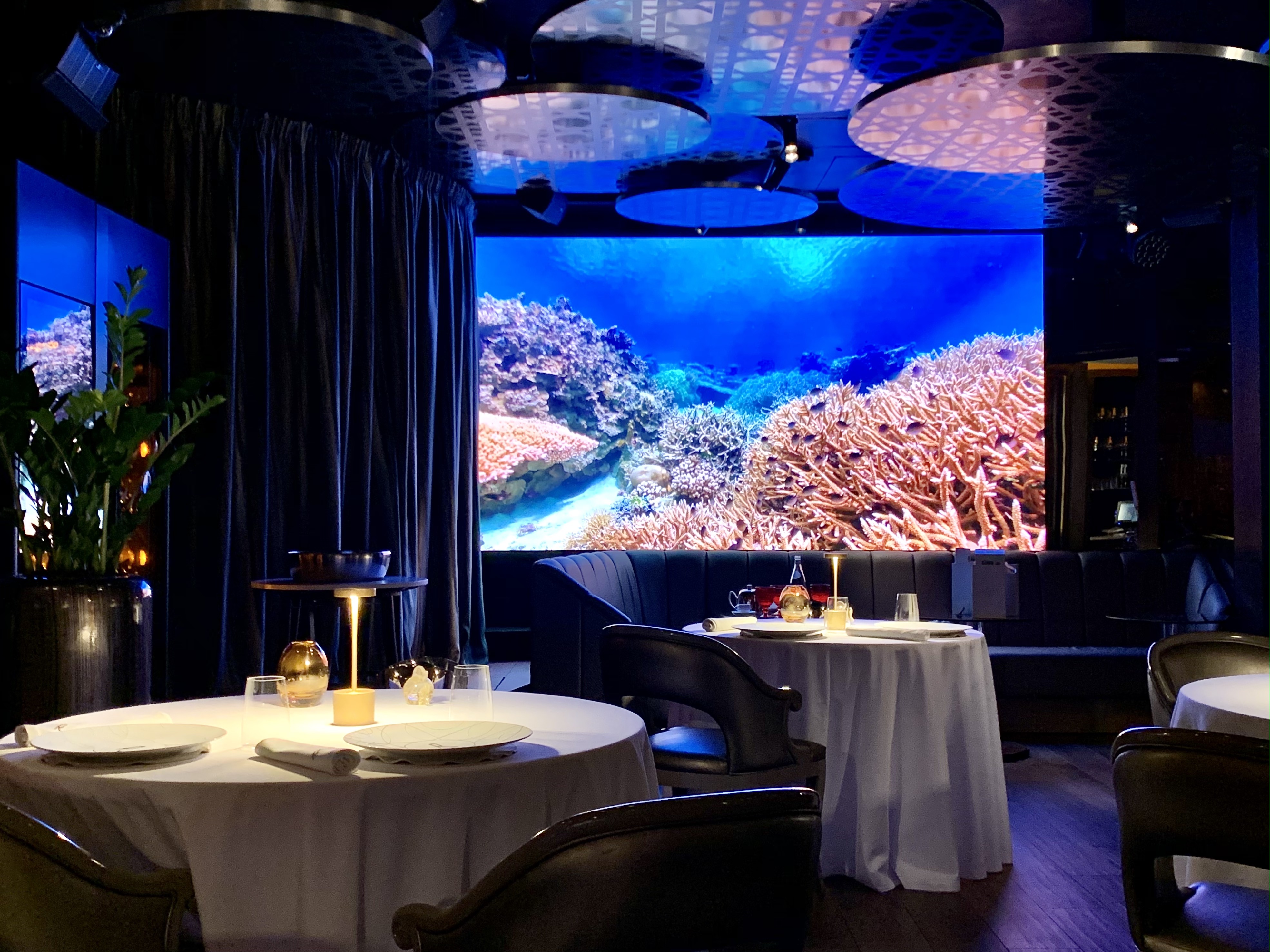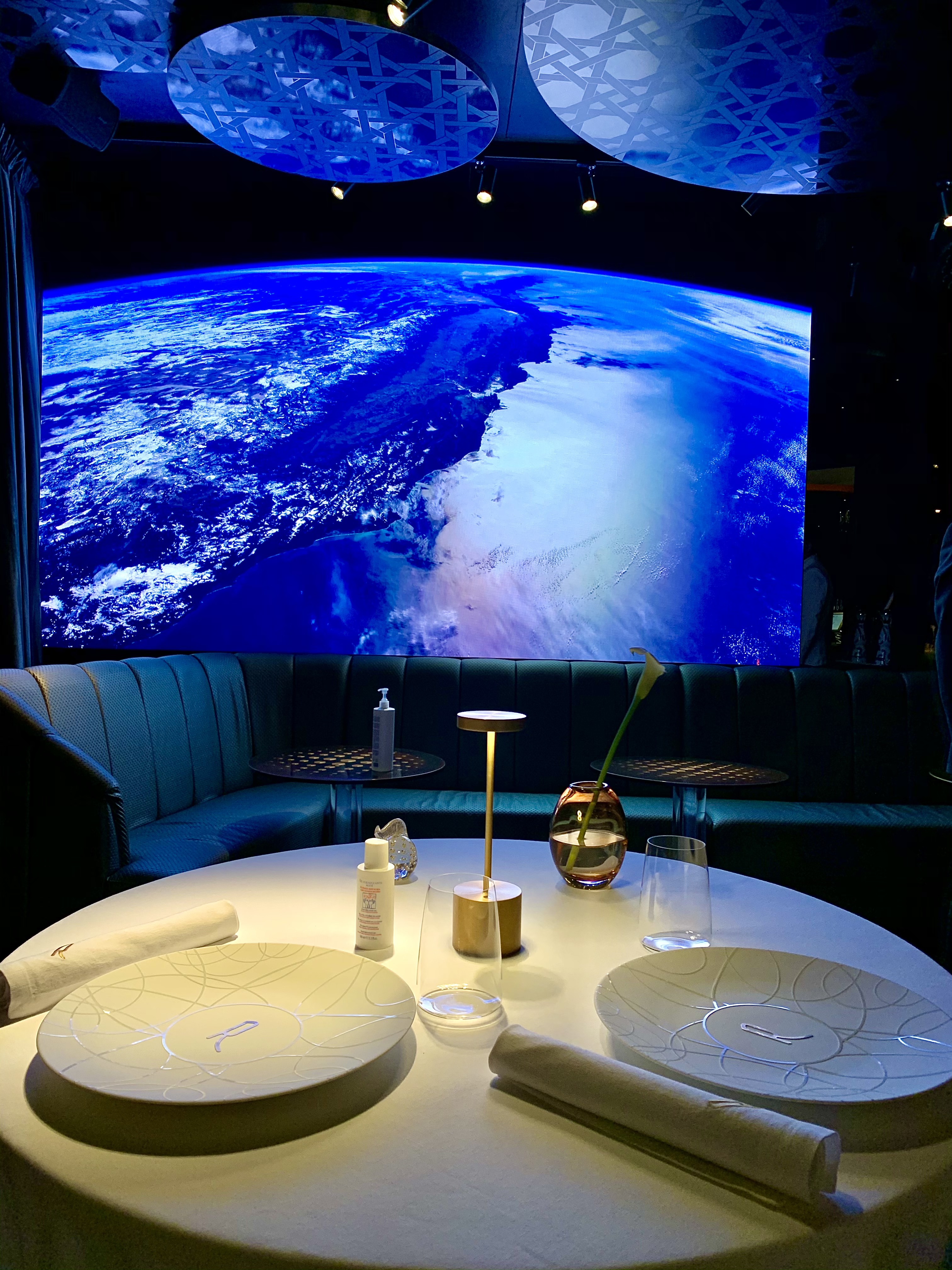 La salle, aux murs laqués de bois de bananiers, gardant secrètement 140 coffres (à ouverture digitale) emplis de cigares ou de bouteilles de vin d’exception pour les clients habitués et membres du « Cigar Club », est un véritable écrin à l’univers onirique d’un voyage dans l’espace ou à 20 000 lieux sous les mers. Les tables dressées au raffinement extrême des arts de la table, en intimité d’une lumière tamisée et diffuse, vous invitent à vivre un moment unique et chic. Un immense écran, tel un hublot ouvert sur l’univers, vous fait voyager au long cours, sous les mers, dans les airs ou dans l’espace… les images de la subjuguante vue de la terre ou d’une baleine dansant en majesté dans les eaux nuit-marine à la lenteur relaxante vous accompagnent en douceur et discrétion tout au long de votre mémorable expérience sensorielle et gustative.