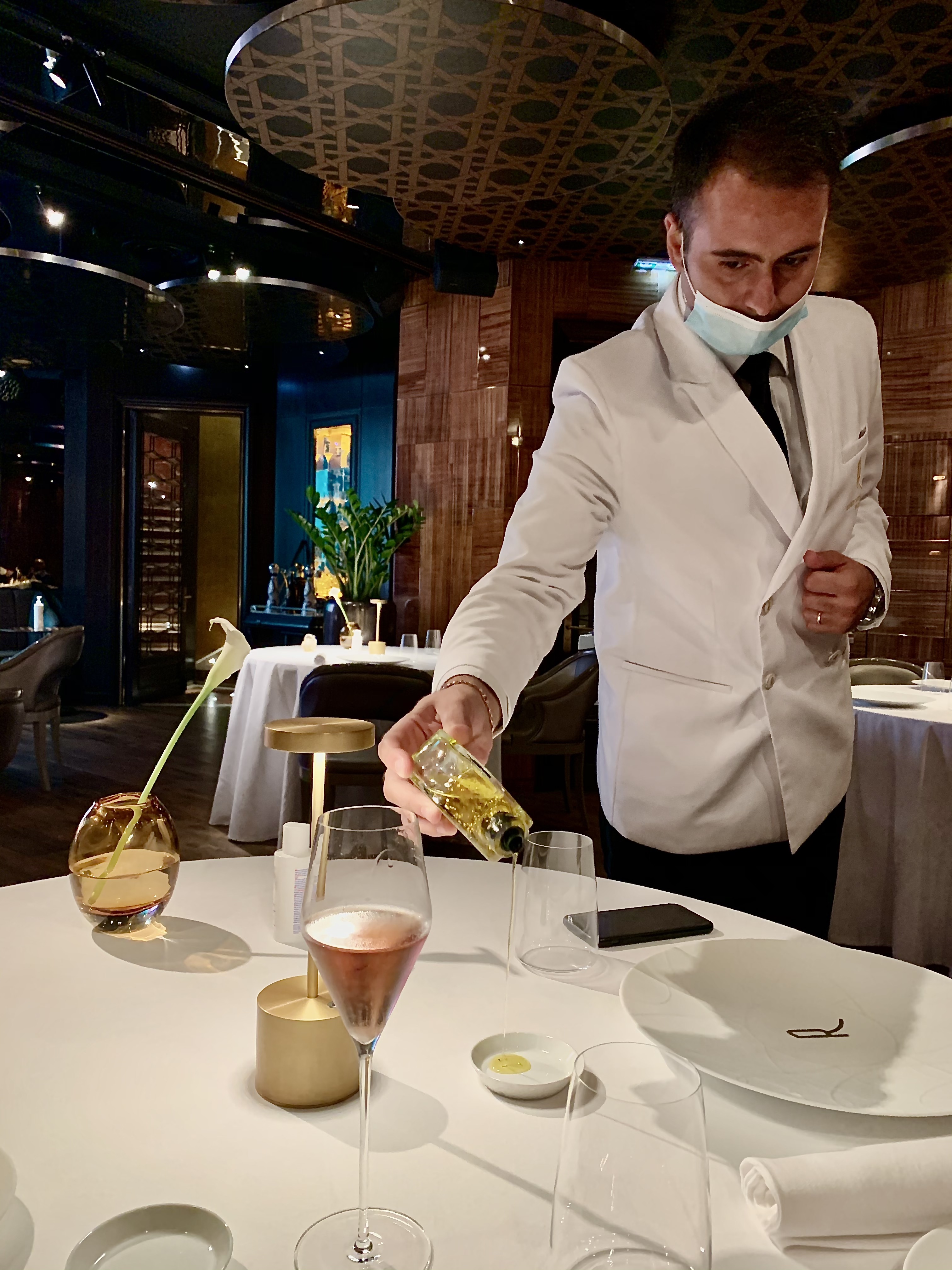 Vous êtes reçu dans une chaleureuse et incomparable élégance italienne par l’excellent et charmeur Massimo Sarnataro, le directeur du restaurant, qui vous accompagne à votre table confidentielle. Dario, votre maître d’hôtel attitré, et Nicolas, votre sommelier, vous accueillent avec attention et bienveillance dans la pure tradition des grandes maisons italiennes : veste blanche impeccable et ajustée, gestes précis et professionnels, sourires sincères et complices… tout est là, tout est fait pour vous sentir privilégié et choyé.