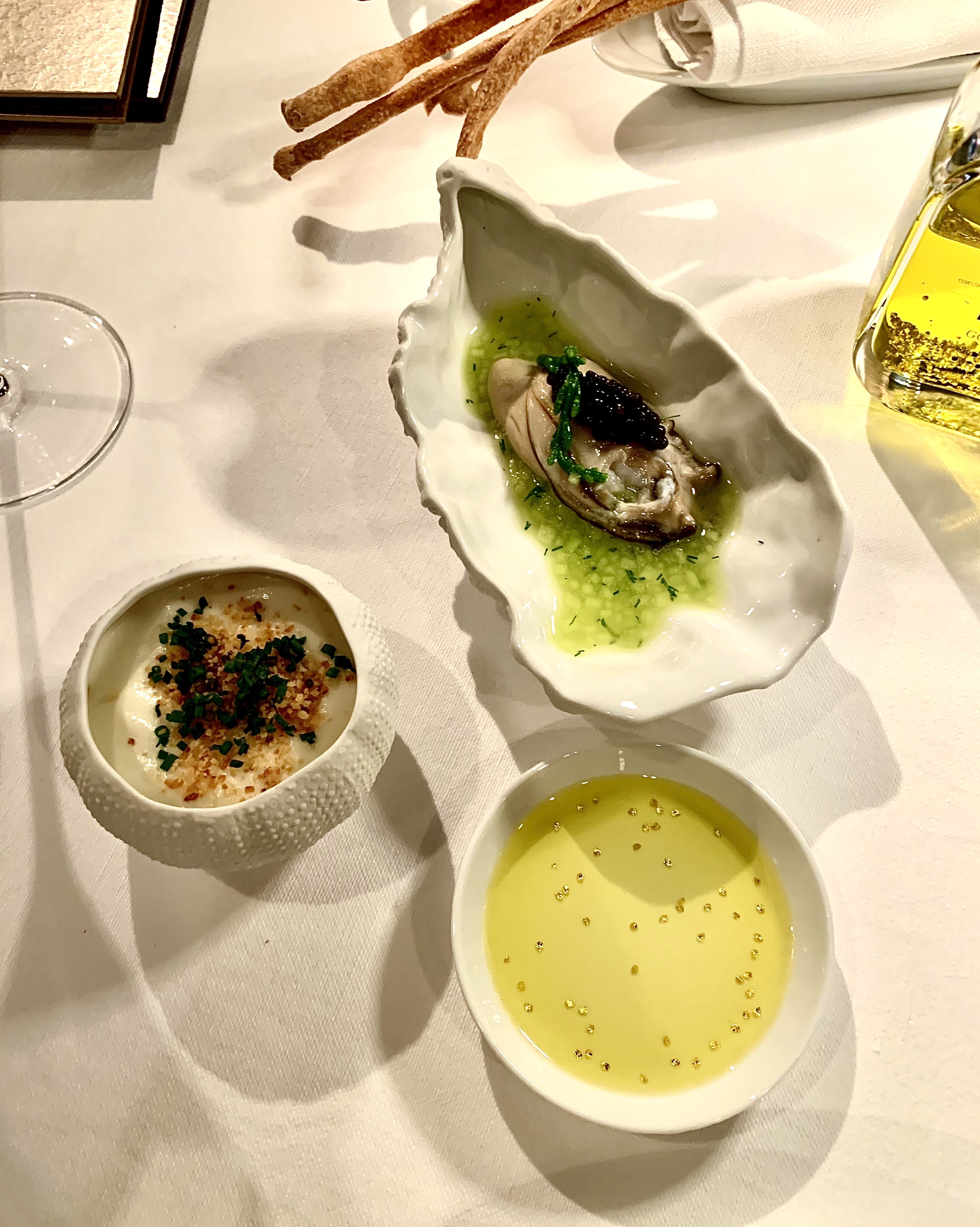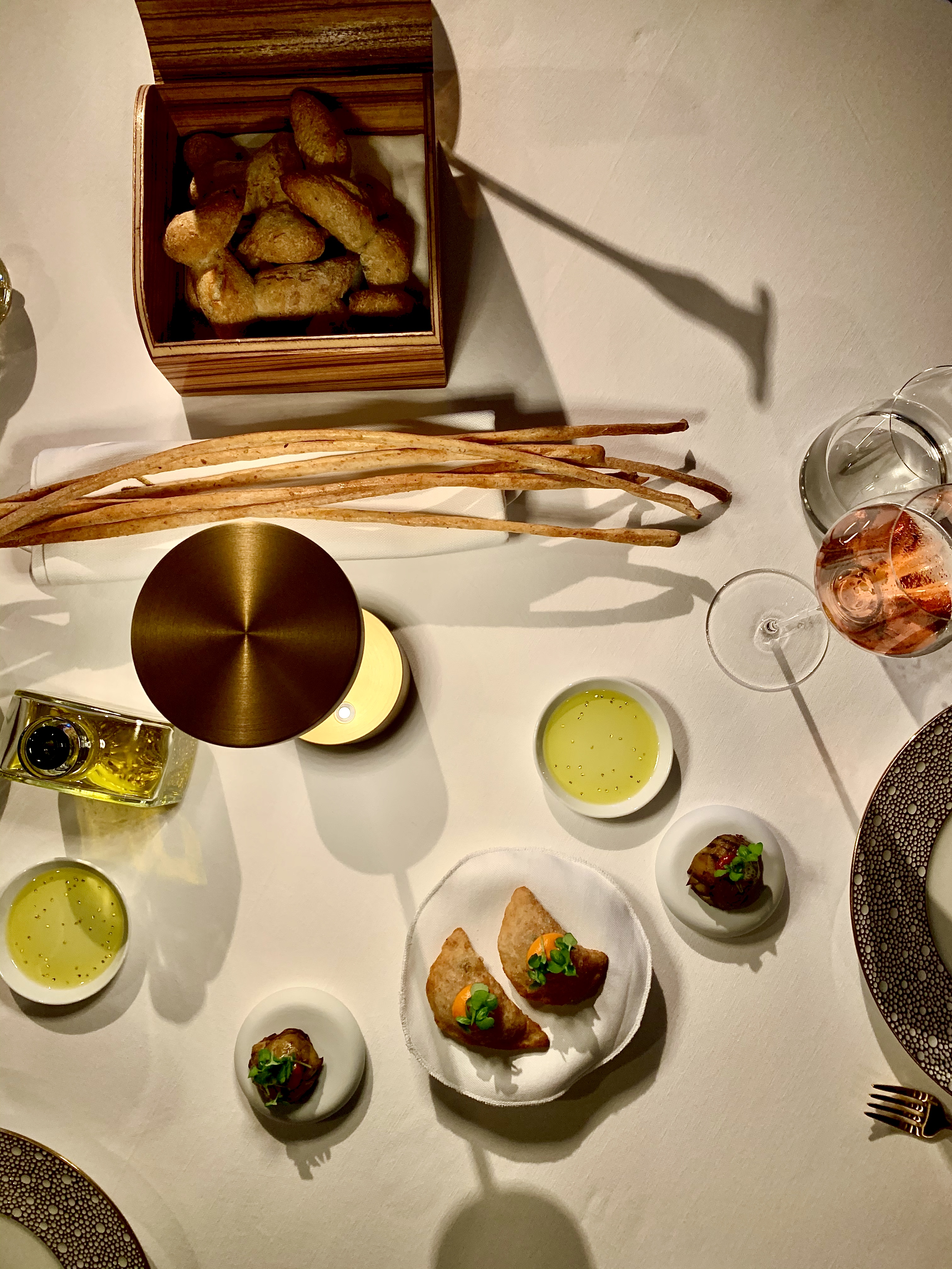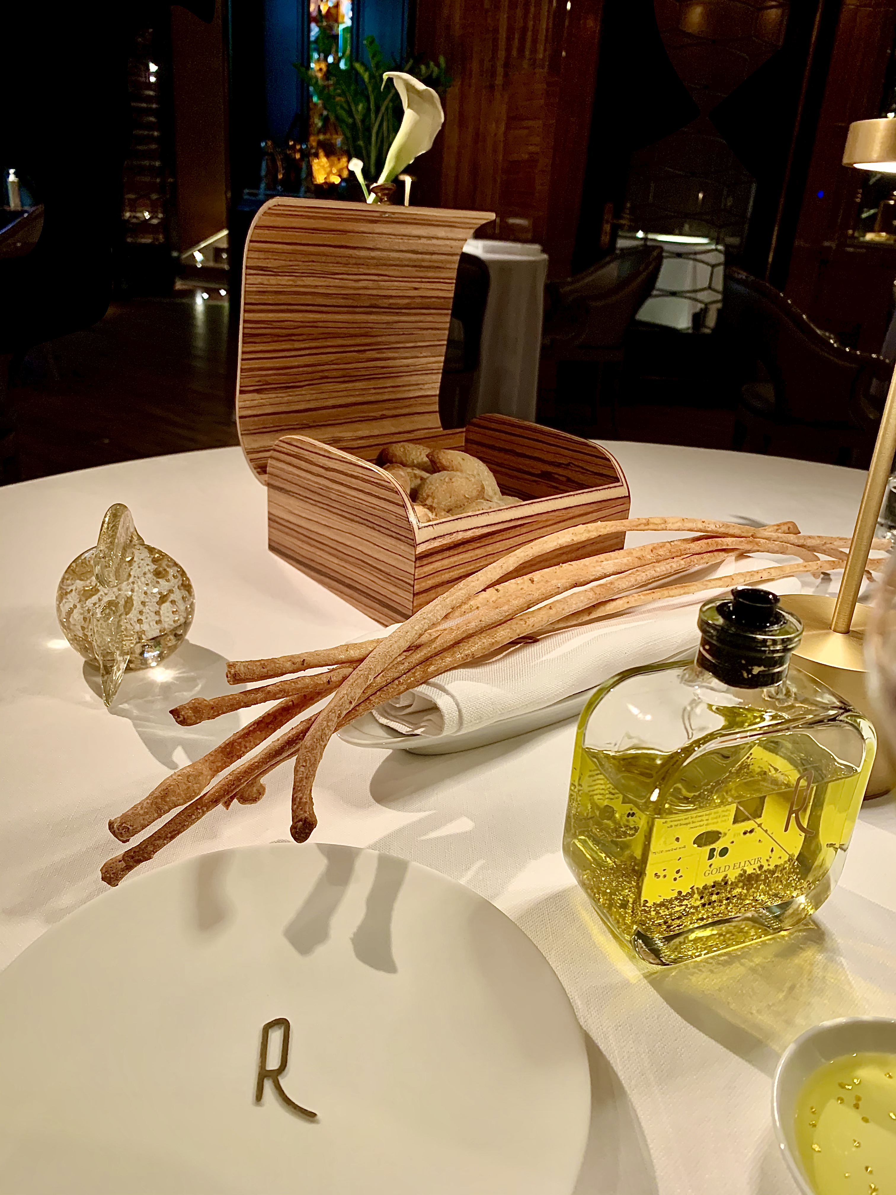 Le pain et les gressins maison, placés dans une boite en bois reprenant le style des coffres à cigares, permettent de goûter sans complexe Le Gold Elixir : l’huile d’olive aux feuilles d’or 24k conçue spécialement pour La Table d’Antonio Salvatore par l’huilerie préférée des chefs étoilés : « l’Huilerie Saint-Michel » à Menton.