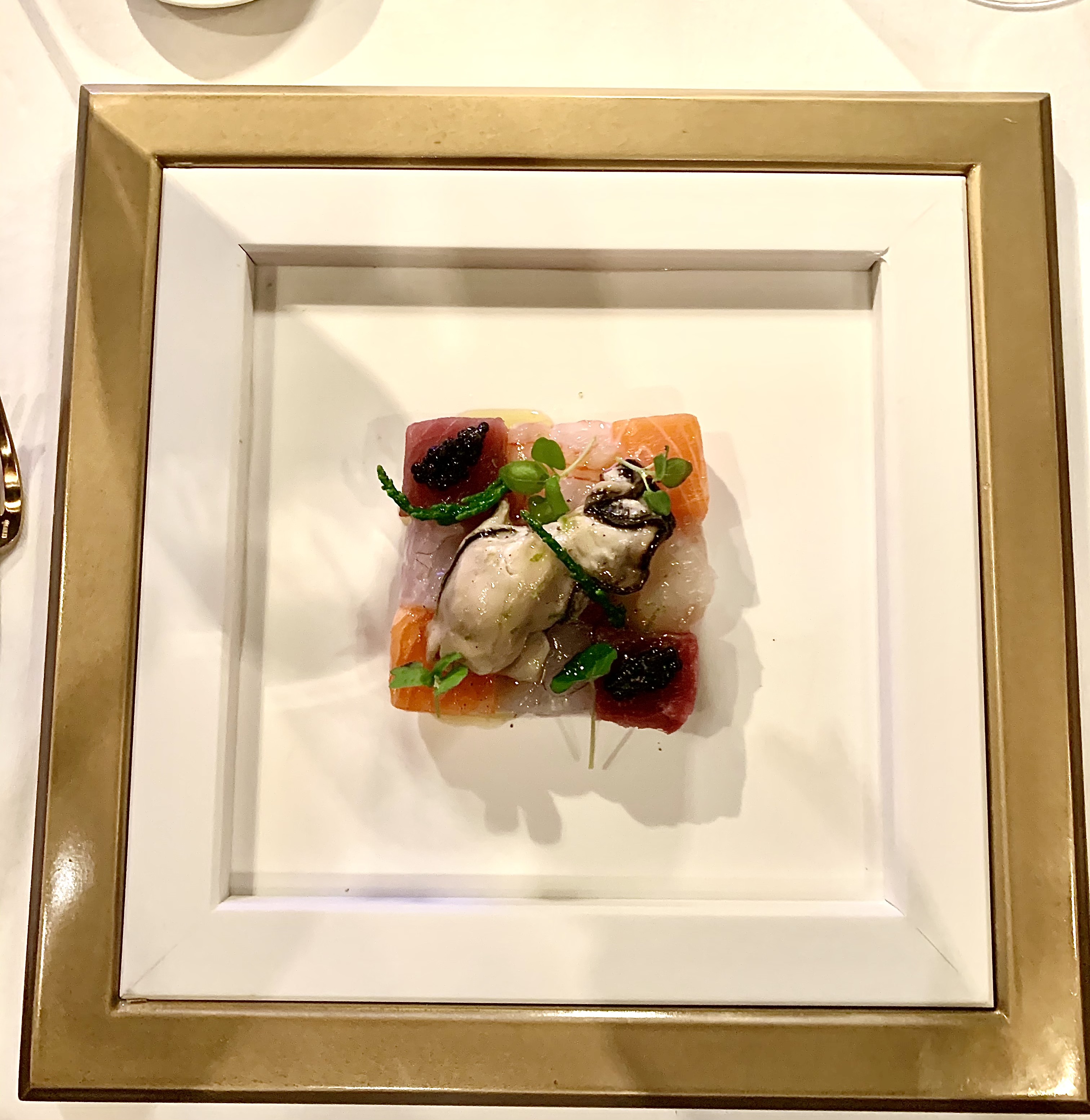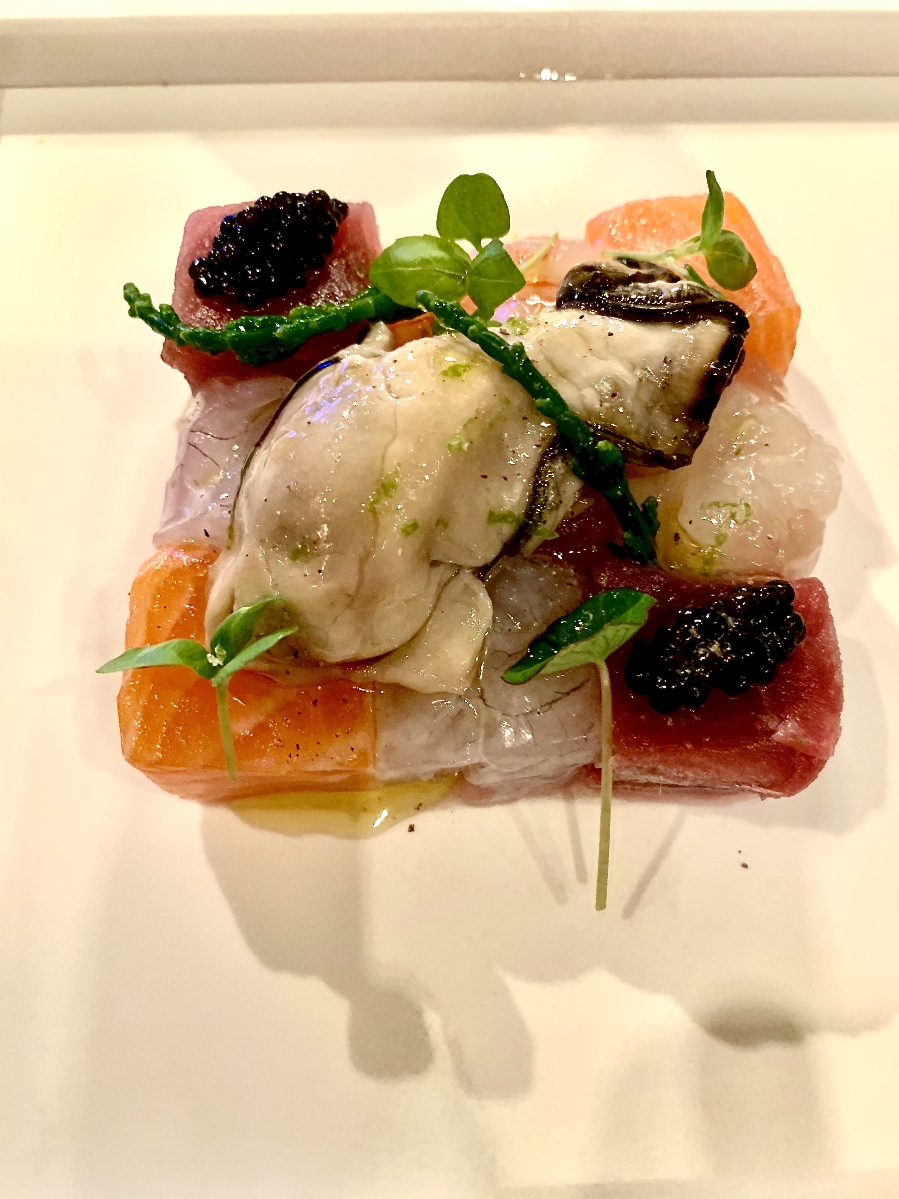 Quadro di Crudo – Crudo de poissons et crustacés de la mer Ligure, caviar, huître et essence de citron de Menton. Véritable tableau de « Cru » à base de Sériole, de Thon, de Saumon, de Langoustine, de Gamberoni de San Remo et d’Huître, à la découpe large et généreuse pour une belle mâche des poissons qui se parlent les uns les autres et s’accordent à merveille sans se surpasser. L’essentiel du produit est mis en avant dans la tradition des crudo italiens, juste une pointe d’acidité du citron de Menton suffit pour affirmer le relief des éléments tout en gardant leur propre identité.