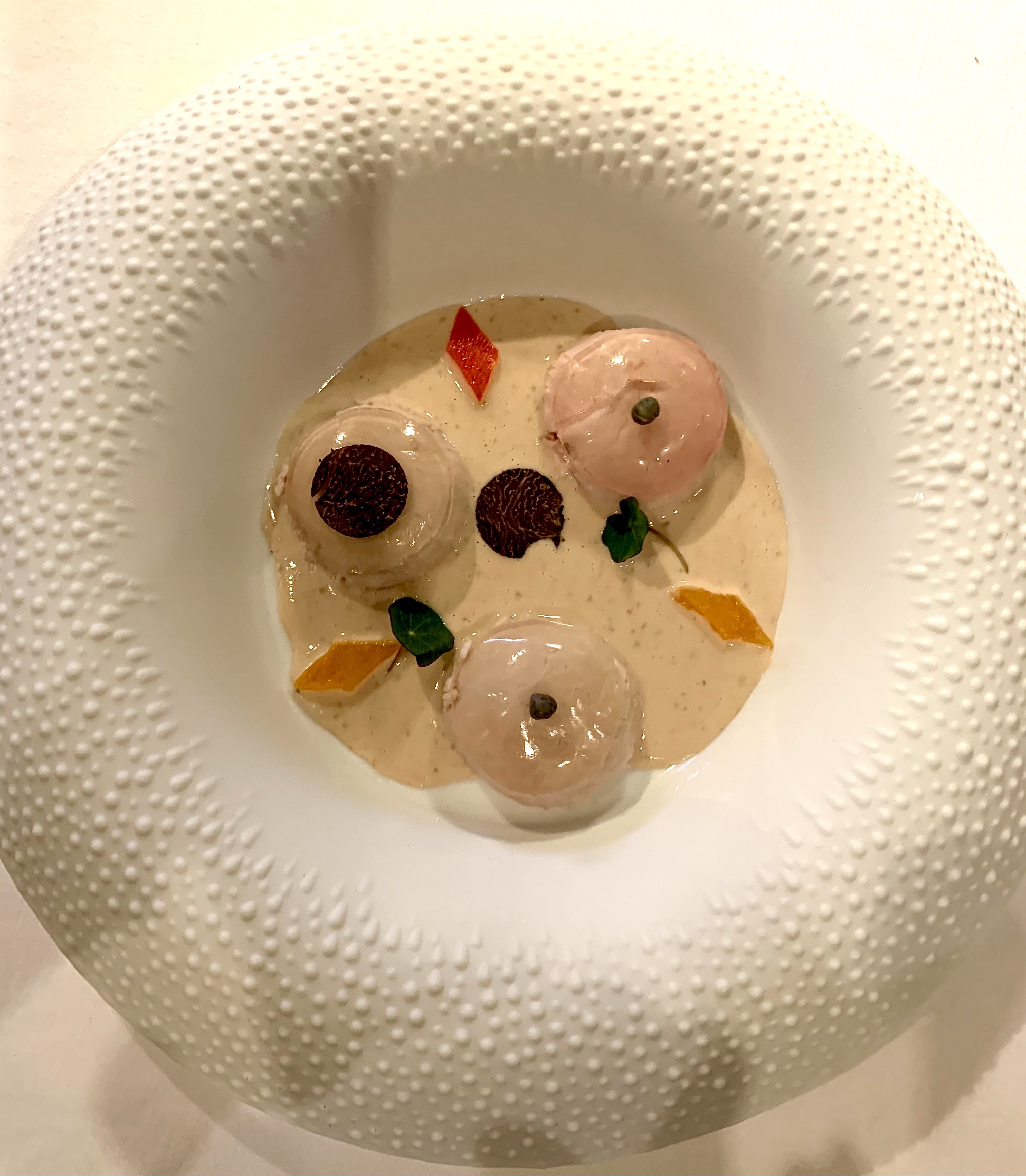Bottoni di Vitello Tonnato – Veau rôti sauce au thon : est un des plats emblématiques de la cuisine italienne de la région piémontaise qui rassemble la terre et la mer. Ici, le chef l’a retranscrit en de délicates bouchées, tels des petits boutons de veau à la gourmande sauce au thon d’un goût profondément influencé de truffes fraîches. La fine gelée du bouillon de veau apporte une texture et renforce les saveurs pour plus de raffinement.