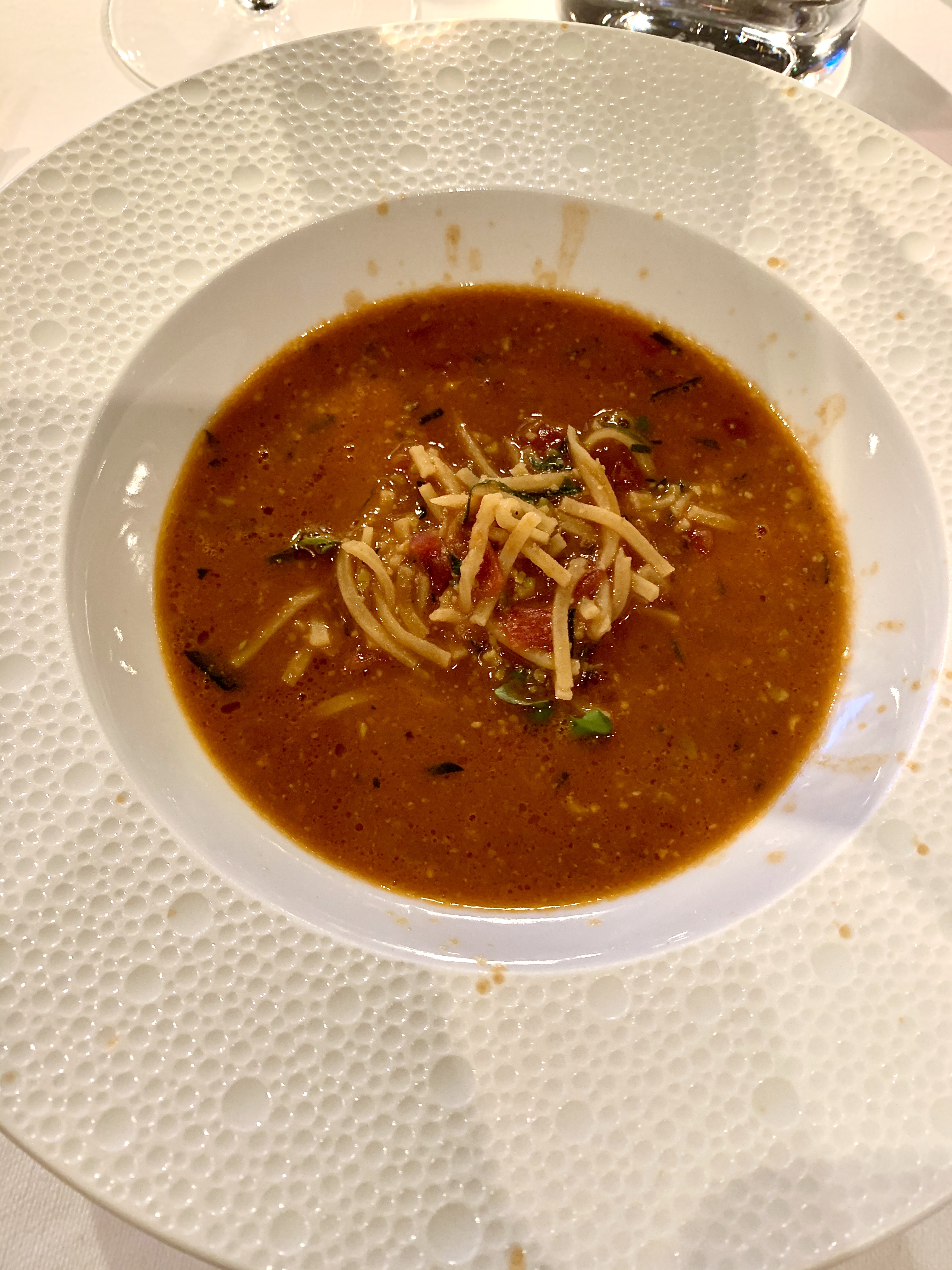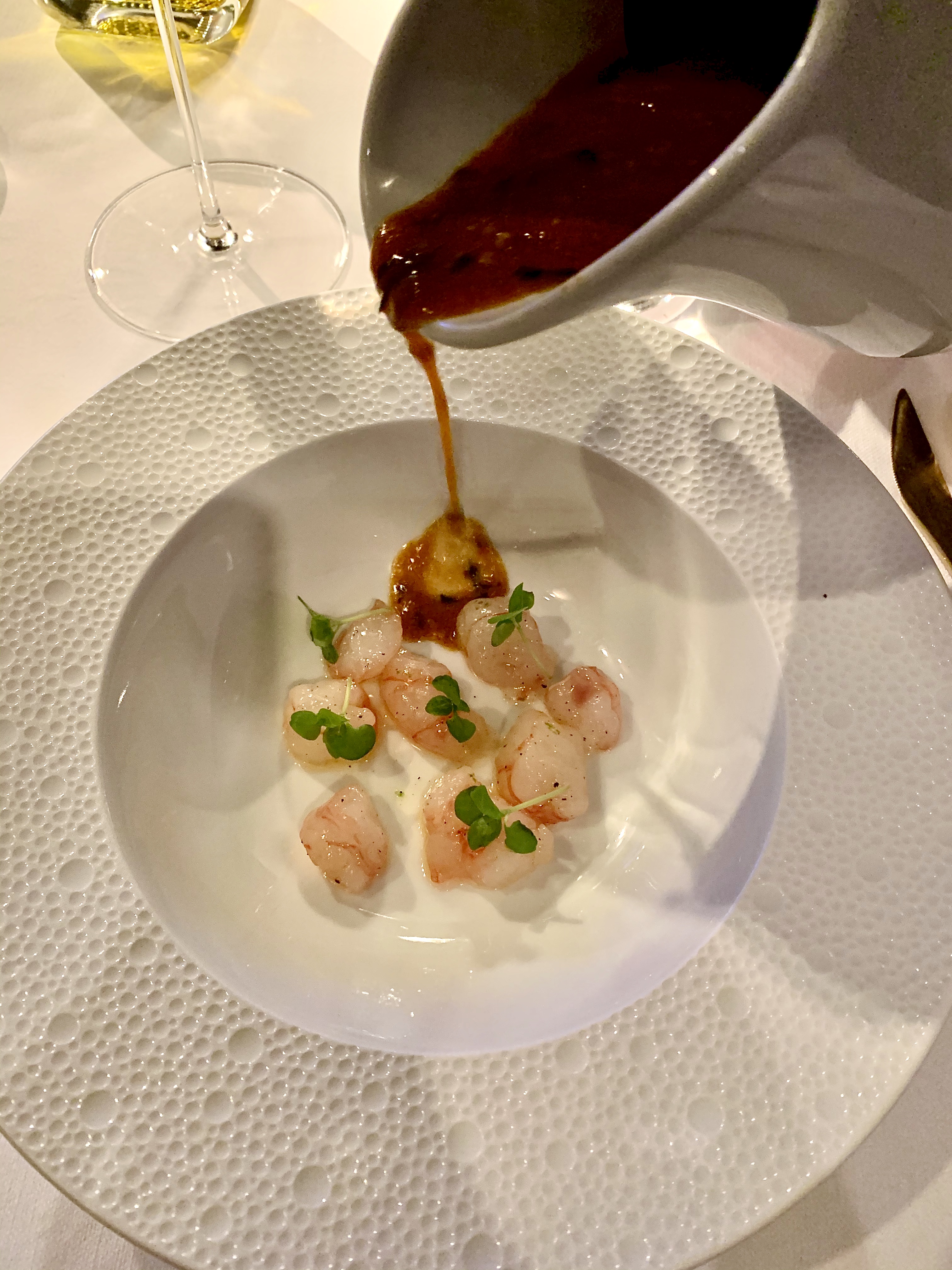 Rosso di San Remo – Soupe de crevettes de San Remo, tagliolinis et pistaches de Bronte : un plat qui raconte une histoire, celle de l’enfance du chef dans le sud du pays et des grandes tablées des dîners de partage en famille, de ces fumantes soupes de légumes de saison aux pâtes que l’on casse (spezzati) pour donner plus de texture comme du pain et bien plus facile à attraper avec la cuillère. Le chef, tout en gardant l’essence de cette recette familiale, lui a apporte une vision gastronomique avec les gamberoni de San Remo (crevettes typiques au goût intense et à la chair d’un homard). Posées cru dans l’assiette, elles sont cuites à l’instantané par la soupe : votre nez est alors enivré des parfums intenses de cette soupe de crevettes aux tomates safranées au moment où Dario « baigne » les gamberoni qui se raidissent de chaleur. A la première cuillère, vous êtes en extase d’une émotion gustative, réconfortante, rustique et raffinée à la fois… vous vous imaginez alors en plein bonheur d’un grand dîner familial à l’italienne.
