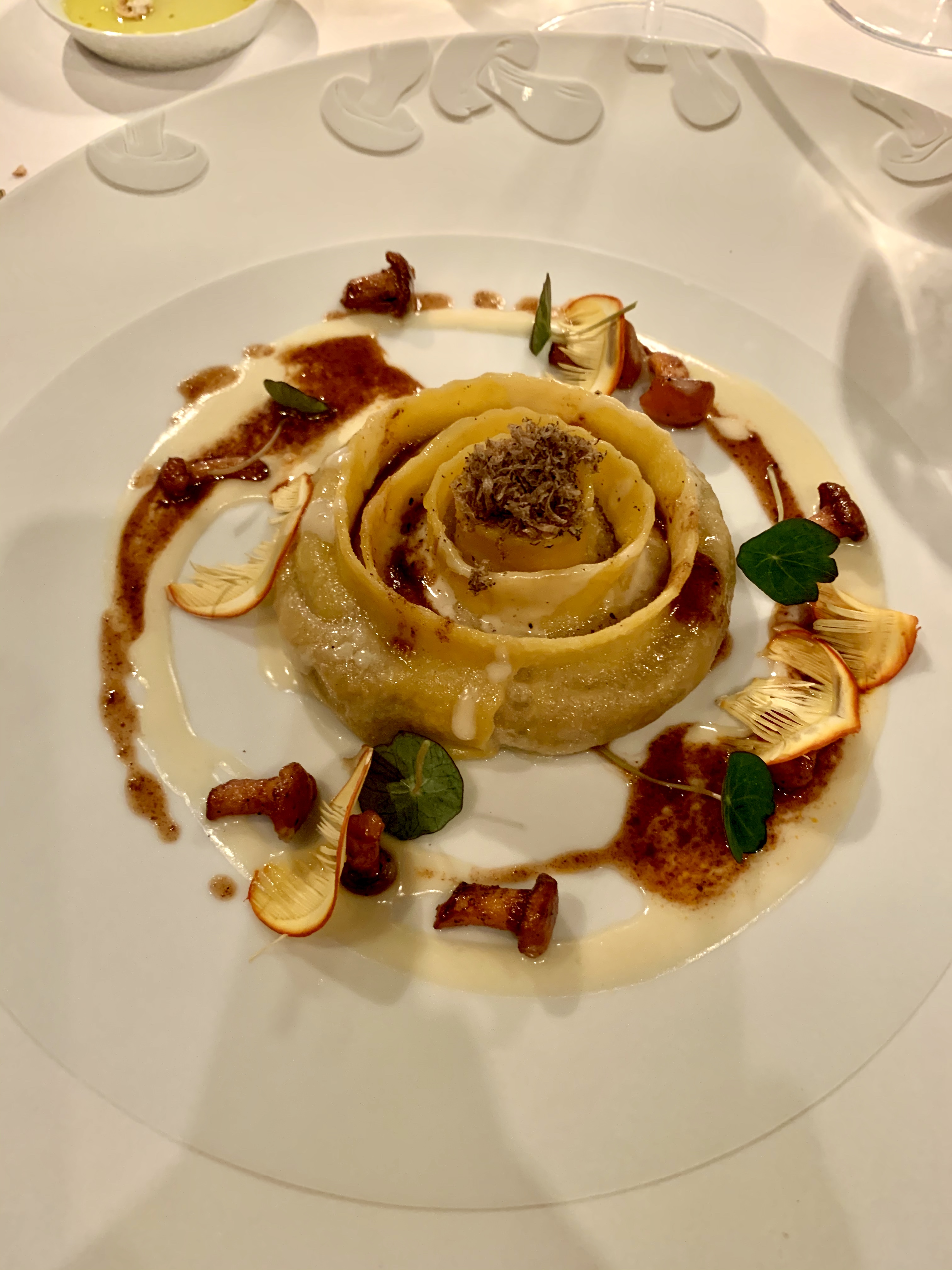 Girotondo di Raviolo – Raviolis farcis au boeuf braisé, crème de Parmesan, jus de viande et truffe noire : quel délice de couper cette folle spirale de raviolis dans toute sa splendeur, telle une fleur. Tout est là pour vous faire vibrer : la parfaite cuisson entre fermeté et moelleux de la pâte, la farce au goût intense d’une viande longuement mijotée, les girolles et les amanites des Césars aux saveurs de sous-bois, le jus corsé de la viande s’allie à merveille avec la crème de parmesan et le tout est sublimé par la truffe noire. Une assiette d’une grande douceur automnale.