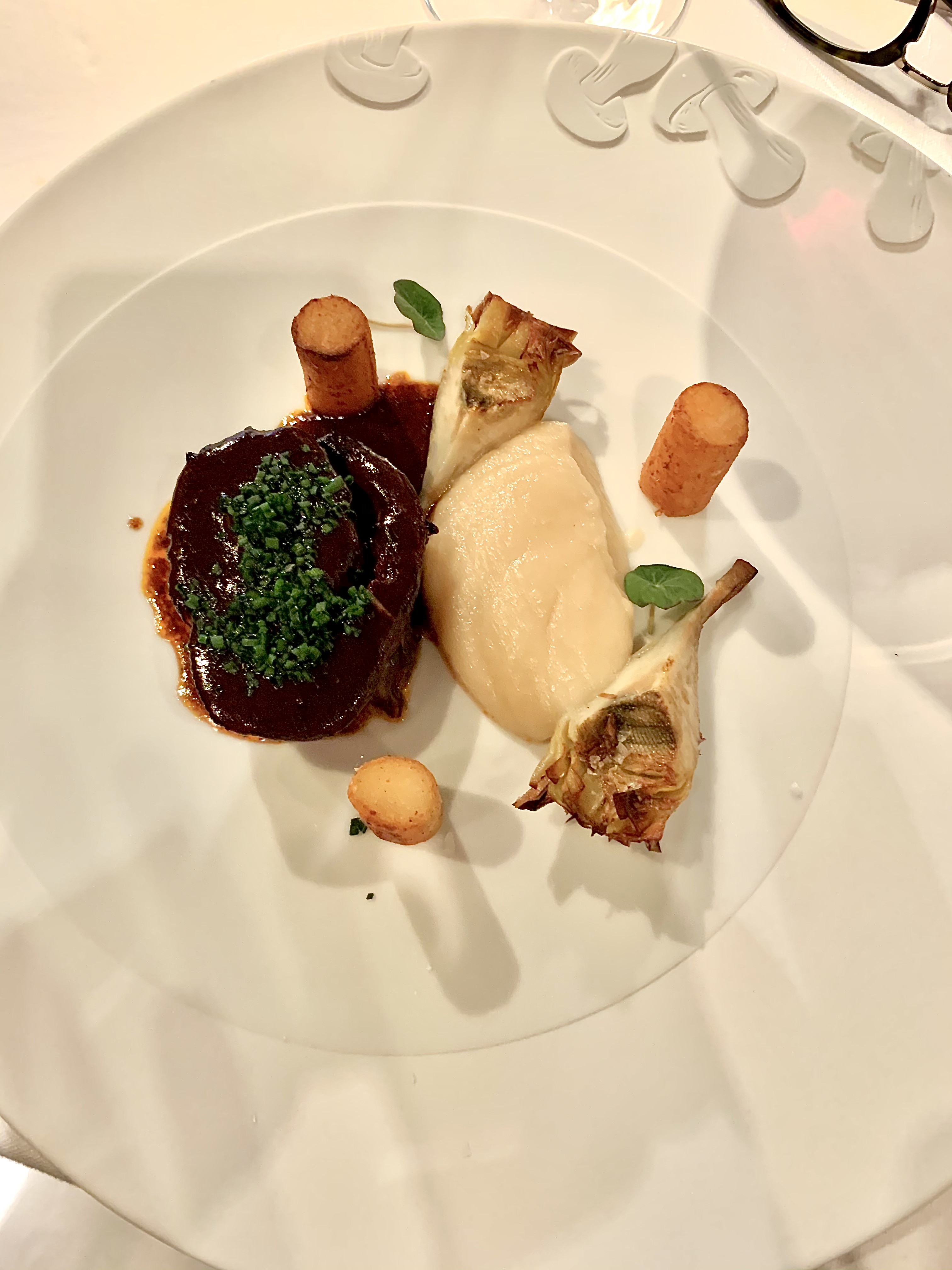 Capretto alla Lucana – Chevreau de lait cuit lentement à basse température, truffe noire, artichauts à la Romaine, purée de topinambours et pommes de terre à la Scapece : la viande est tendre et fondante en bouche et la truffe noire dimensionne et concentre la sauce. Les artichauts à la Romaine apportent une texture croustillante séduisante et la pomme de terre, marinée au vinaigre puis frite, dynamise le tout de gourmandise, comme la voluptueuse purée de topinambours.