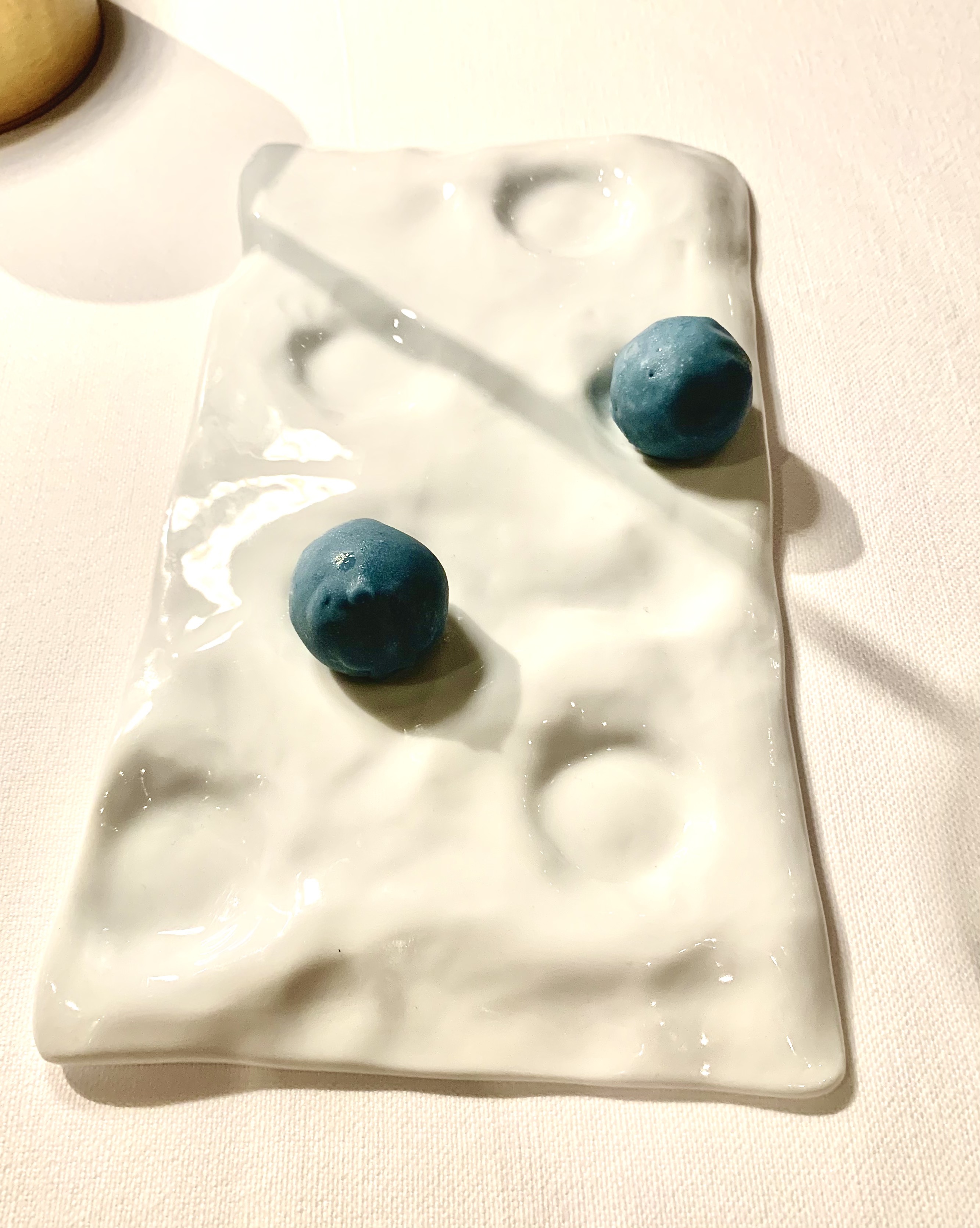 La bouchée de myrtilles en coque qui éclate en bouche est parfaite pour nettoyer et stimuler le palais juste avant de commencer les très visuelles douceurs signées du jeune chef Pâtissier Nicolas Gouiller.