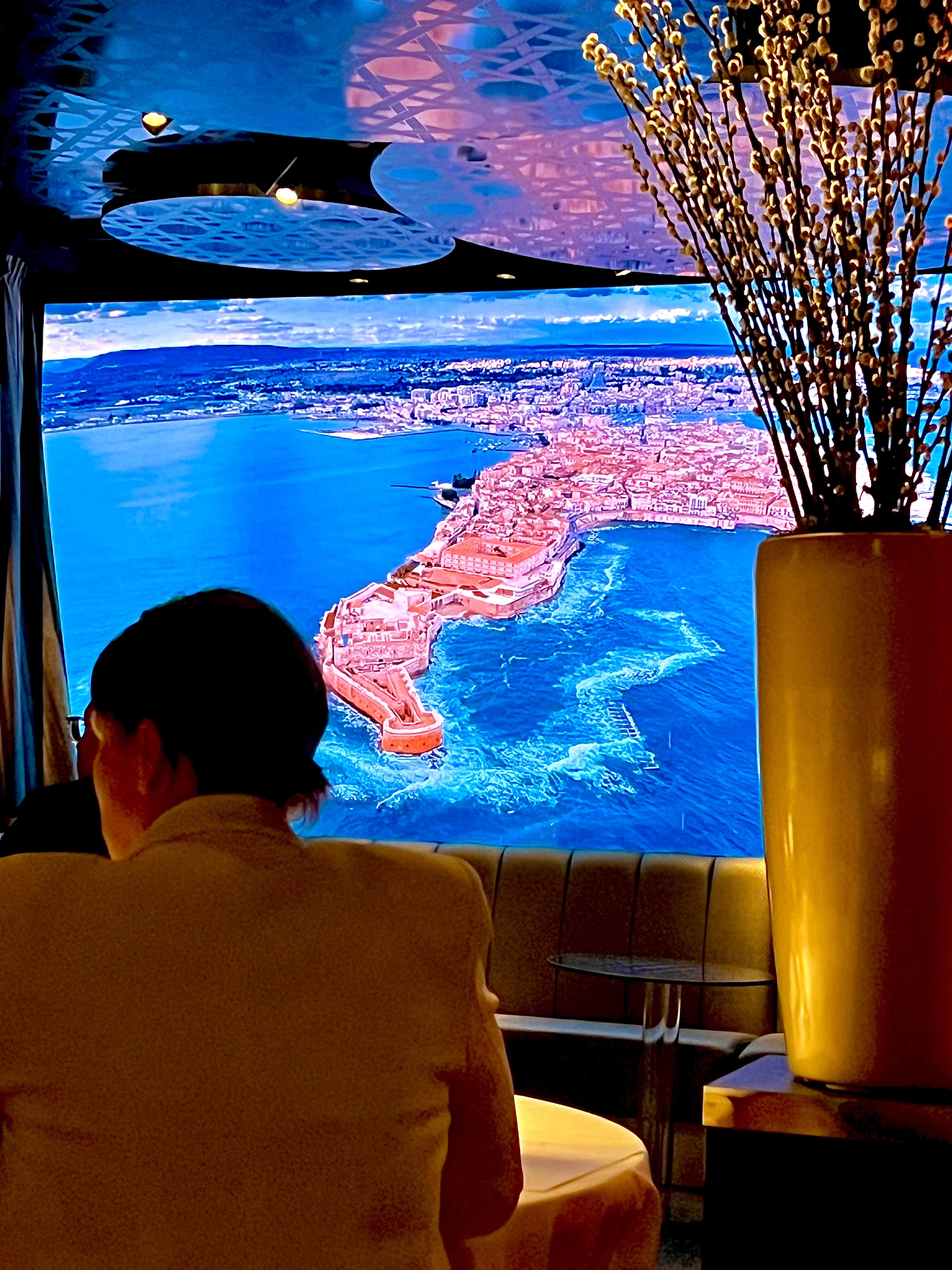 La salle, aux murs laqués de bois de bananiers, gardant secrètement 140 coffres (à ouverture digitale) emplis de cigares ou de bouteilles de vin d’exception pour les clients habitués et membres du « Cigar Club », est un véritable écrin à l’univers onirique d’un voyage dans l’espace ou à 20 000 lieux sous les mers. Les tables dressées au raffinement extrême des arts de la table, en intimité d’une lumière tamisée et diffuse, vous invitent à vivre un moment unique et chic. Un immense écran, tel un hublot ouvert sur l’univers, vous fait voyager au long cours, sous les mers, dans les airs ou dans l’espace… les images de la subjuguante vue de la terre ou d’une baleine dansant en majesté dans les eaux nuit-marine à la lenteur relaxante vous accompagnent en douceur et discrétion tout au long de votre mémorable expérience sensorielle et gustative.