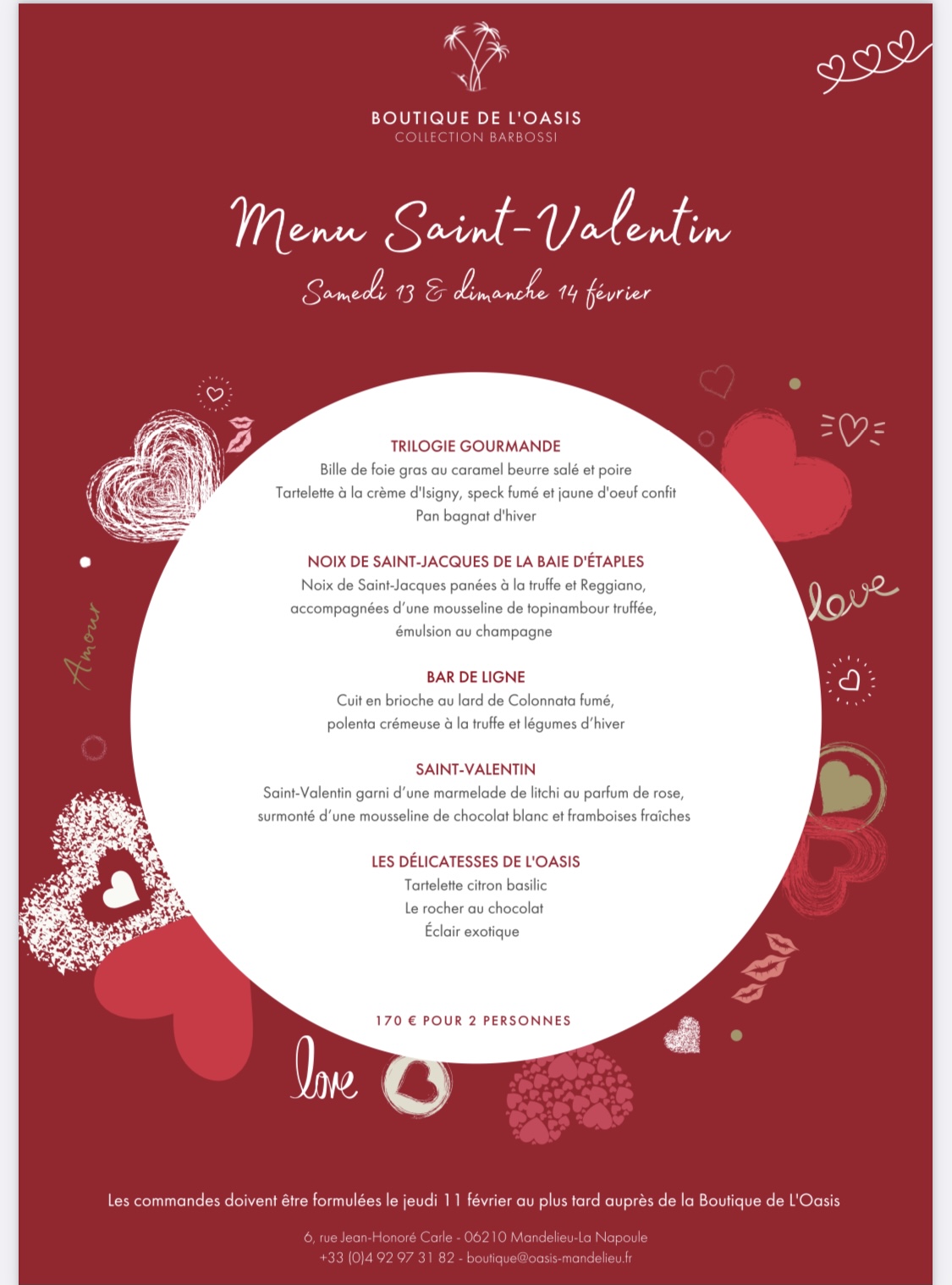 A Antibes, il ne faut pas oublier le chef Jérome Clavel et son menu Le 44 en 6 temps qui débute par un Croustillant de Lagoustine, artichaut et pousses d’épinards, bisque aux baies de Cimes : Menu Le 44. Le Tilleul à Saint-Paul de Vence, vient chez vous avec le menu de saison du chef Olivier Renaud Menu Tilleul. A Biot, le chef étoilé Michaël Fulci aux Terraillers percute avec modernisme et délicatesse les saveurs du Sud avec La Saint-Jacques Crue en carpaccio, vinaigrette au cédrat Et rôtie dans sa coquille Topinambour, ou encore Le filet de veau façon Wellington Petit artichaut en variation Réduction de veau au vin jaune… Menu Terraillers. Au pied des mythiques immeubles en forme de vagues de Marina Baie des Anges, La Flibuste, qui a trouvé sa dimension contemporaine et gastronomique avec l’arrivée de la cheffe Eugénie Béziat et d’une étoile Michelin, délivre un menu de la Saint-Valentin d’une belle créativité qui commence par les Premiers petits pois, oursin, eucalyptus et suivis d’un Tourteau, poireau balayette, oranges blondes de Nice et sanguines du Verger, curcuma du jardin, suivi d’un Bœuf, comme une bresaola, foie gras snacké, blette, bouillon citronnelle du jardin, menthe sauvage séchée, saké, bourrache….. Menu La Flibuste. A la Napoule, l’Oasis reprend une vie et une intention gourmande avec le chef Nicolas Decherchi et la boutique-épicerie à emporter. Menu Oasis. Le chef Bessem à Mandelieu La Napoule démontre sa passion créative au travers de son menu. Menu Bessem.