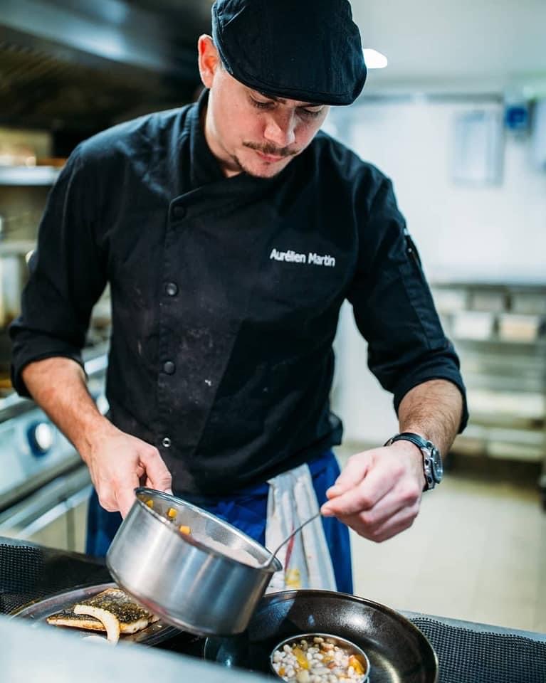 Aurélien Martin, dans son restaurant Le Panier du Vieux-Nice, a créé un menu en 4 services avec un Duo de Saint-Jacques et effiloché de crabe, vinaigrette de clémentine et émulsion d’encre de seiche fumée et un Filet de canette, sauce chimichuri, crémeux de panais à la réglisse, panais rôti au sirop d’érable. Menu Panier.