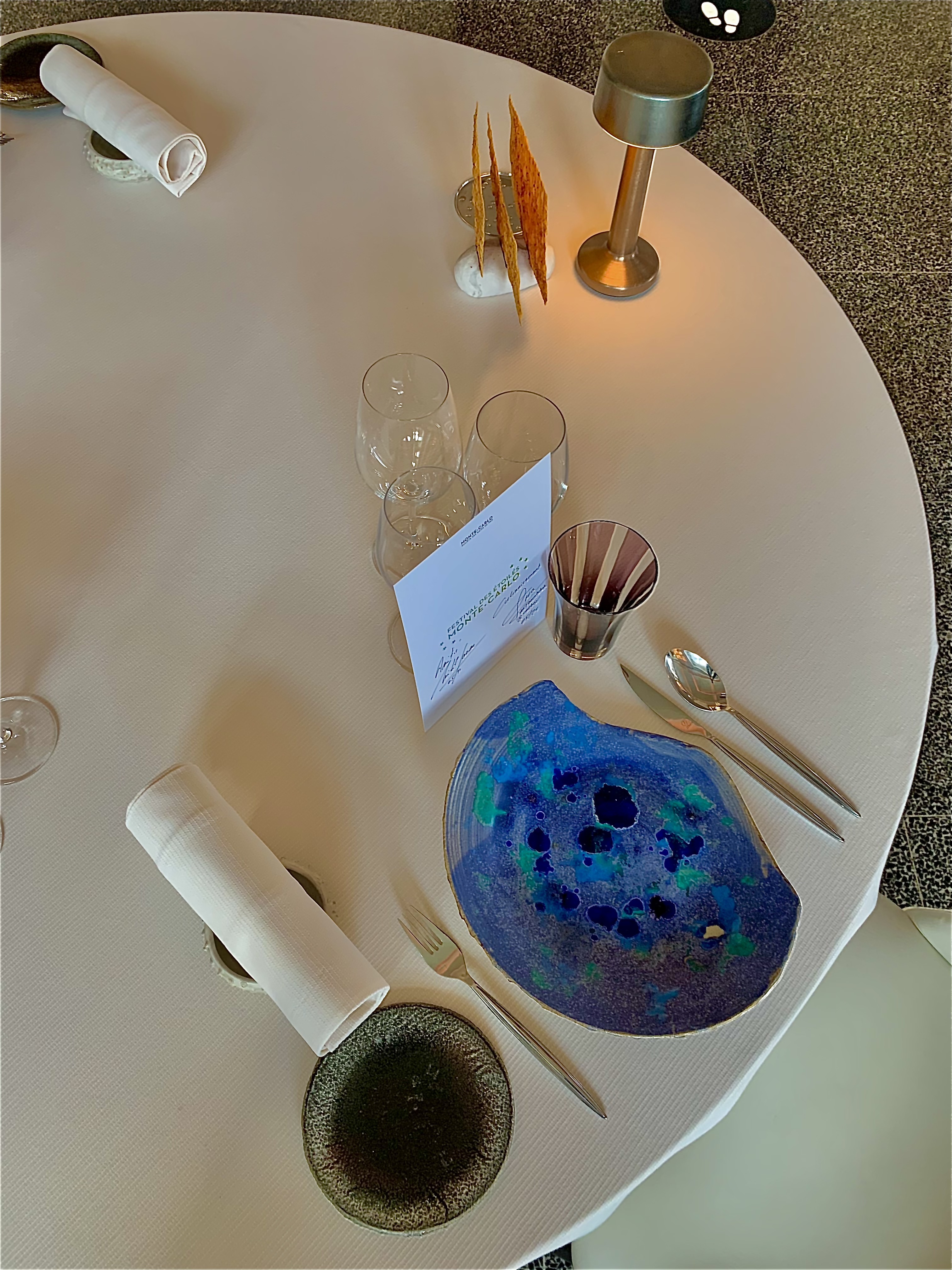 Les assiettes de présentation, qui sont des pièces uniques de la céramiste Peggy Desmeules-deniot, racontent la Martinique du chef (le bleu intense de la mer et des profondeurs accidentées des coraux, de la terre volcanique et vivante de l’île) et donnent une intense identité à la table.