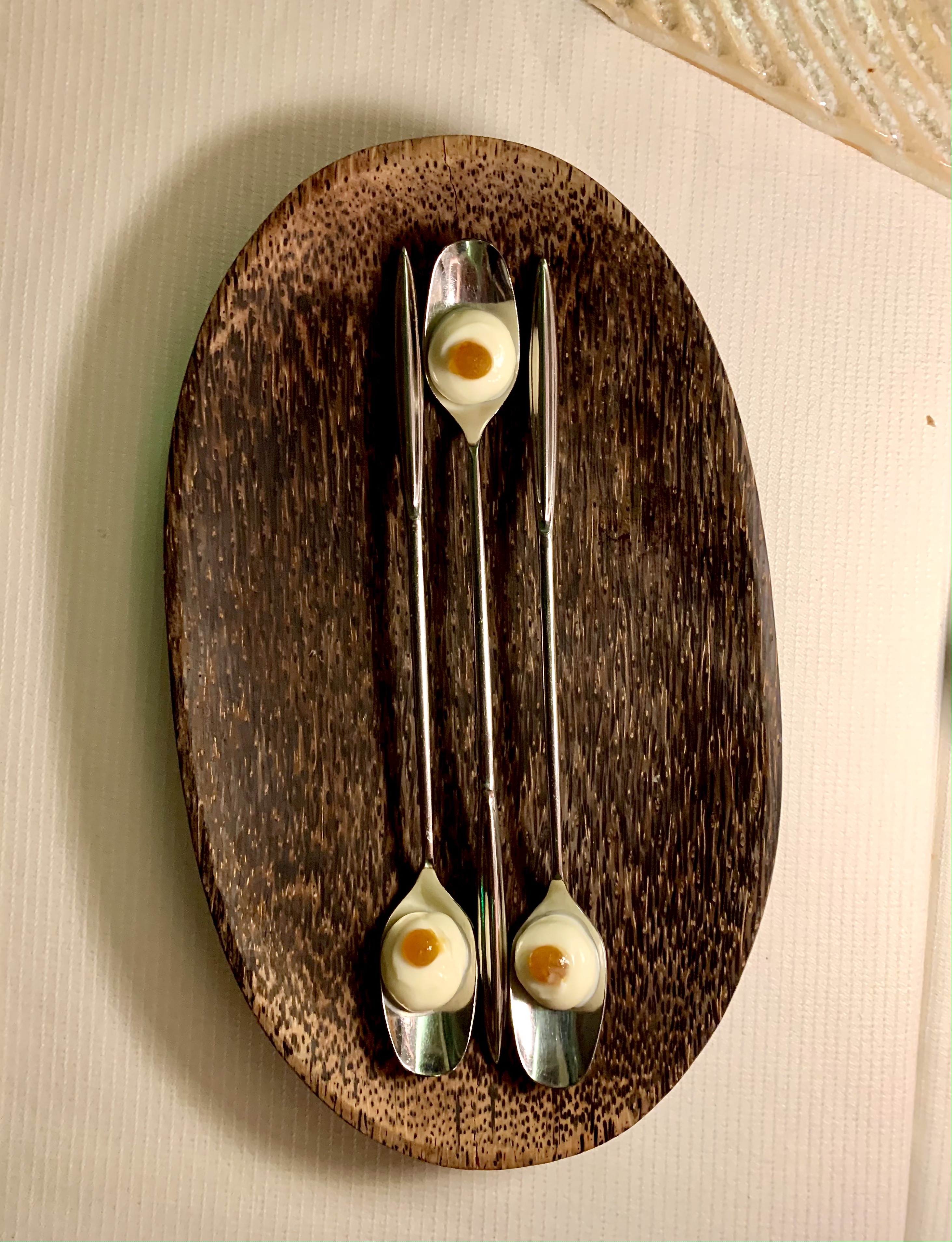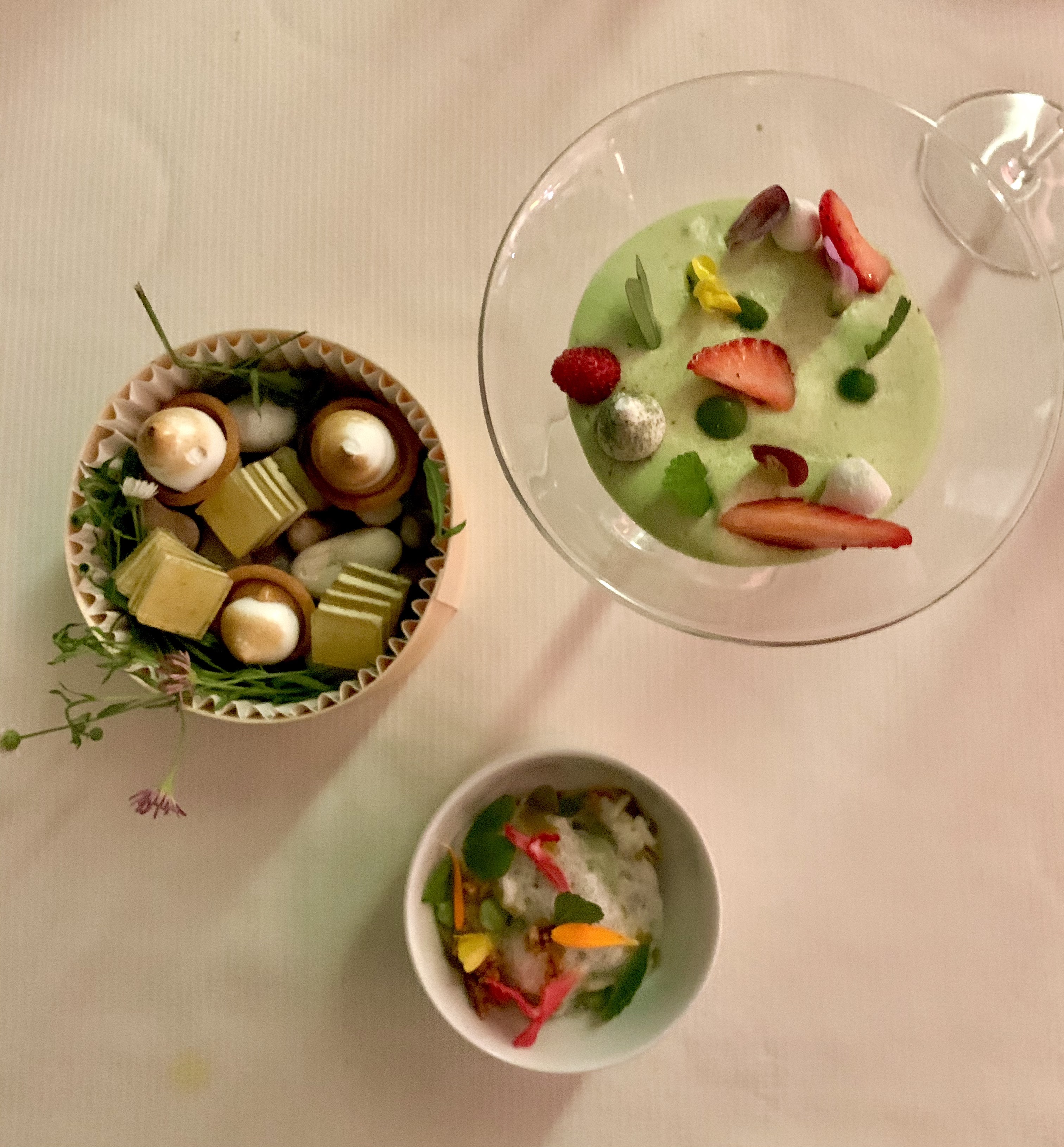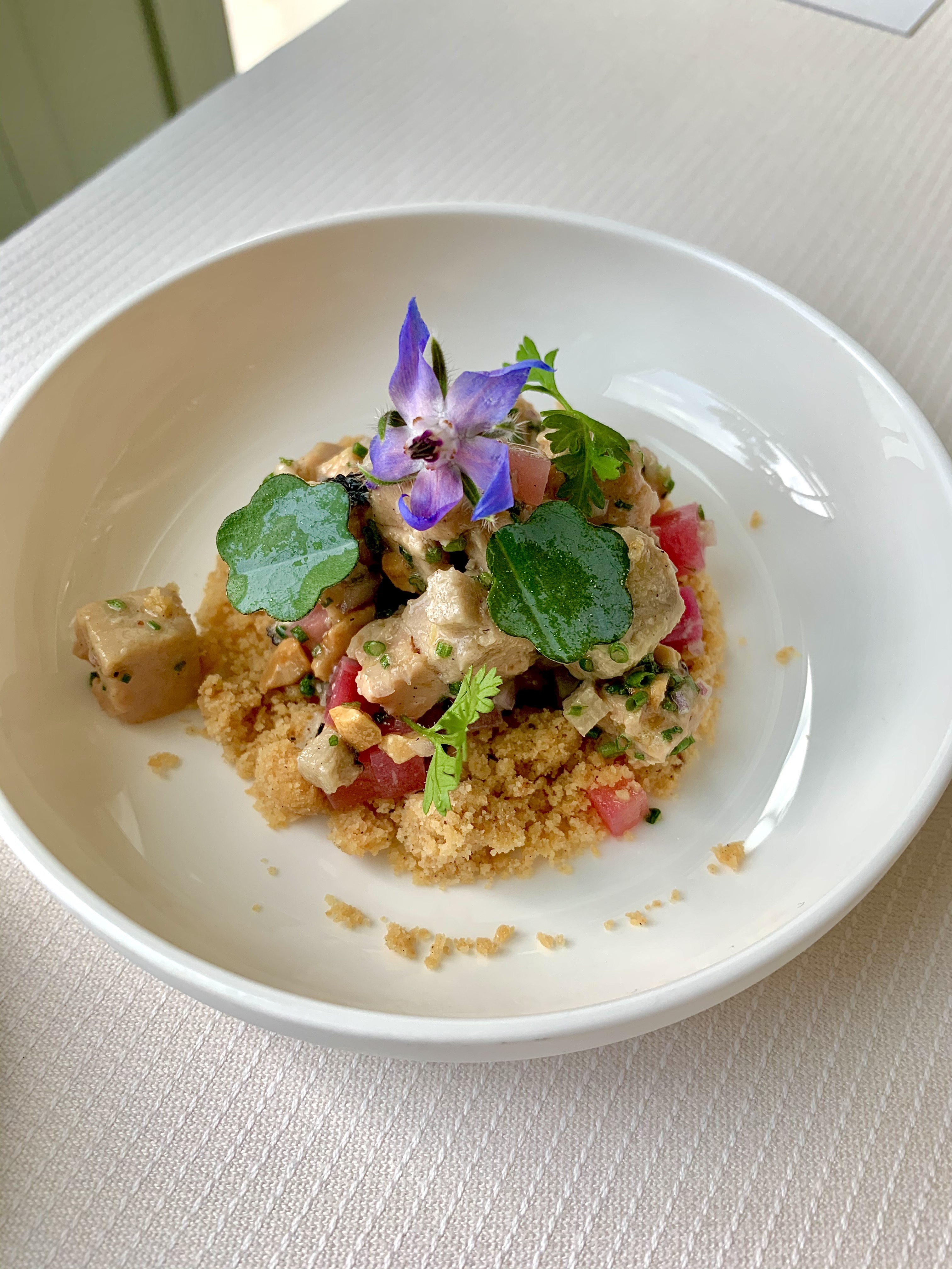 Tout commence par une décoction d’herbes aromatiques et tagette, une façon de nettoyer et de préparer le palais pour une intégration harmonieuse des papilles à la suite du repas avec cette fraîcheur appétante.