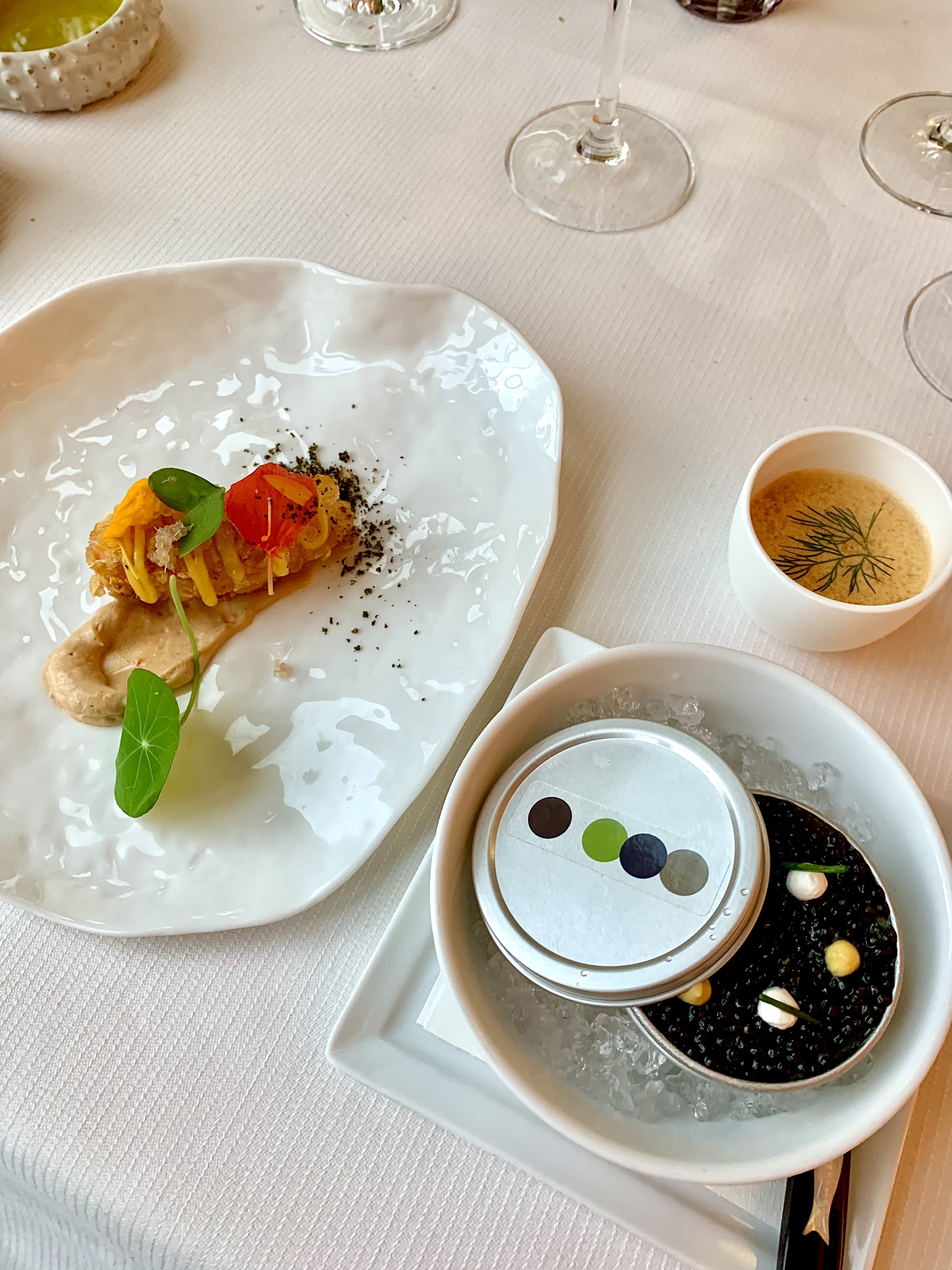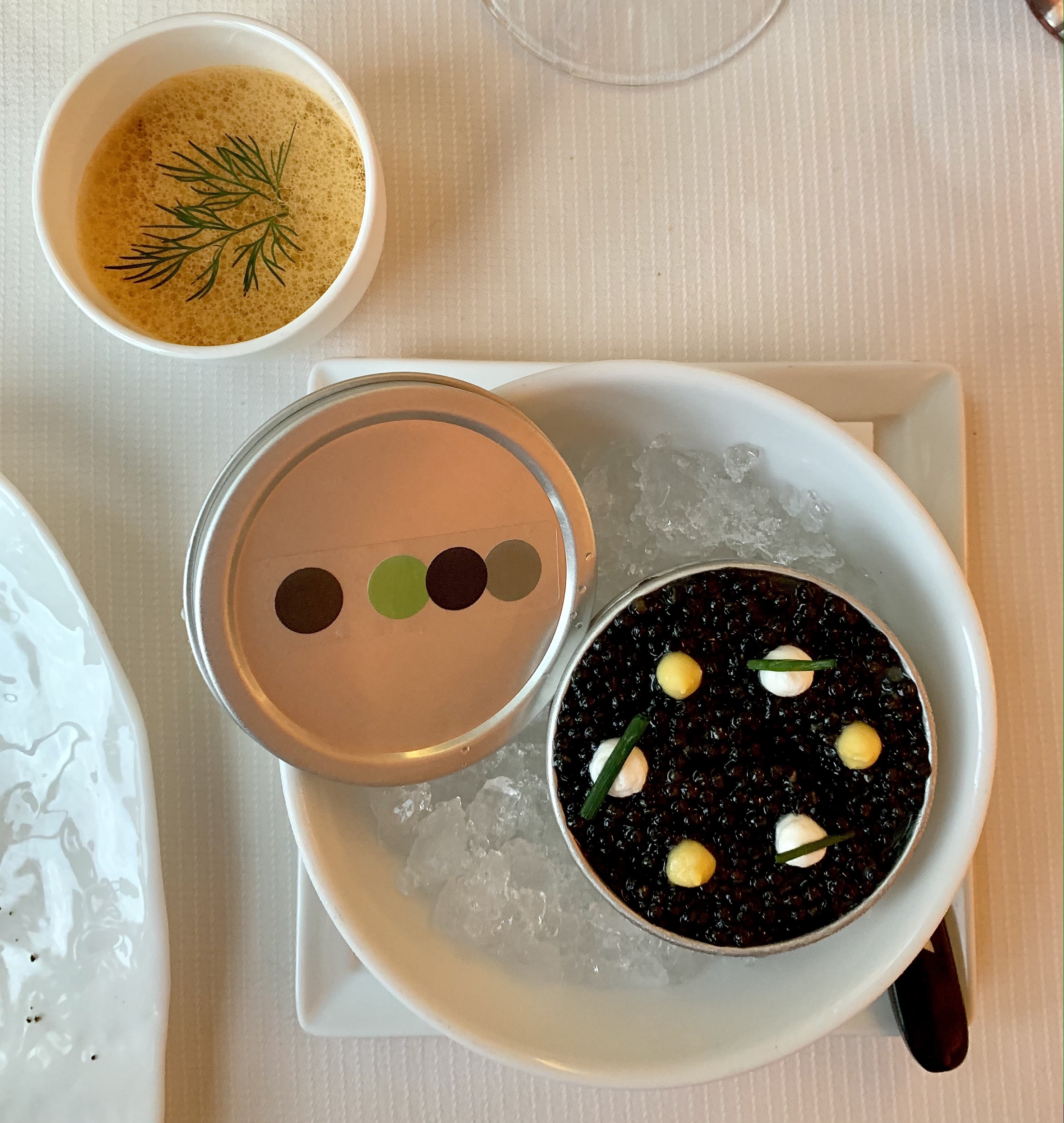 Langoustine marinée à l’huile d’argan, artichaut au corail, caviar d’Aquitaine crémeux à l’armagnac (Michel Sarran), le regard est intrigué de cette généreuse boîte de caviar d’Aquitaine au noir profond, parsemé de pointes de couleur. Une fois la cuillère de nacre plongée, la langoustine se dessine de sa personne, enrobée de son léger voile noiseté d’argan, elle s’exprime en délicatesse et raffinement et est merveilleusement rehaussée de l’espiègle crémeux d’artichaut et corail qui fait frémir de bien-être. Les têtes des langoustines ont été travaillées en une ravigorante écume, qui se transforme par strates, en une fine émulsion crémée armagnac. Les champignons noirs apportent une légère mache qui finalise le tout en délice iodé.