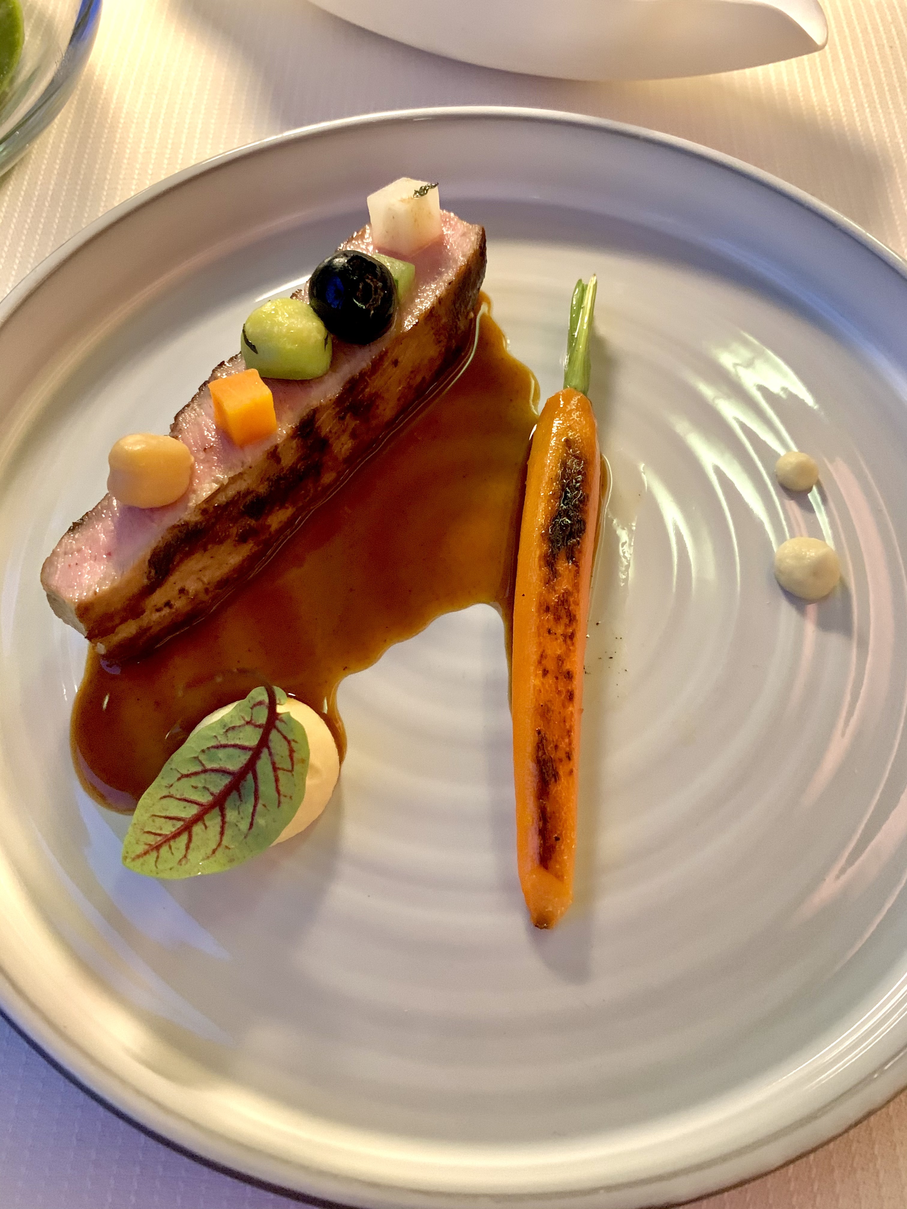 Selle d’agneau marinée au bouillon de couscous, puis rôtie, tartare aux saveurs de l’Asie (Michel Sarran), l’agneau est fondant et croustillant à la fois, avec ce goût si plaisant du rôti des souvenirs d’enfance, l’intense jus résonne des saveurs épicées d’Orient, la menthe réveille de sa fraîcheur et la myrtille de sa douce acidité. La très parfumée carotte entière, presque a cru semble tout droit sorti de son champs et se donne dans une fausse simplicité. Les billes de courgettes et la purée de pois-chiche répliquent d’une identité du bouillon couscous. Le tartare d’agneau, servi à part, nous transporte dans la minutie des saveurs japonaises d’une huile de sésame en pointe, soutenue des herbes aromatiques. La croustillante chips de pomme de terre, travaillée en « Chipster » est le clin d’oeil régressif et plaisant du chef Sarran.