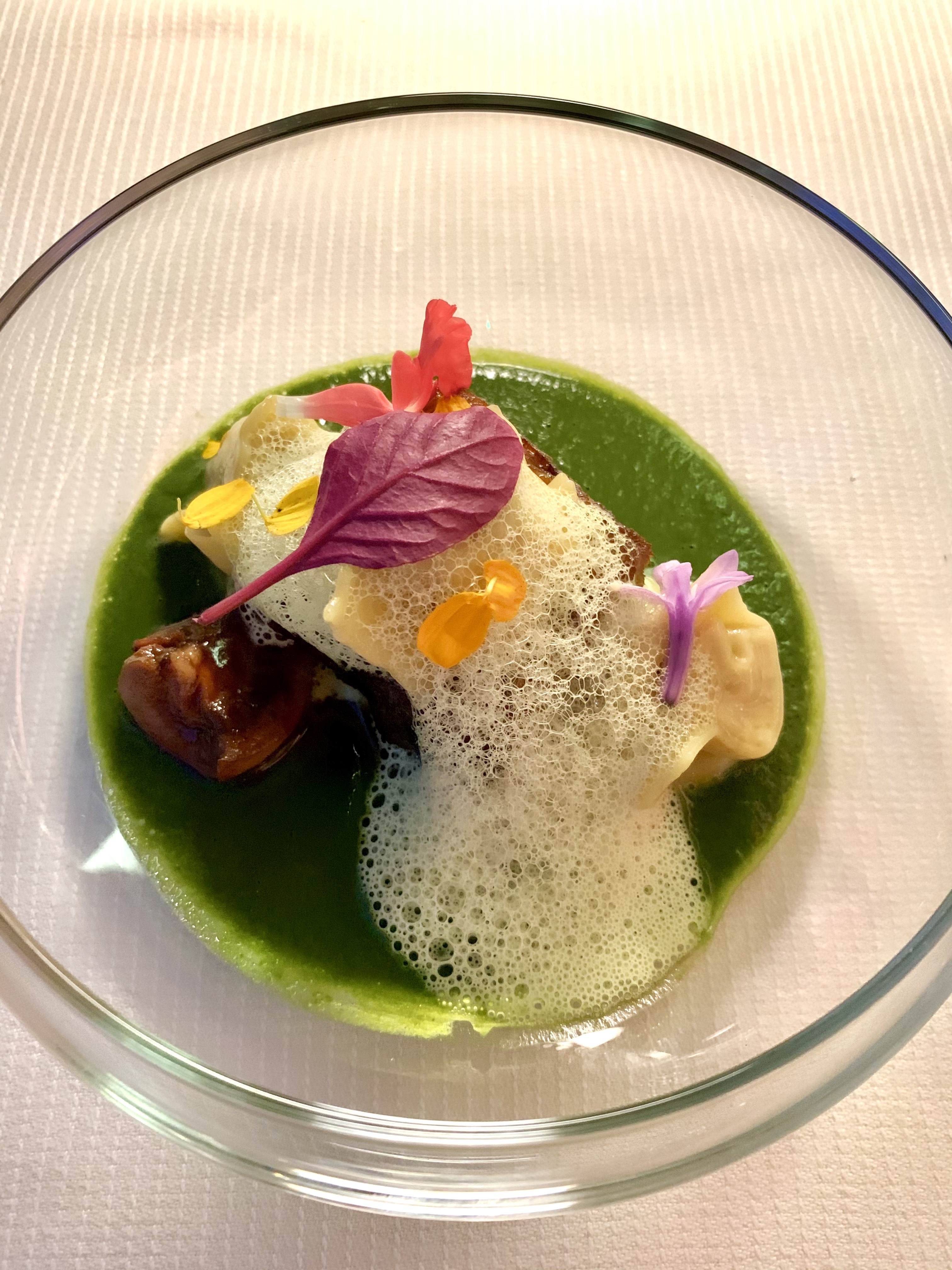 Agnolotti d’épaule aux blettes & ricotta, curry vert floral (Marcel Ravin), toute l’infinie gourmandise créative tient dans ces petits raviolis bombés de farce d’un intense effiloché d’agneau. La blette et la ricotta chantent la Riviera et le curry vert dimensionne en crescendo d’un époustouflant équilibre de puissance en bouche. La fraîcheur percutante des saveurs herbacées s’accompagne de la fine force du rognon.