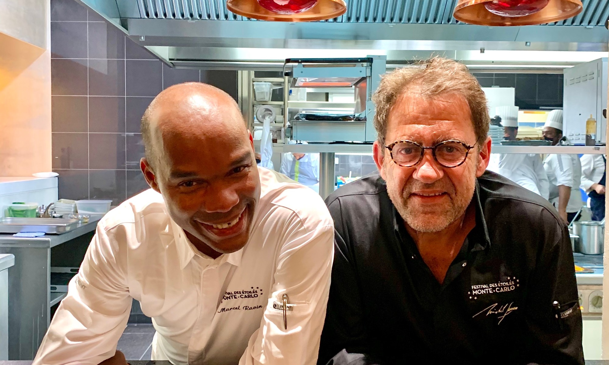Marcel Ravin, quant à lui, véritable coqueluche des gourmets de la Principauté et de la région depuis son arrivée en 2005 au Blue Bay où il a obtenu 1 étoile au Guide Michelin en 2015, a construit sa mémoire culinaire en goûtant les plats de sa Grand-Mère « Yvanesse », en la regardant, s’imprégnant et reproduisant ses gestes, en l’écoutant parler de la terre, des légumes, des épices, le sensibilisant au « Bon-Manger ». Après un passage par l’école Hôtelière en Martinique et le diplôme en poche, Marcel Ravin décide de se former et de partir en Métropole à l’âge de 18 ans. Il débute son apprentissage en Alsace au Château d’Isembourg où il apprend à travailler des produits alors encore inconnus pour lui, il fréquente les marchés locaux, part à la rencontre des producteurs pour mieux comprendre, il note, s’inspire sans cesse de la nature environnante… puis il travaille quelques temps au Frantel, un restaurant étoilé à Nancy, et devient sous-chef à Metz dans un établissement également étoilé. Il est ensuite sous-chef du Méridien Part-Dieu à l’Arc-en Ciel, sous l’égide de Christian Lherm durant 5 années, puis il part s’épanouir en Belgique, au Méridien de Bruxelles, où il fait une rencontre décisive pour la suite de sa carrière en la personne de Sergio Mangini, qui lui fait confiance et décèle en Marcel Ravin, une fougue, une passion et un désir fou de s’exprimer. Lorsque celui-ci prend la direction du Monte-Carlo Bay, il lui propose de devenir le chef du Blue Bay au très balnéaire Monte-Carlo Bay & Resort, avec le dessein d’obtenir une étoile. En 2016, il ouvre sa table de coeur : La Table de Marcel, véritable retour aux sources dans son île natale du côté de Fort de France et il retourne à Lyon pour ouvrir en 2018 une adresse qui lui ressemble, bistronomique, chic et branchée, Le Grand Réfectoire dans le Grand-Hôtel Dieu qui a repris vie. En été 2019, il ouvre au sein du prestigieux et nouveau quartier du Luxe, One Monte-Carlo, une brasserie contemporaine, tendance et invente la « Snackonomie » et les « Apéro-Thérapie » chics et savoureux au Mada One. Ses Brunchs au sein du Monte-Carlo Bay & Resort sont assurément les plus prisés et recherchés de la Principauté. Les plats du partage, tel le poulet rôti du week-end à l’Orange Verte sont tout autant appréciés des familles. Marcel Ravin a su, en quelques années, susciter une véritable « Marcelmania » auprès des gourmets avertis de la région, tout en gardant la vérité et l’authenticité de sa cuisine. C’est une cuisine d’instinct, emplie d’émotion, qui raconte sa Martinique, si chère au coeur du Chef, sa propre histoire, celle des plats de sa grand-mère, les épices, les ingrédients de son enfance, qui signent une identité vibrante et sincère. Il y mêle les légumes de son propre potager (situé dans l’enceinte de l’hôtel car il aime ce contact avec la terre) et les produits locaux très Riviera, en les subjuguant d’un subtil et percutant relief caraïbe, tout en gardant leur âme et essence même, ce qui crée véritablement d’incroyables émotions.