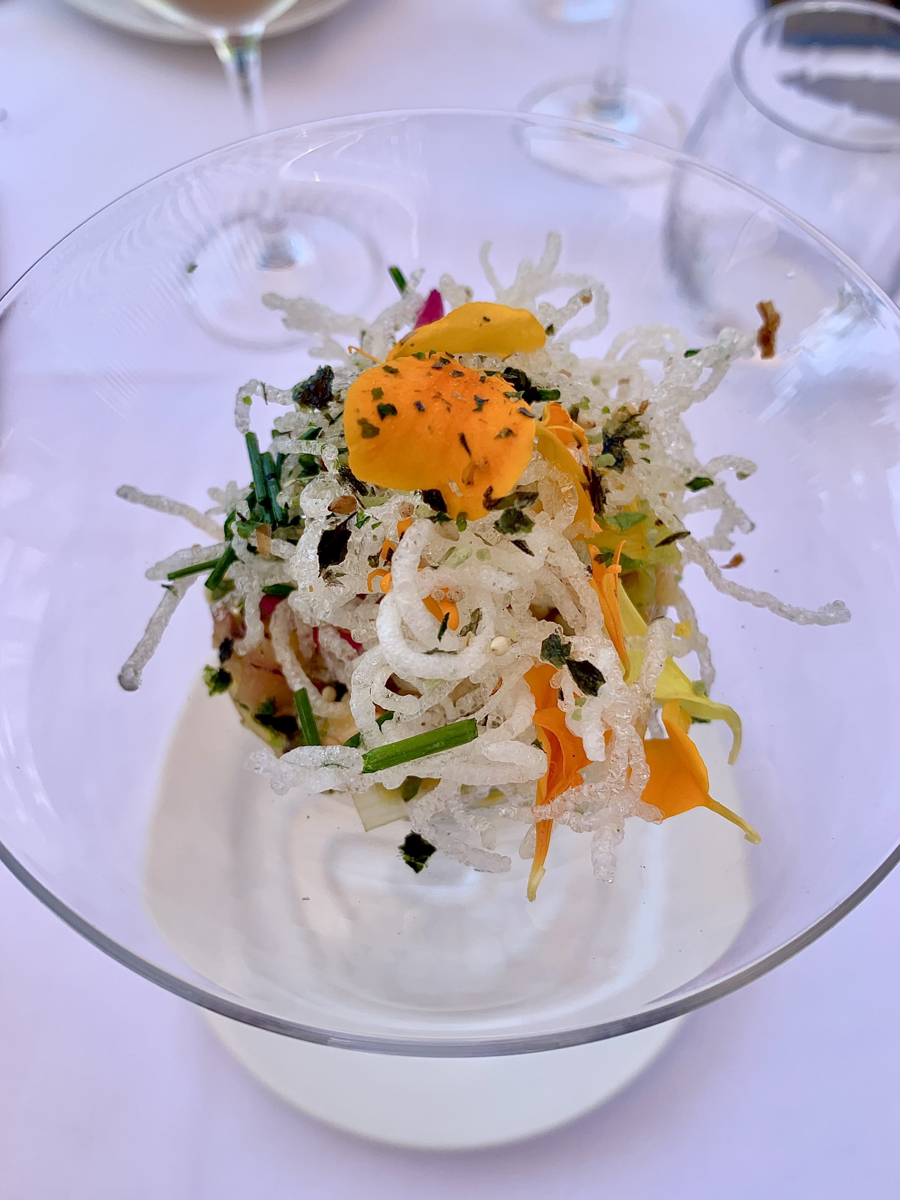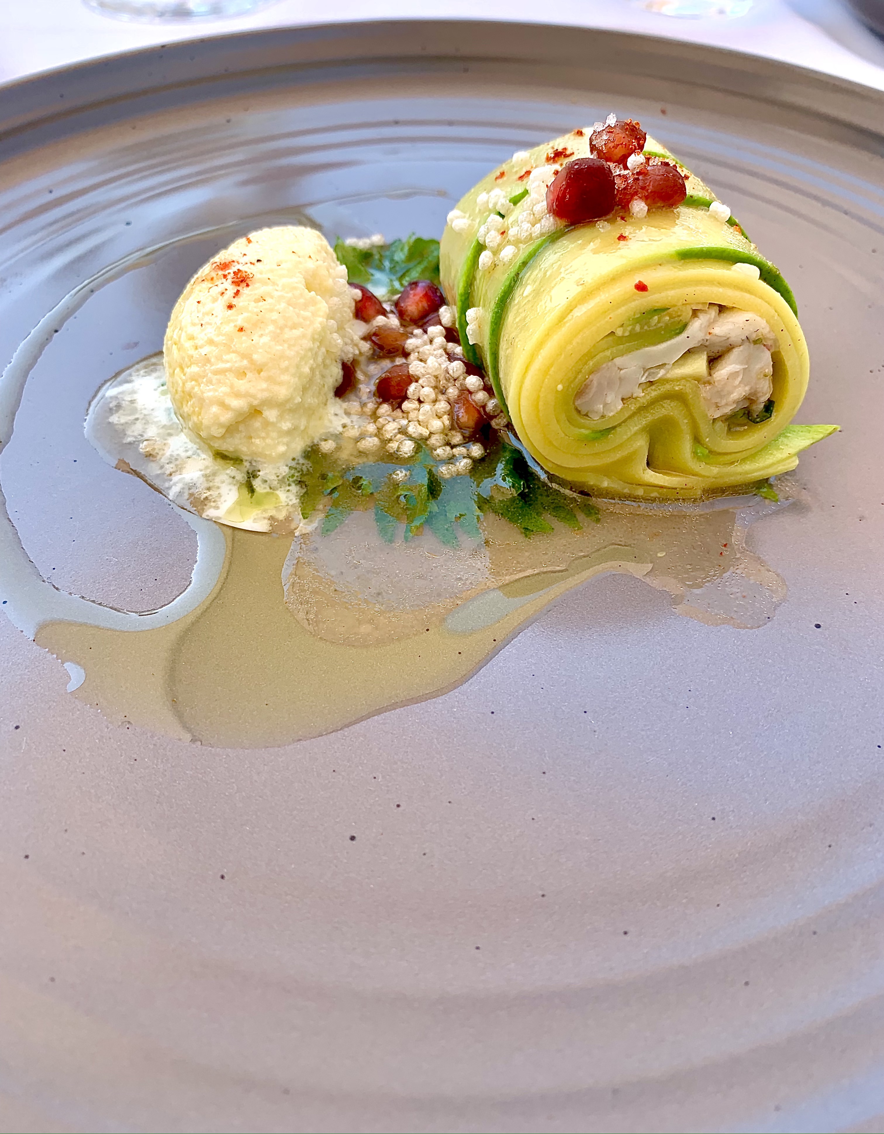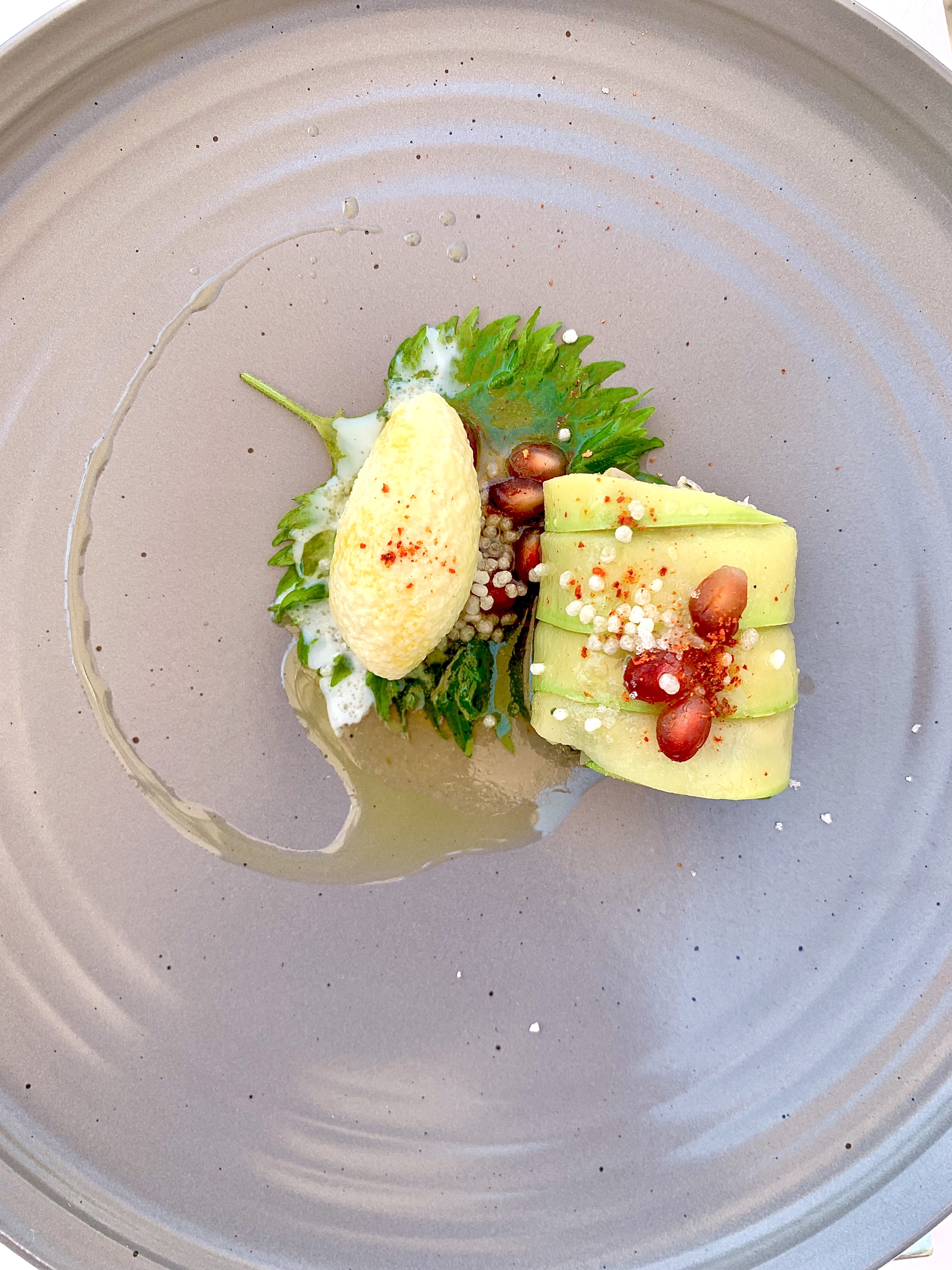 Le Ceviche de Dorade royale, vinaigrette de grenade punchée au citron vert, courgette violon, sorbet acidulé à l’huile d’olive, la première entrée installe le menu dans la saison avec cette courgette violon d’une texture en croque, la dorade en tartare se dévoile en discrétion de sa belle mâche, la vinaigrette de grenade pulse parfaitement le tout. La feuille de shiso délivre son potentiel herbacé et poivré, les billes de riz soufflé insufflent ingénieusement de texture asiatique. Le sorbet à l’huile d’olive est la douceur suave.