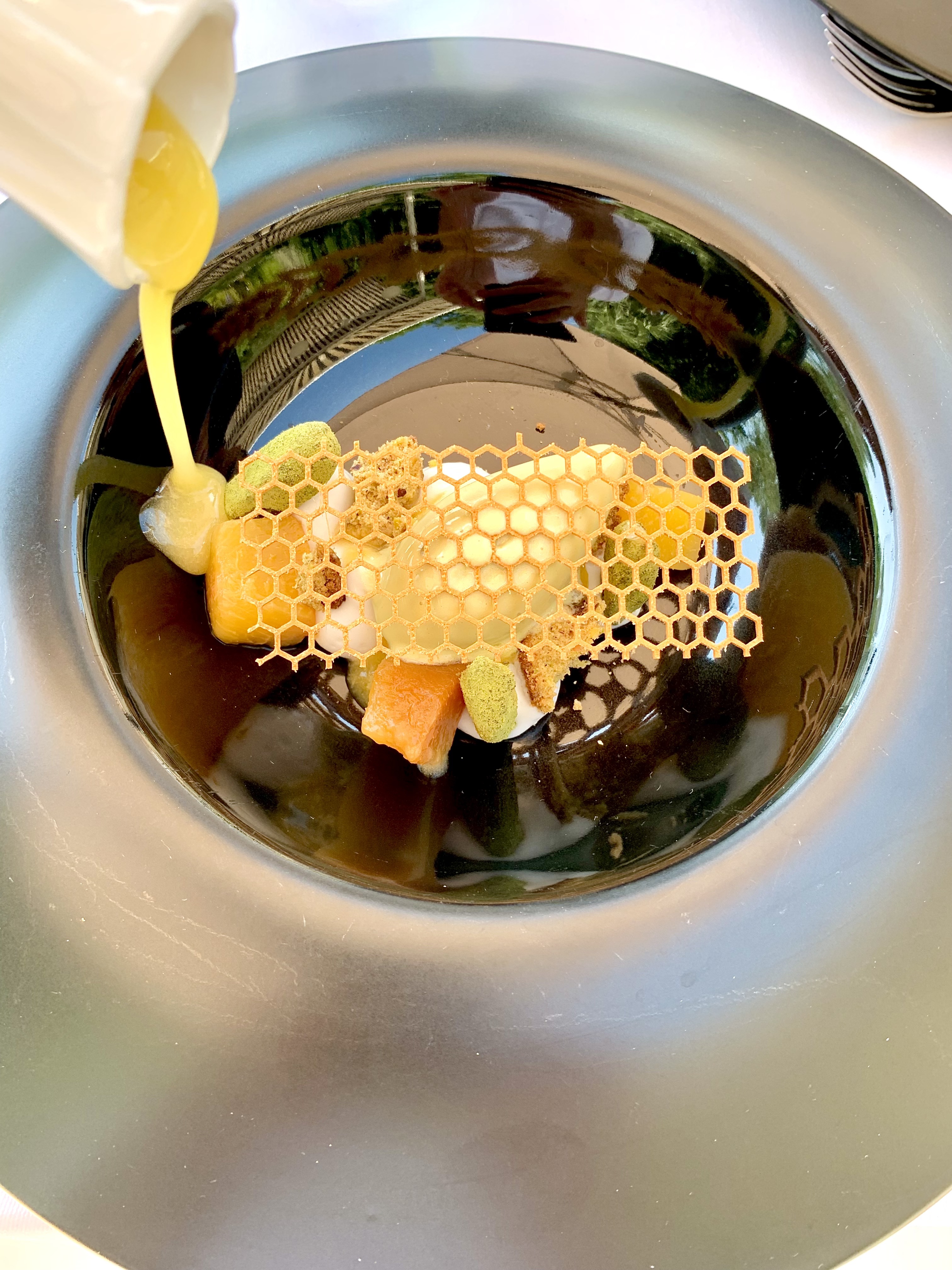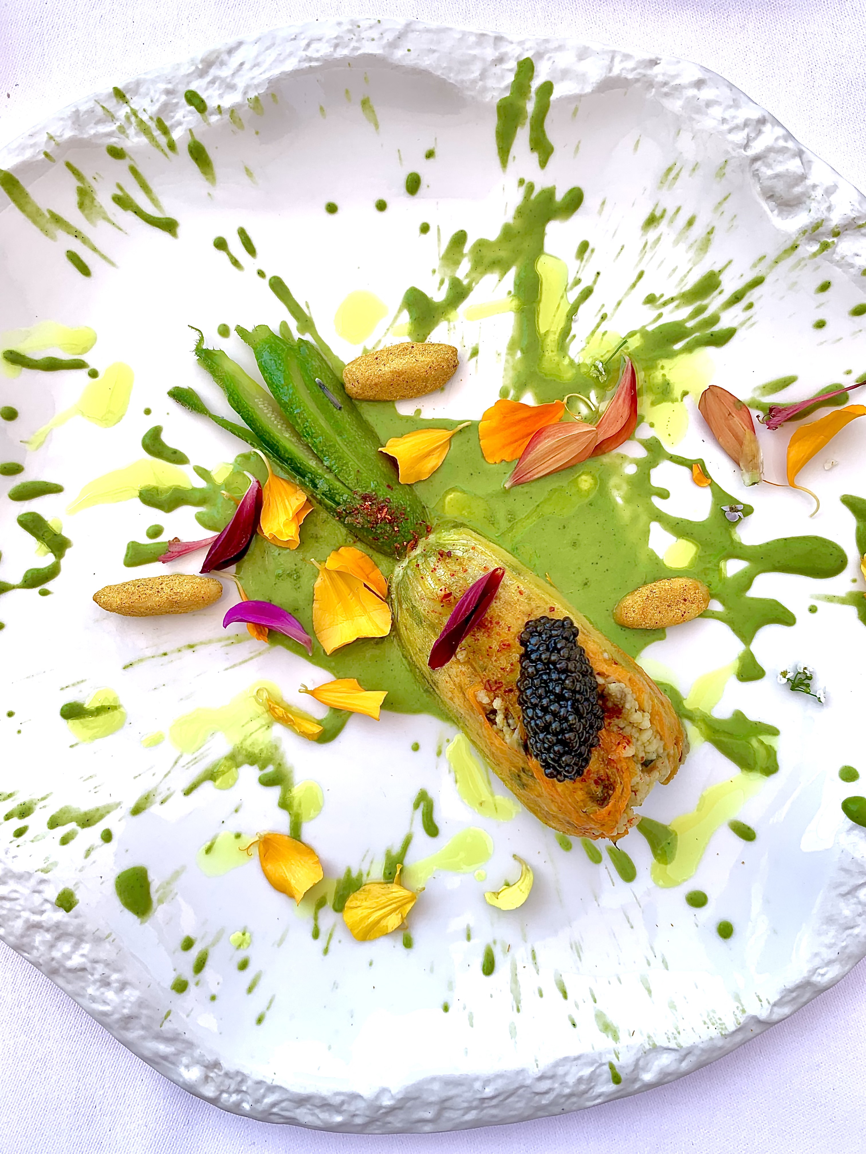La Fleur de courgette et Caviar Osciètre Impérial Green 100% naturel, en surprise de fraîcheur de tomates anciennes, huile de coriandre et curry, noix du Pili de Philippines, est une assiette au visuel d’un « dripping », aussi percutant qu’une toile de Jackson Pollock à la saveur explosive. La fleur de courgette est farcie d’un léger boulgour rafraichi de tomates anciennes, le caviar est tel un bonbon d’iode, qui dimensionne. La noix Pili a la facette d’un « croque et pique » et l’huile de coriandre et curry unifie l’ensemble.