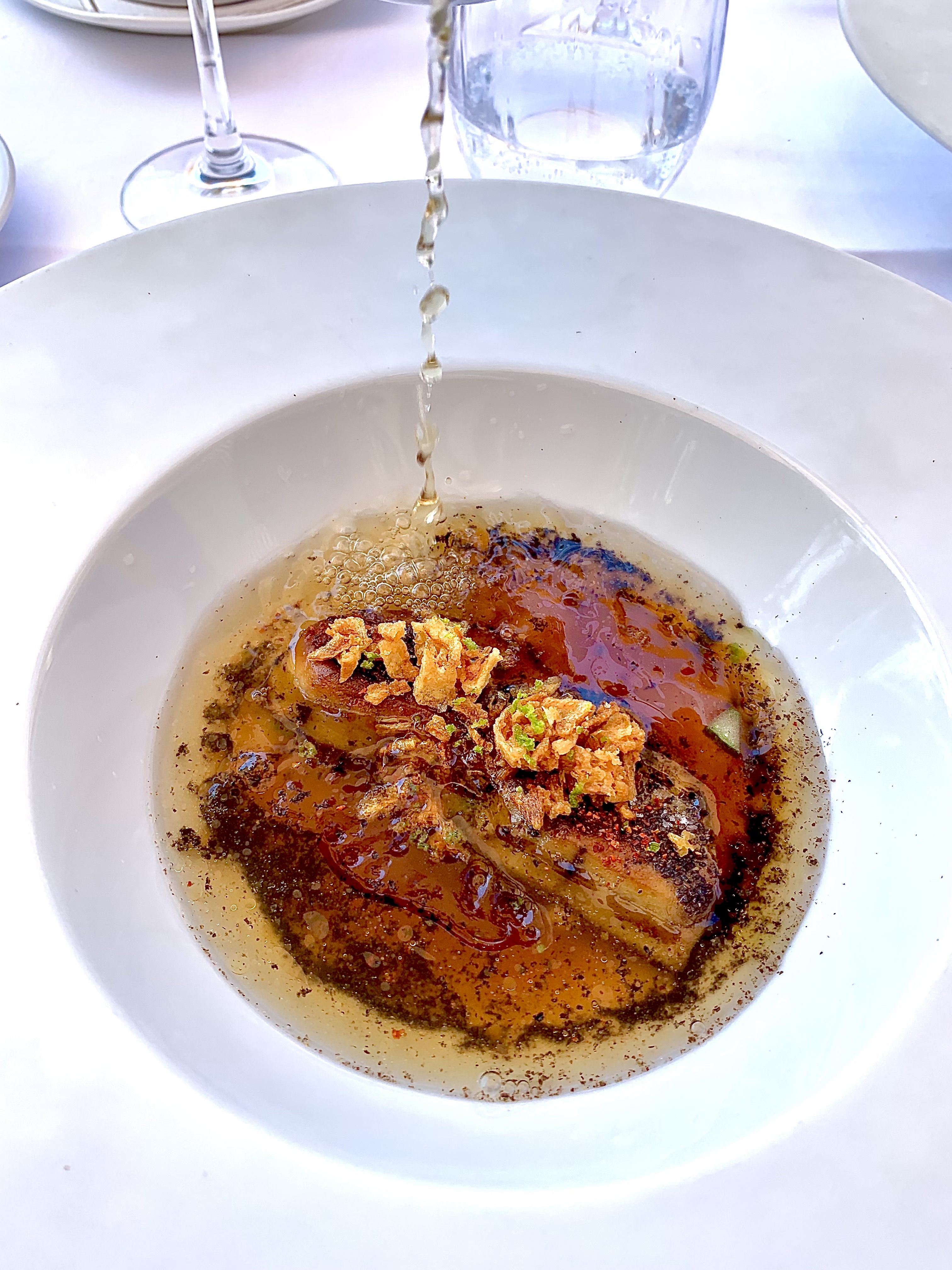 Le Foie gras en escalope, poivre de Timut du Népal, perles du Japon, zeste de combawa, consommé au Dashi, une des entrées emblématiques du chef, qui démontre son aptitude à composer des assiettes d’une grande gourmandise, raffinées, où les parfums se combinent les uns avec les autres pour beaucoup de justesse et de légèreté. Le bouillon Dashi, d’une subtilité exemplaire, est assurément le parfait trait d’union des saveurs et des textures en bouche. C’est fondant, c’est »crispy », c’est moelleux et cela titille les papilles avec pertinence.