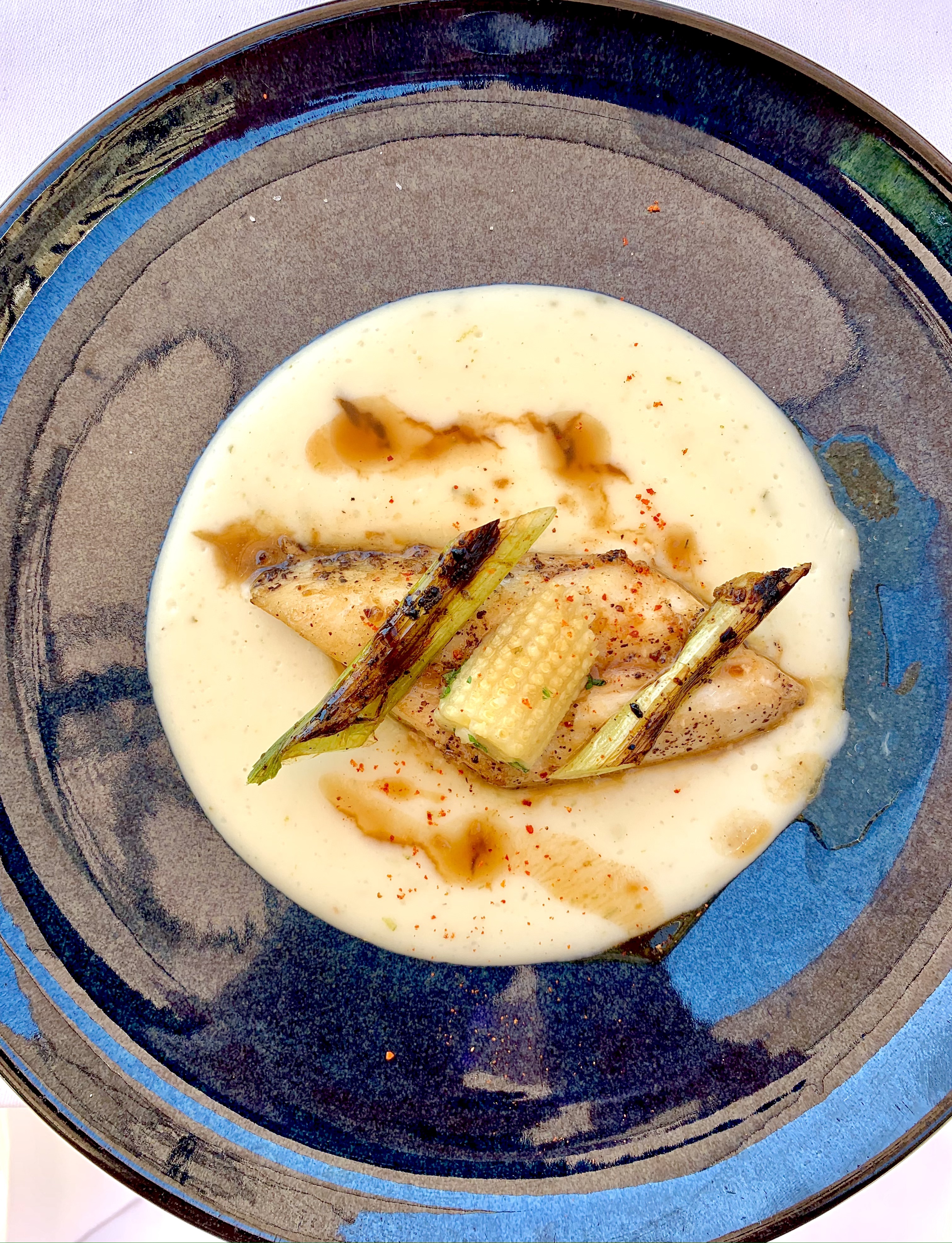 Le Saint-Pierre grillé au charbon, parfumé au sumac, crémeux de riz basmati, pousses de maïs, cébettes, jus de Ponzu-Yuzu. Le poisson signature du chef raconte un peu de son enfance et des souvenirs d’une crème de riz réconfortante que lui préparait sa grand-mère, tel un remède de douceur. Le crémeux de riz est ici intensément vivifié de ponzu-yuzu et accompagne le Saint-Pierre, au goût de feux de bois, laqué à la manière de l’Unagi (anguille japonaise). L’ensemble s’assemble et se rassemble à merveille en bouche.