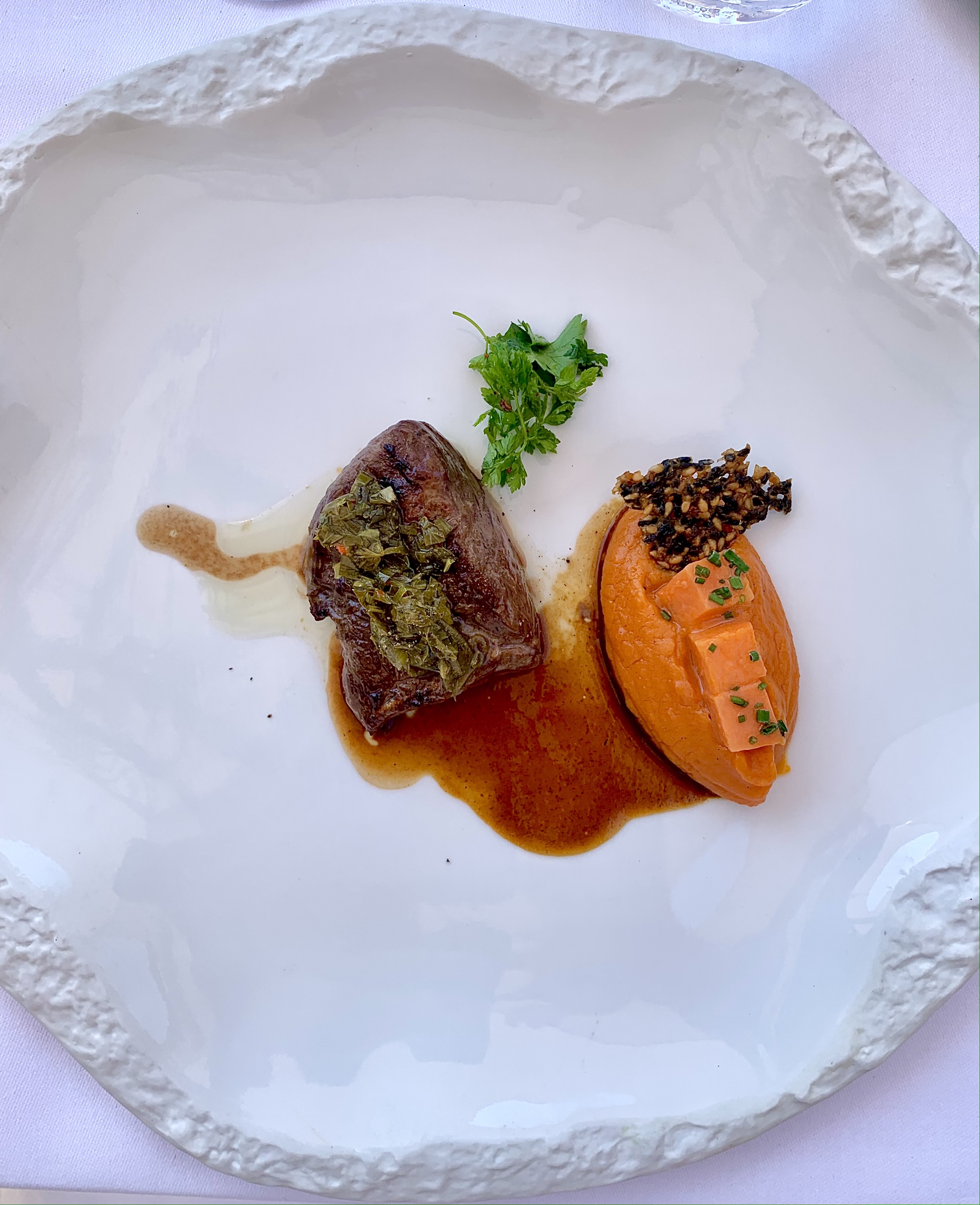 Le Bœuf Angus dans le filet , laqué au barbecue Hibachi japonais, patates douces et vanille lissées, sauce Chimichurri, le plat de viande signature du chef, est à nouveau une parfaite interprétation des mondes de saveurs, le boeuf est cuit sur le traditionnel barbecue japonais et percuté du condiment herbacé sud-américain, le chimichurri. La purée de patates douces se réveille d’une douce vanille et la tuile de sésame caramélisé, rappelle les gourmandises des fins de repas en Asie.