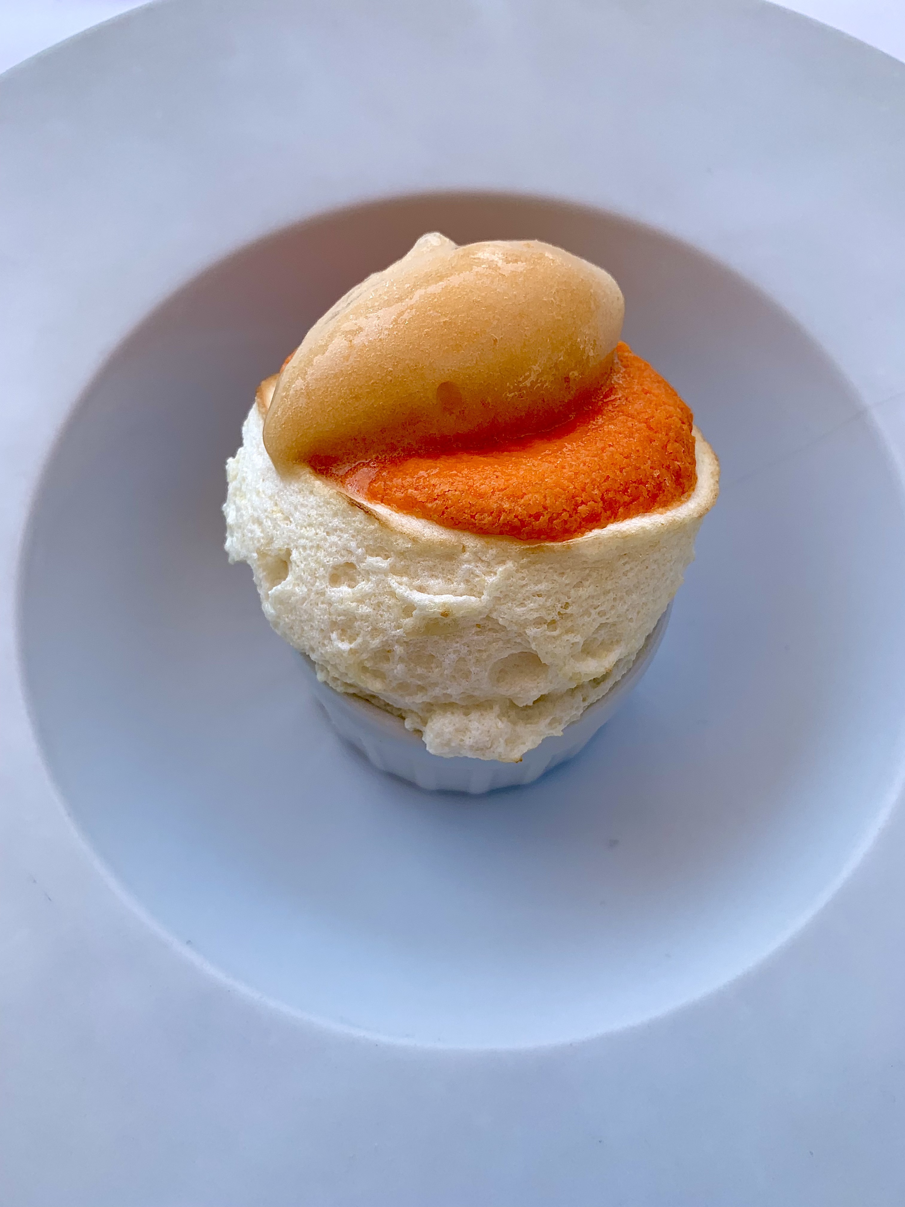 Le Soufflé au Muscat Beaumes de Venise, cardamome, craquelin, melon comme un Sorbet est la délicatesse estivale d’une finale aérienne.